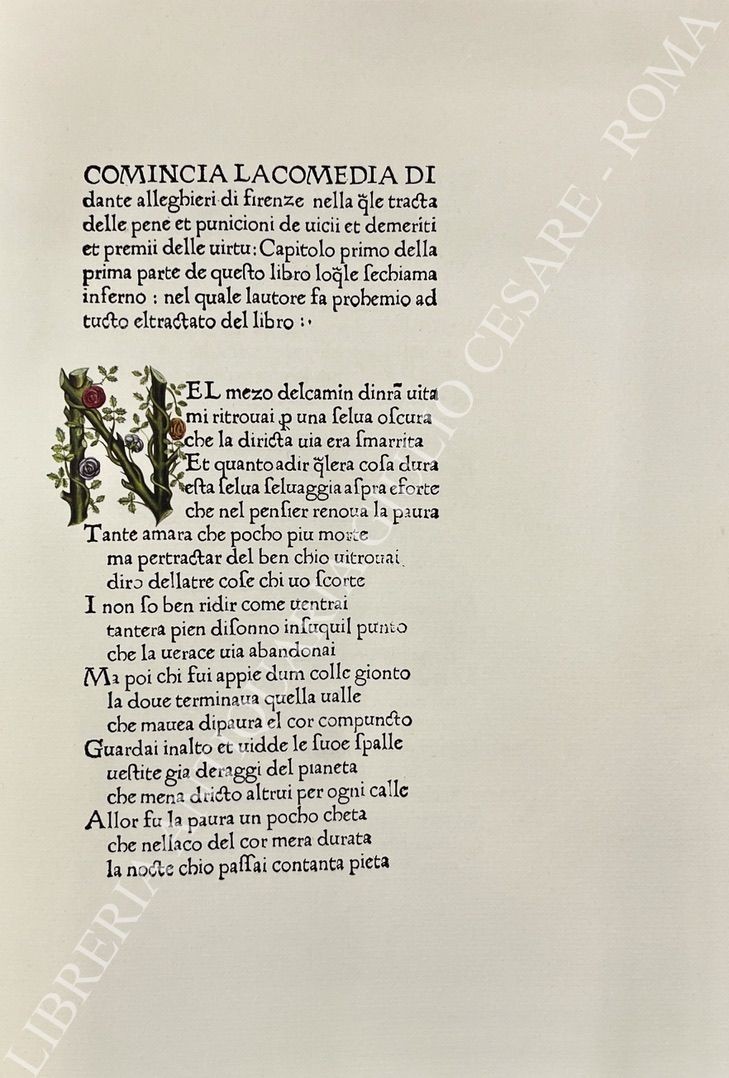 Questa è la riproduzione integrale dell’edizione principe della Commedia che fu stampata a Foligno nel 1472 da Johannes Numeister e dal fulginato (cioè folignate) Evangelista Mei. I caratteri erano stati incisi da Emiliano Orfini, medaglista e zecchiere pontificio; l’incisione nitida e al tempo stesso sensibile ai valori del chiaroscuro dà alle lettere, una per una, una sottile individualità