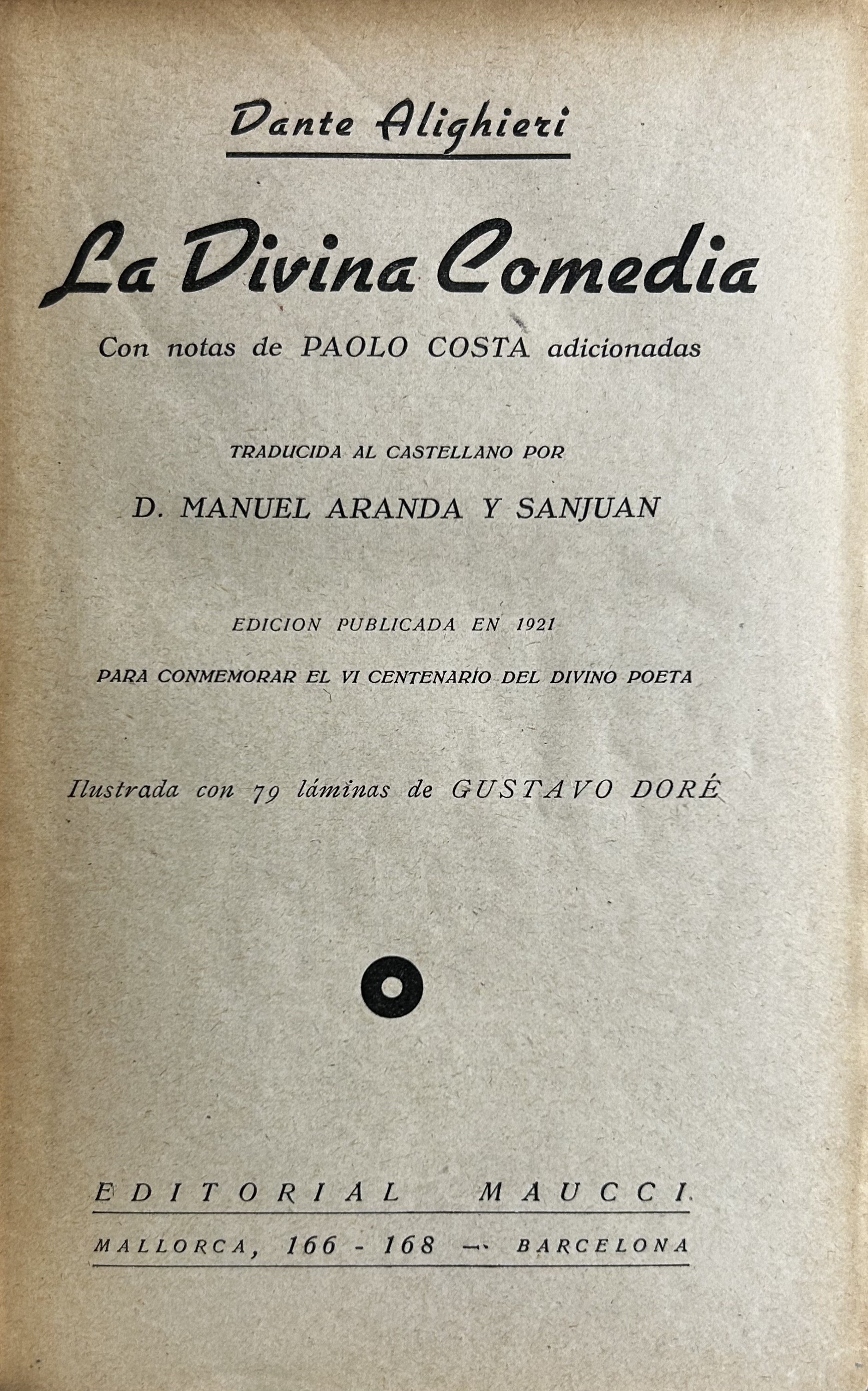 La Divina Comedia. Con notas de Paolo Costa adicionadas. Traducida al castellano por D. Manuel Aranda Y Sanjuan. Edicion publicada en 1921 para commemorar el VI centenario del divino poeta. Illustrada con 79 laminas de Gustavo Doré