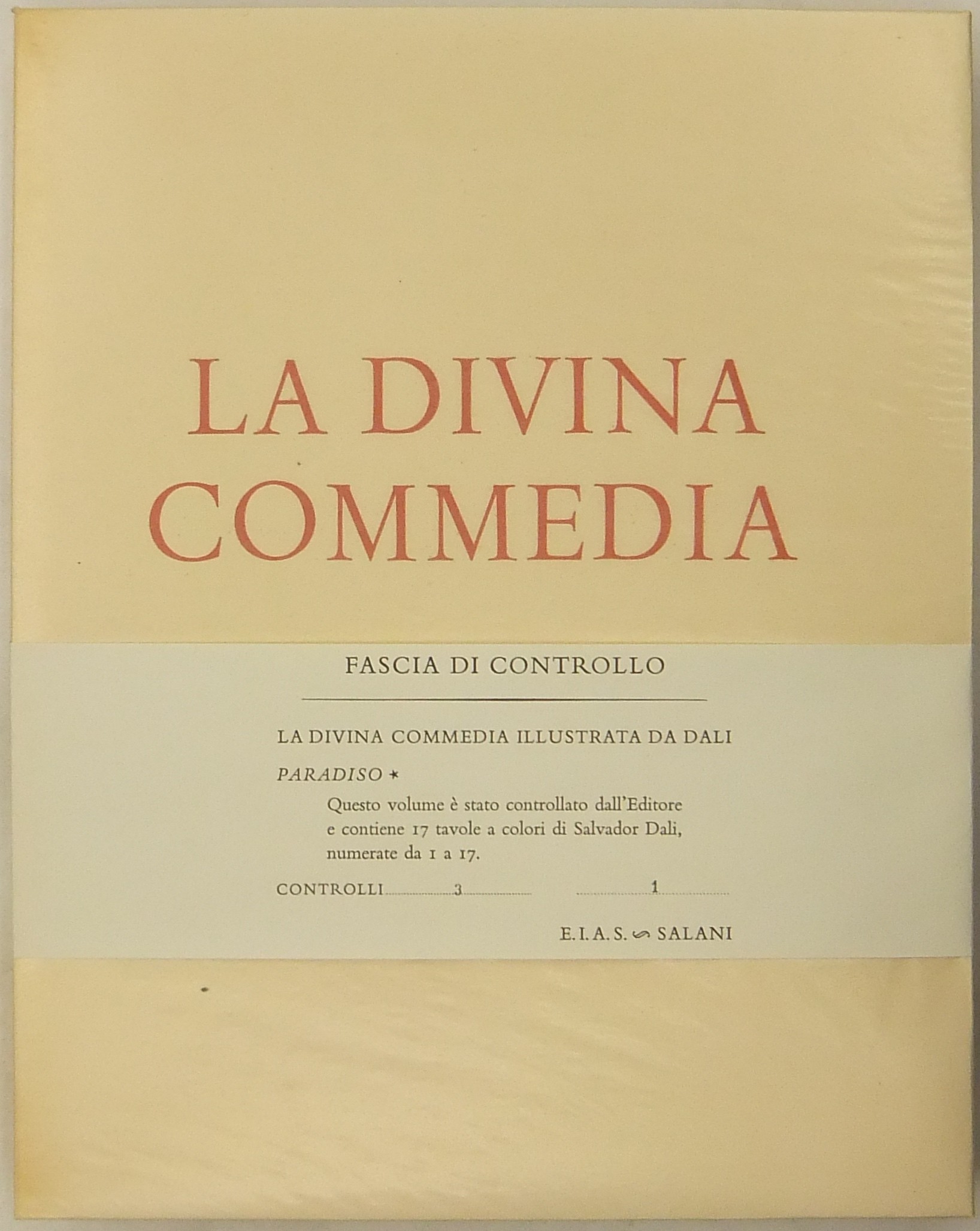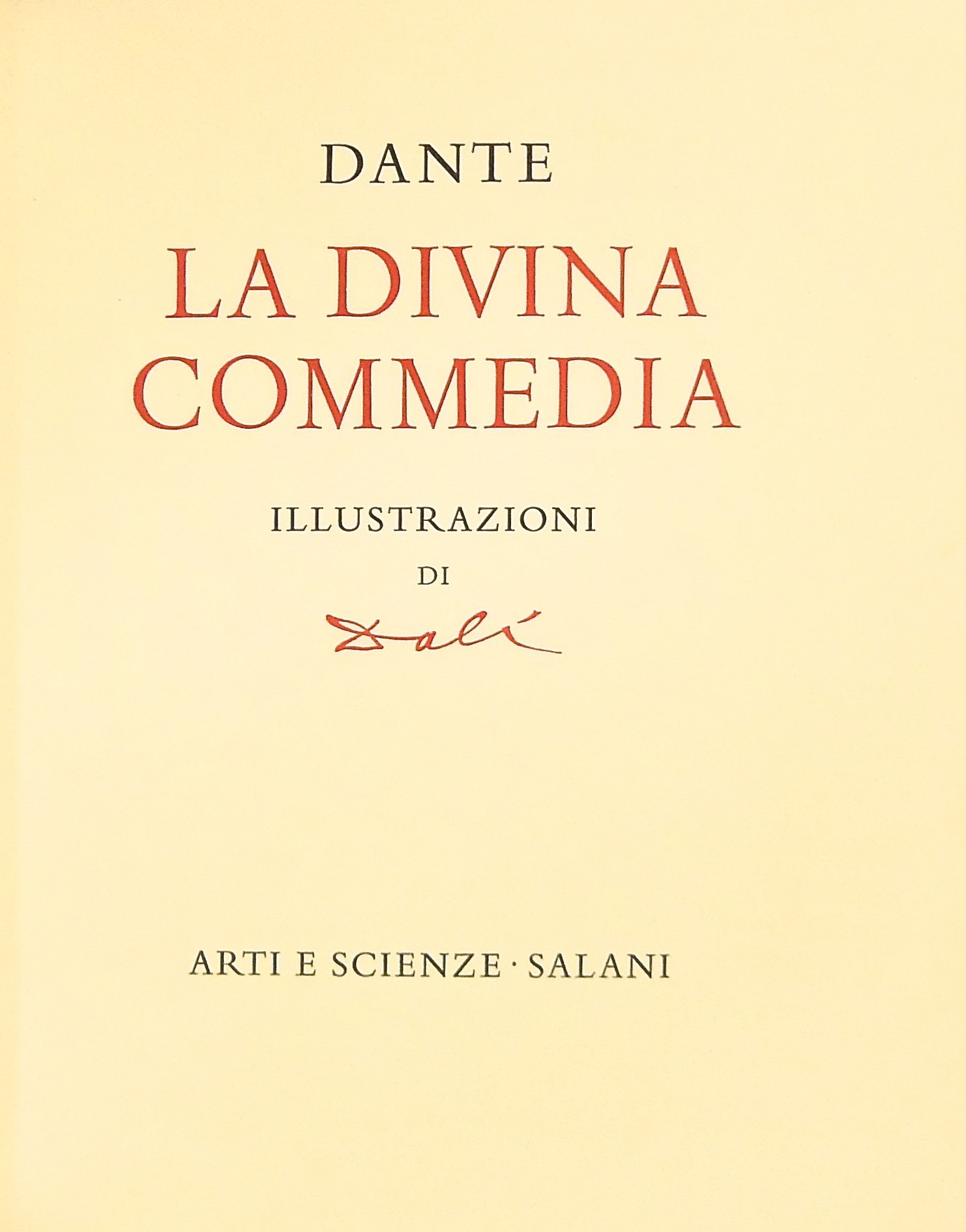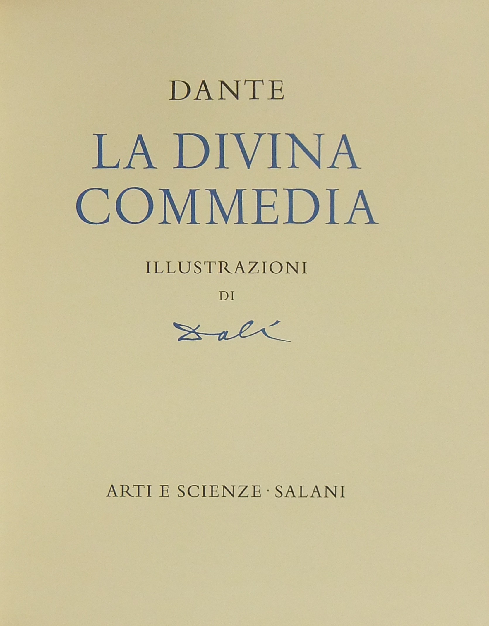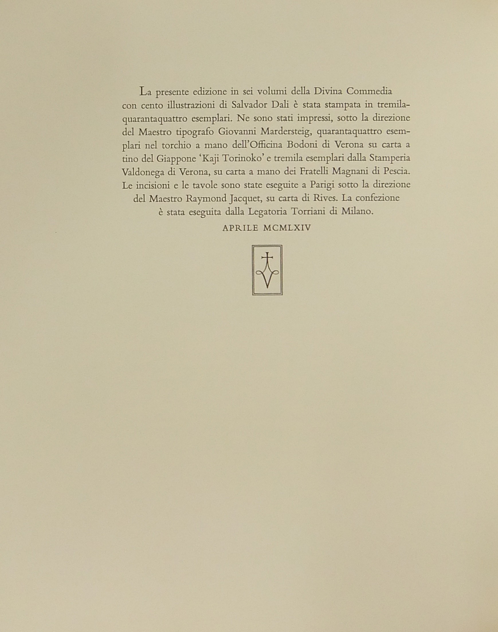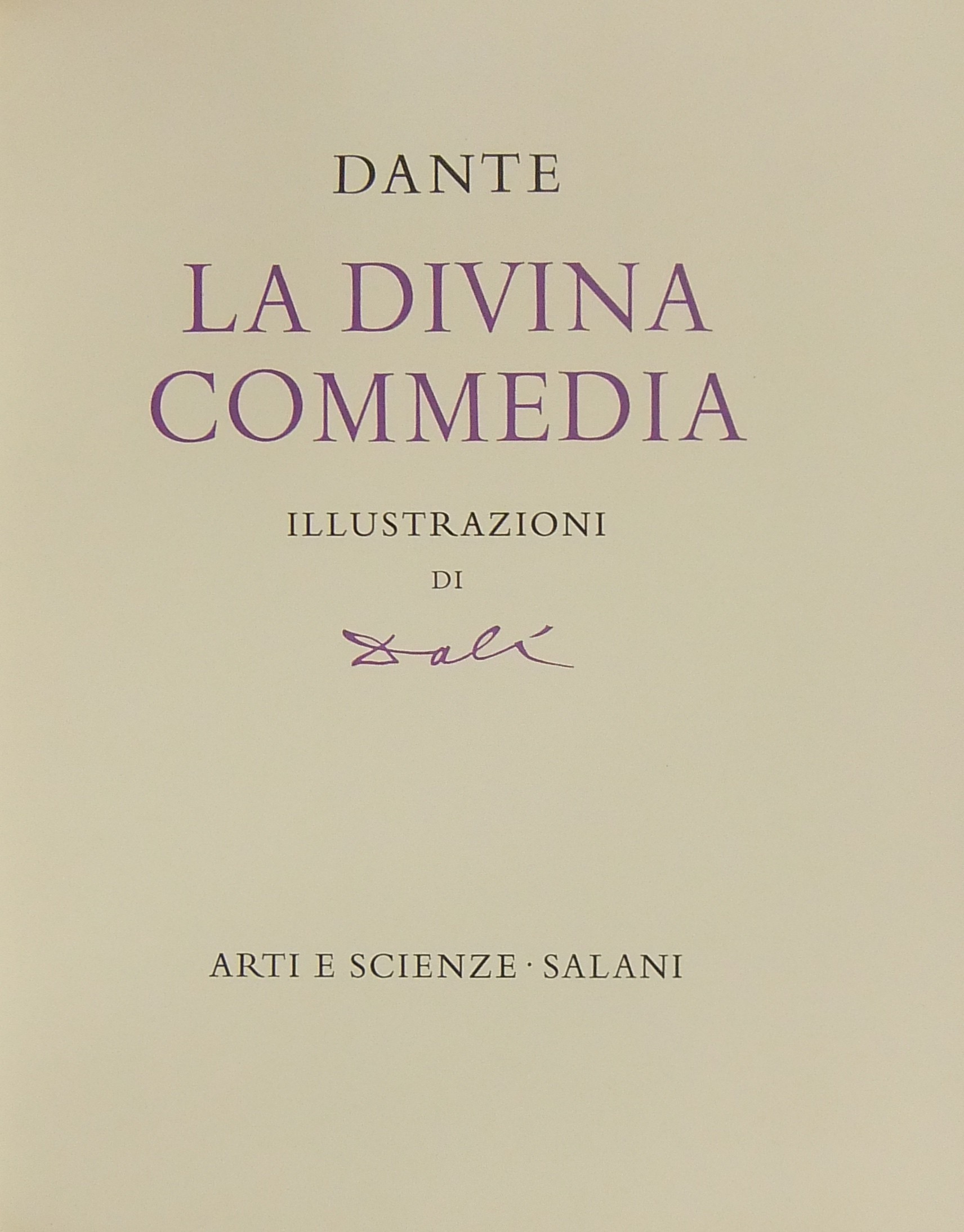 In occasione del 700° anniversario della nascita di Dante venne commissionata a Salvador Dalì l'illustrazione della Divina Commedia. Il Maestro impiegò 9 anni di lavoro per dar vita ai 100 acquarelli che verranno esposti a Parigi e trasposti in xilografia. Il Maestro Raymond Jacquet, sotto la diretta supervisione di Dalì, incise 3000 lastre di legno per imprimere in progressiva i 35 colori di ogni singola tavola su carta Rives. Confezione eseguita dalla Legatoria Torriani di Milano. Ns. esemplare numero 2600. Opera completa in 6 volumi