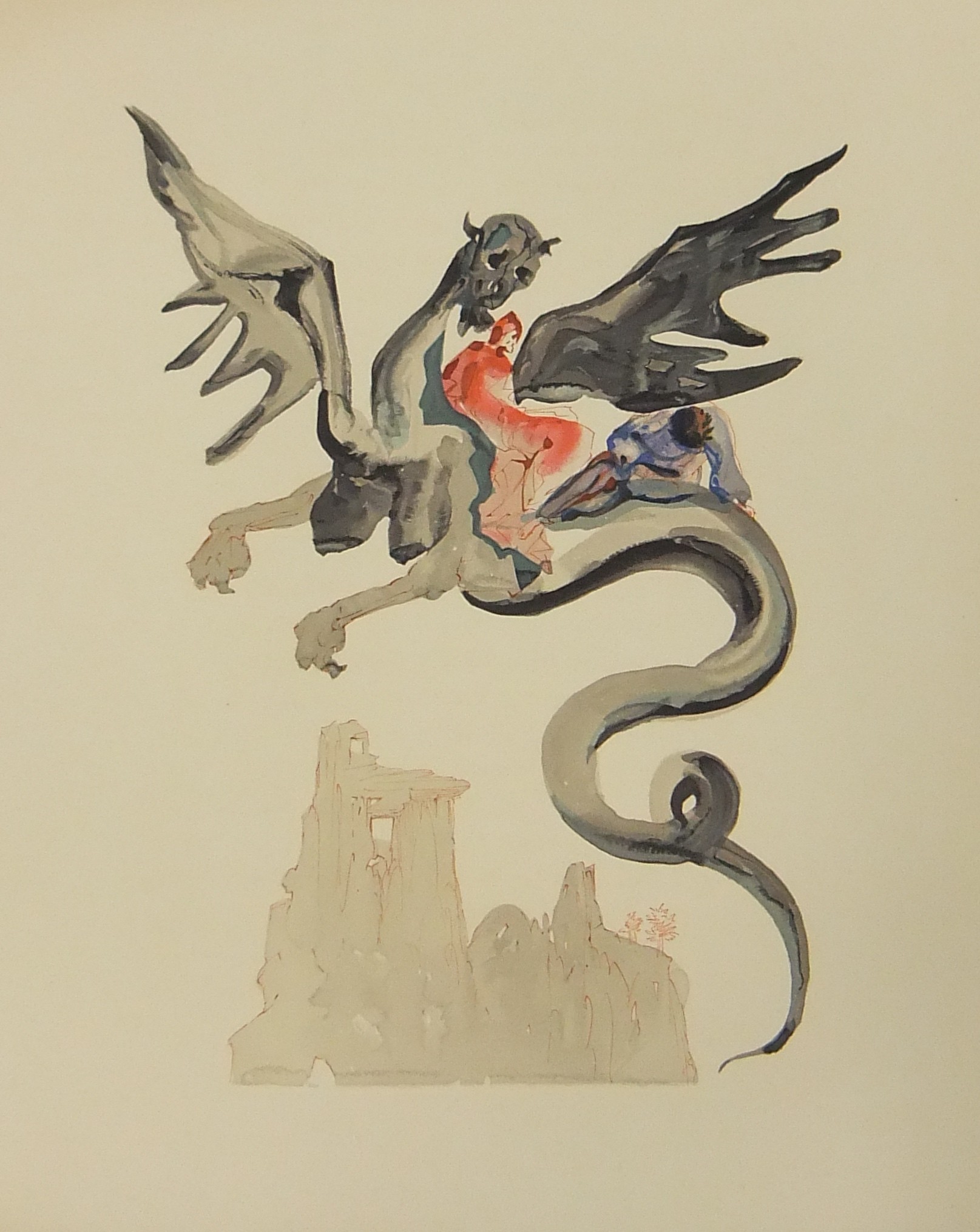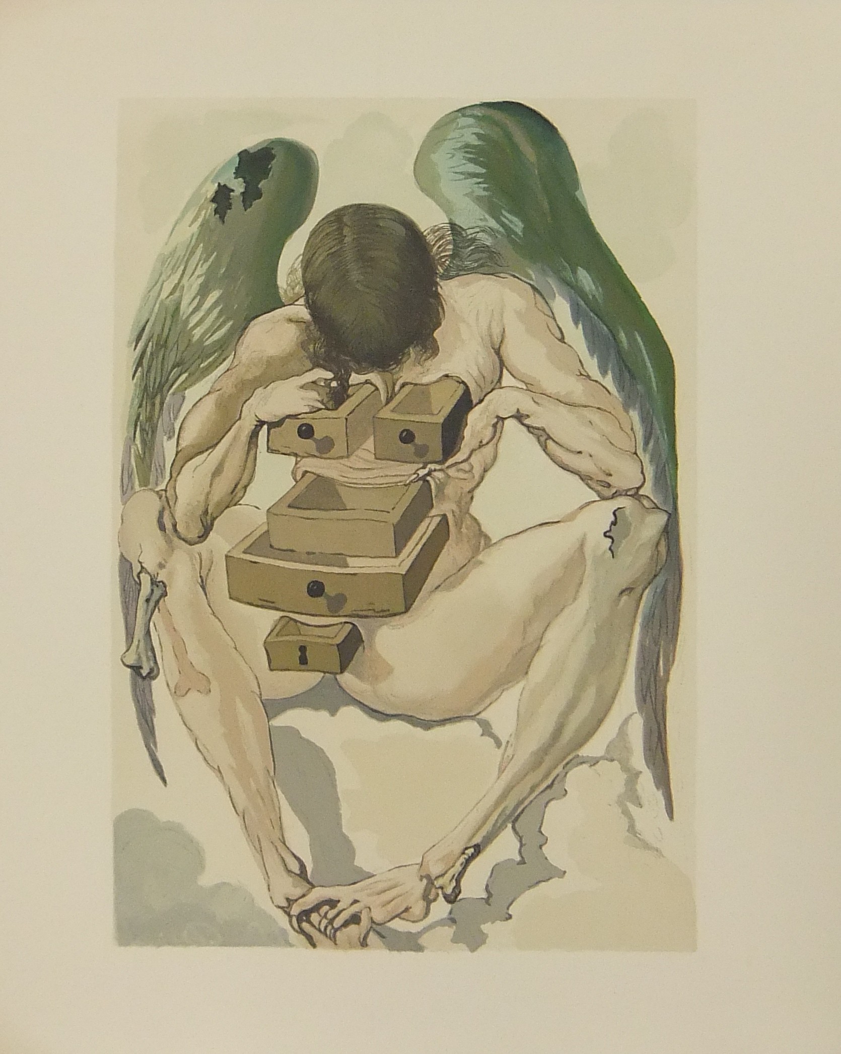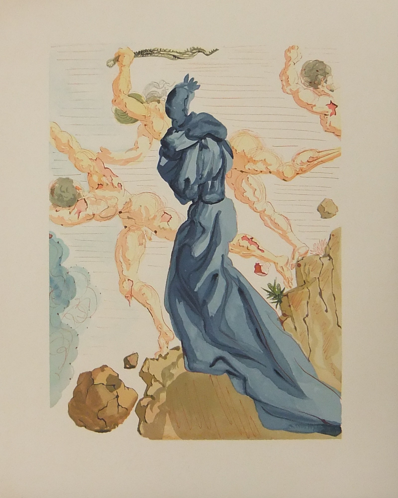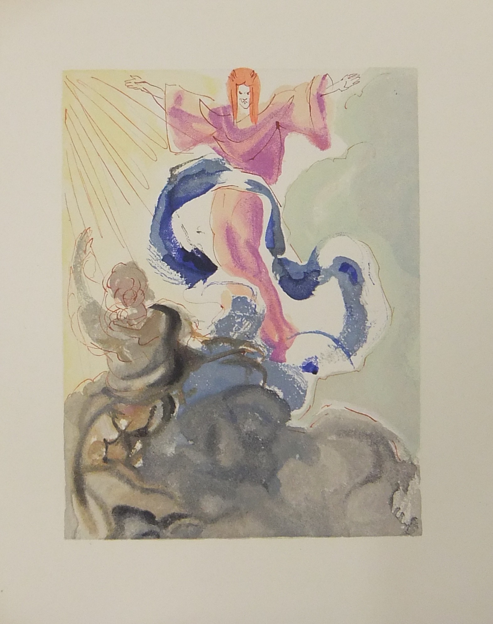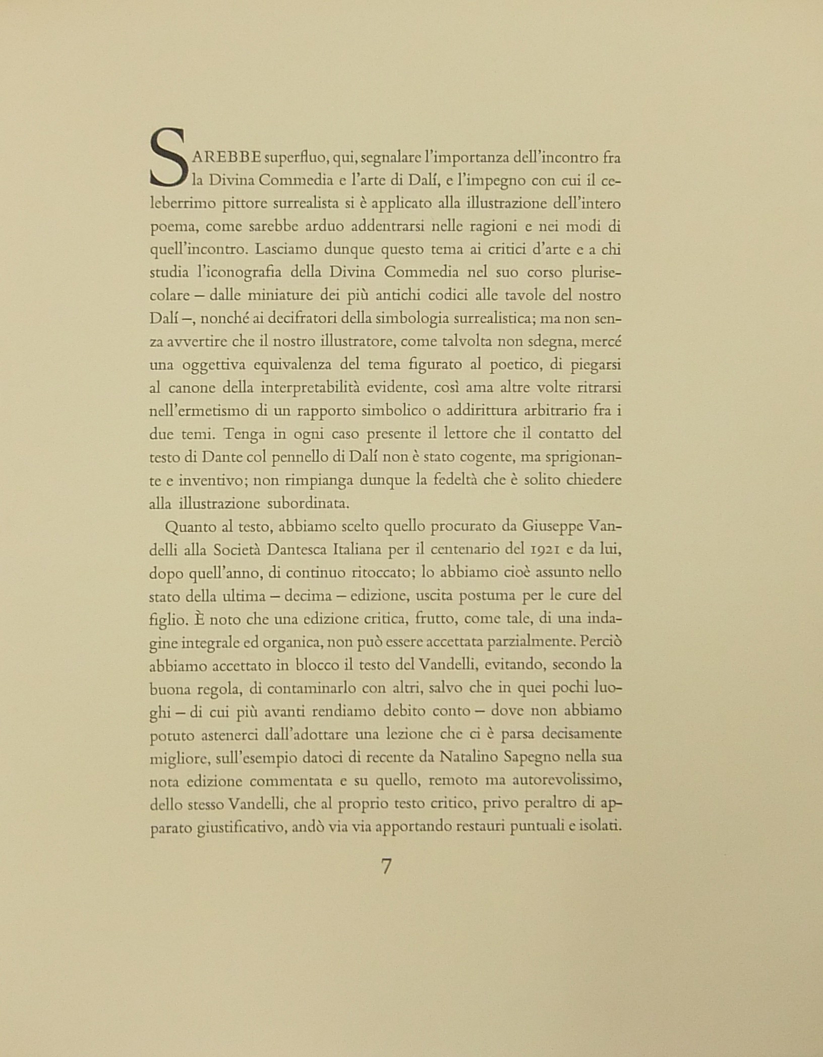 In occasione del 700° anniversario della nascita di Dante venne commissionata a Salvador Dalì l'illustrazione della Divina Commedia. Il Maestro impiegò 9 anni di lavoro per dar vita ai 100 acquarelli che verranno esposti a Parigi e trasposti in xilografia. Il Maestro Raymond Jacquet, sotto la diretta supervisione di Dalì, incise 3000 lastre di legno per imprimere in progressiva i 35 colori di ogni singola tavola su carta Rives. Confezione eseguita dalla Legatoria Torriani di Milano. Ns. esemplare numero 2600. Opera completa in 6 volumi