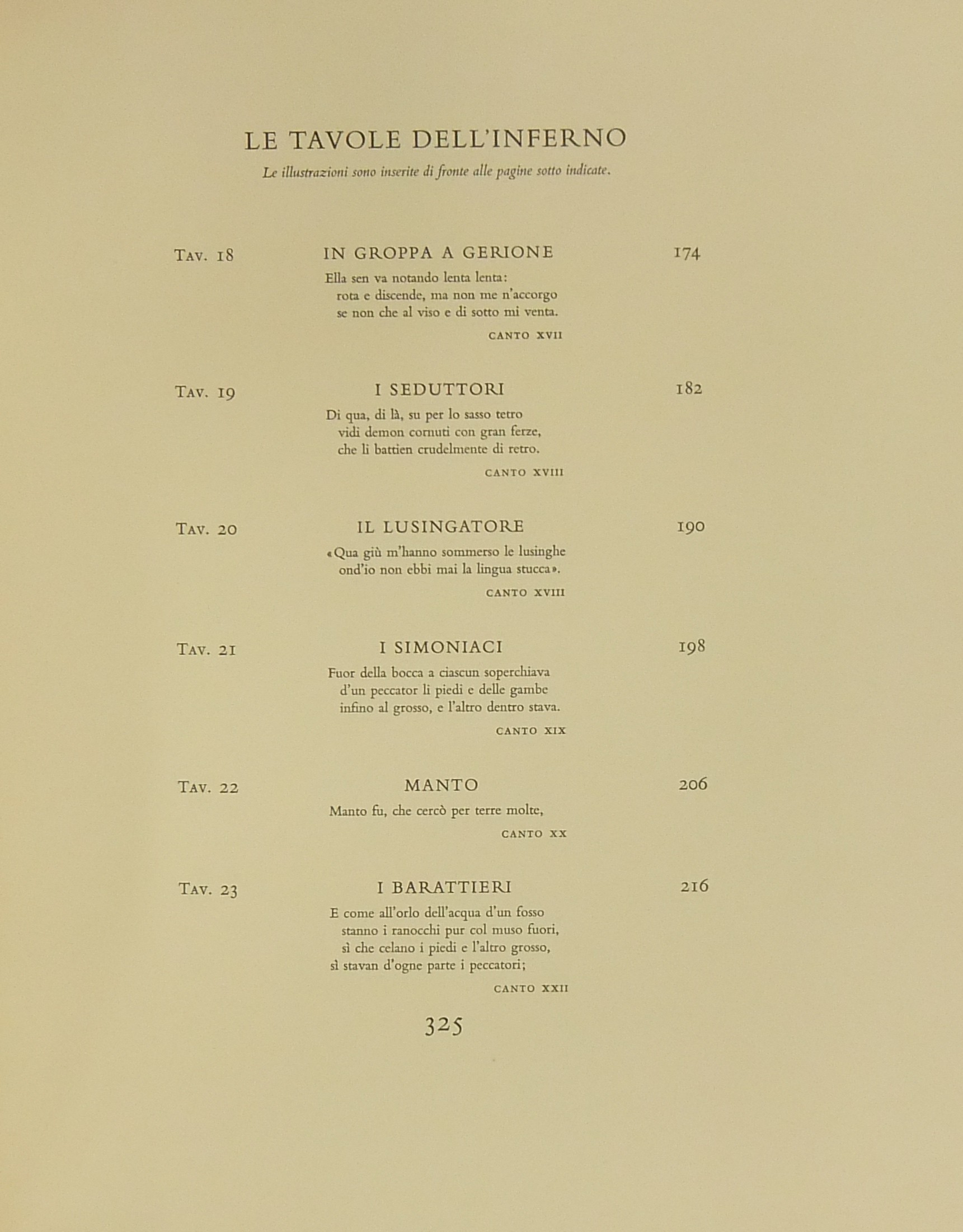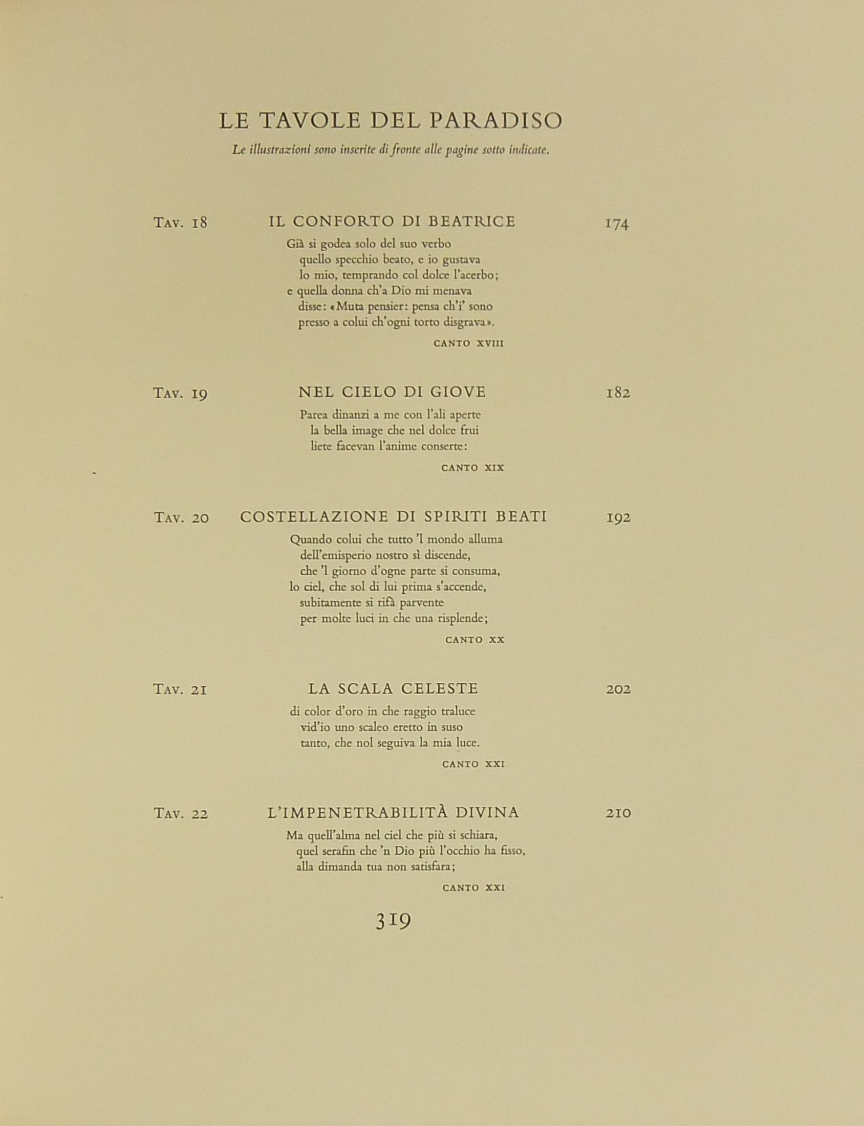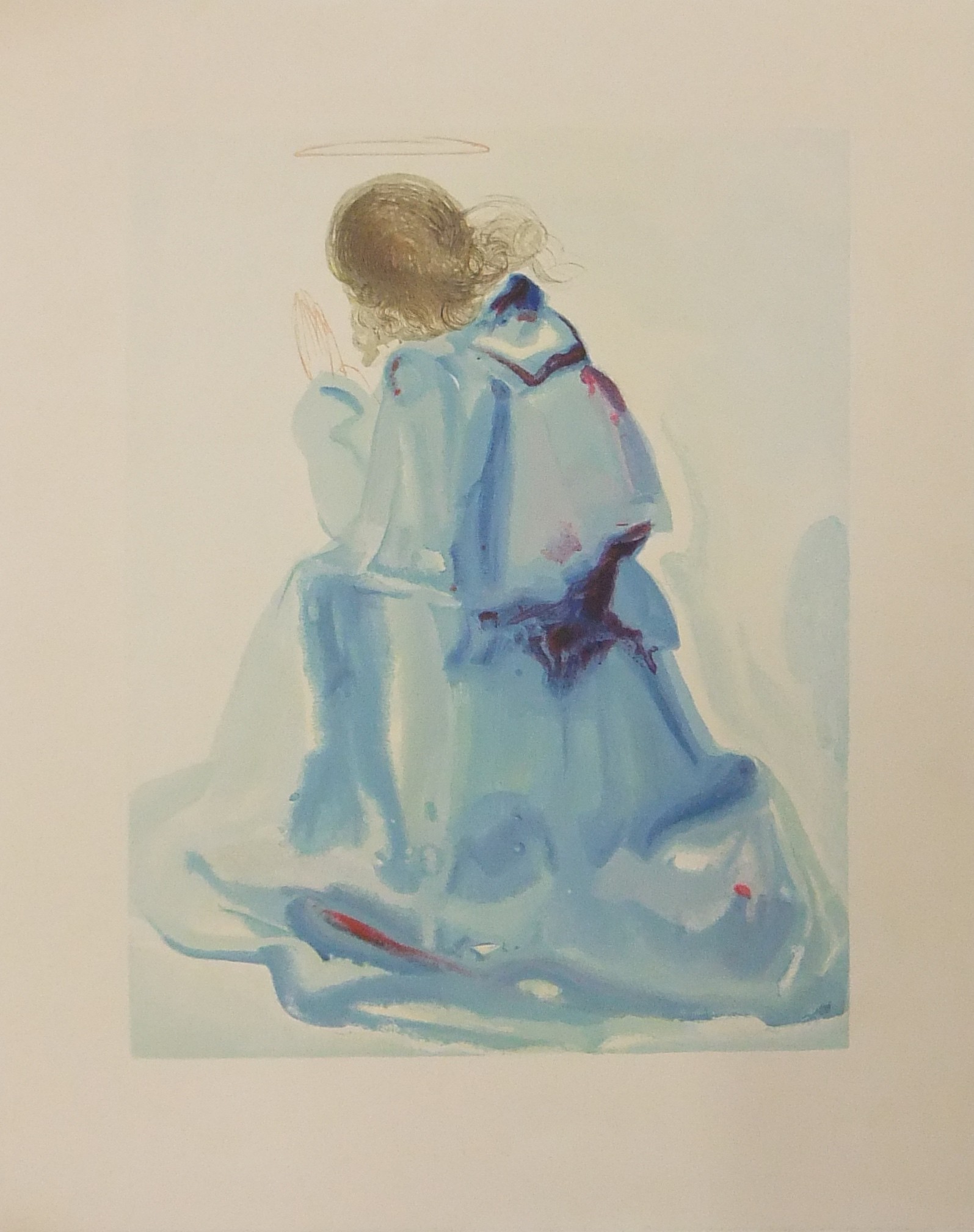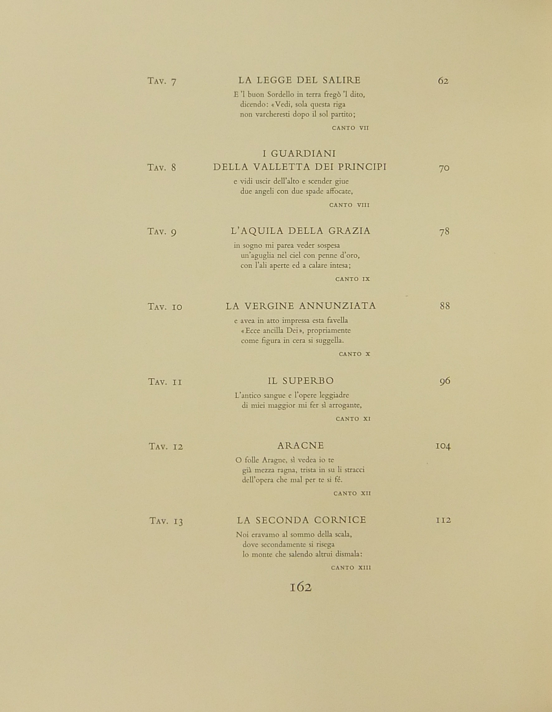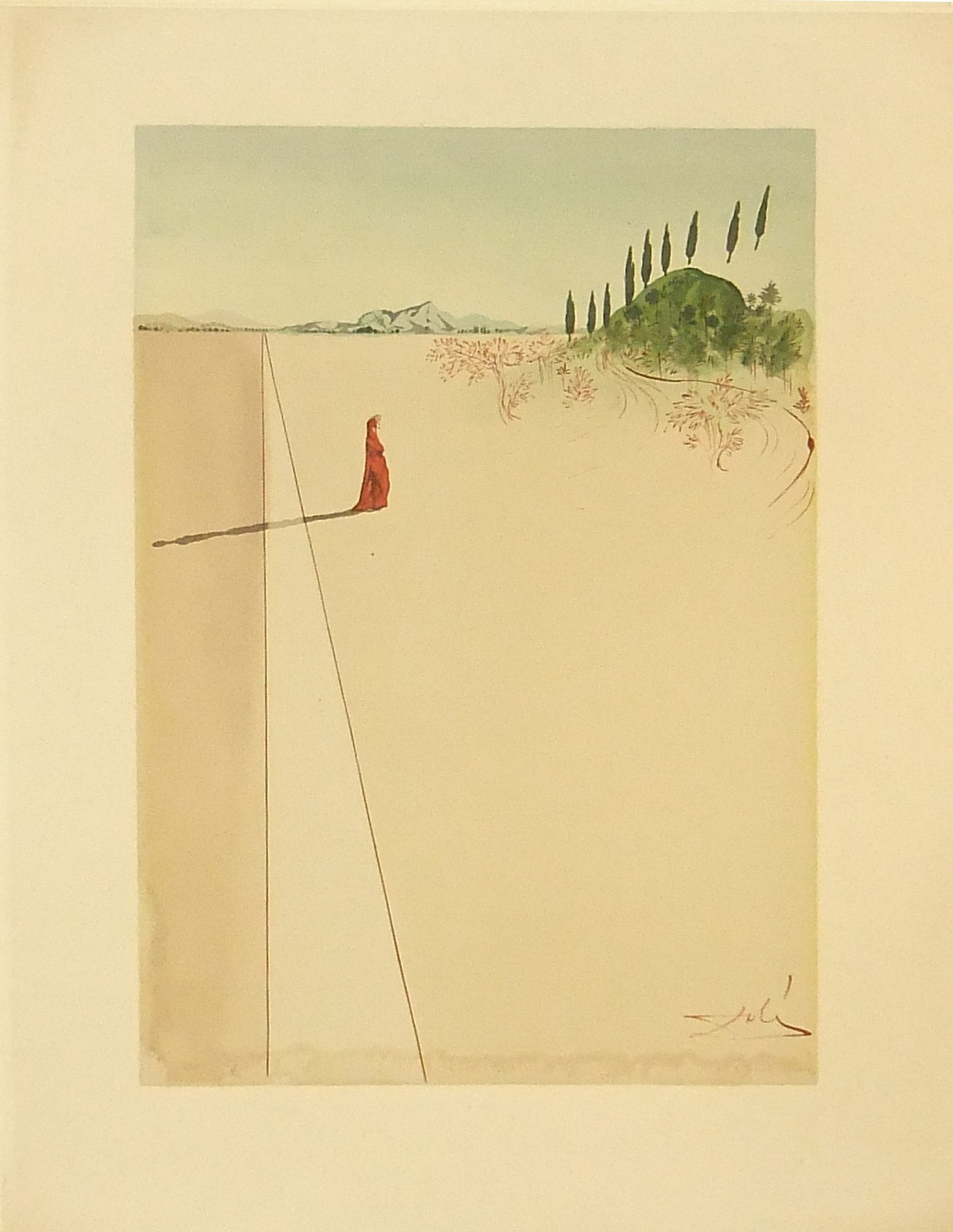 In occasione del 700° anniversario della nascita di Dante venne commissionata a Salvador Dalì l'illustrazione della Divina Commedia. Il Maestro impiegò 9 anni di lavoro per dar vita ai 100 acquarelli che verranno esposti a Parigi e trasposti in xilografia. Il Maestro Raymond Jacquet, sotto la diretta supervisione di Dalì, incise 3000 lastre di legno per imprimere in progressiva i 35 colori di ogni singola tavola su carta Rives. Confezione eseguita dalla Legatoria Torriani di Milano. Ns. esemplare numero 2600. Opera completa in 6 volumi