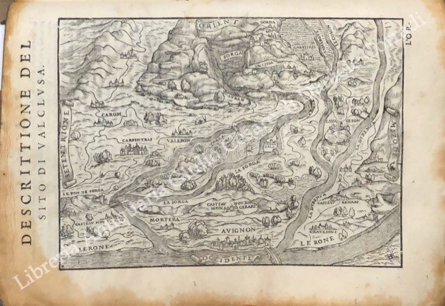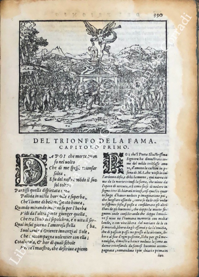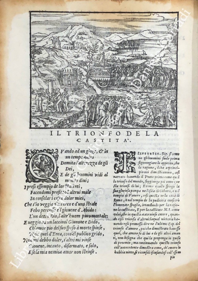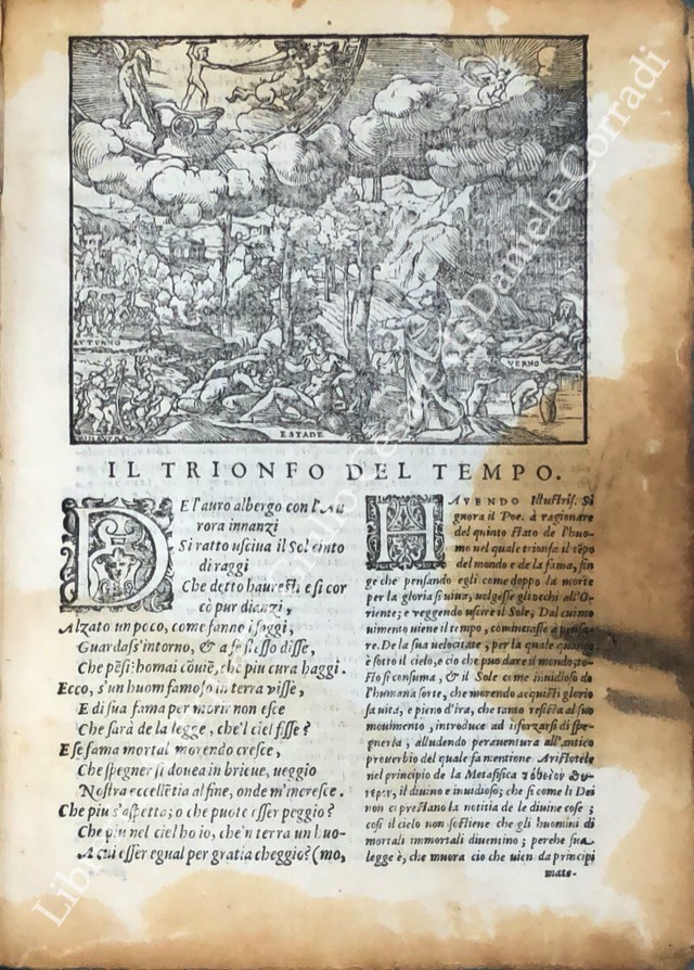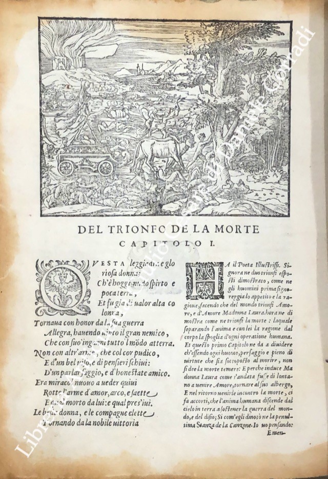 Al frontespizio xilografia raffigurante una donna alata che suona la tromba con il piede poggiato sul globo, (motto: “Io volo al ciel per riposarmi in Dio”). Tavola “Descrittione del sito di Valclusa”, Ritratto di Petrarca e Laura, sei xilografie all’apertura di ogni “Trionfo”. Capilettera, testatine e finalini incisi