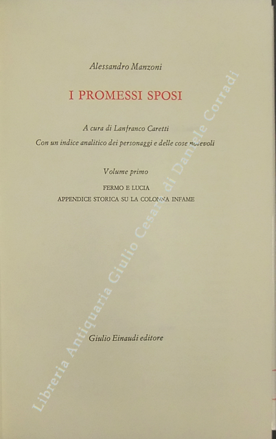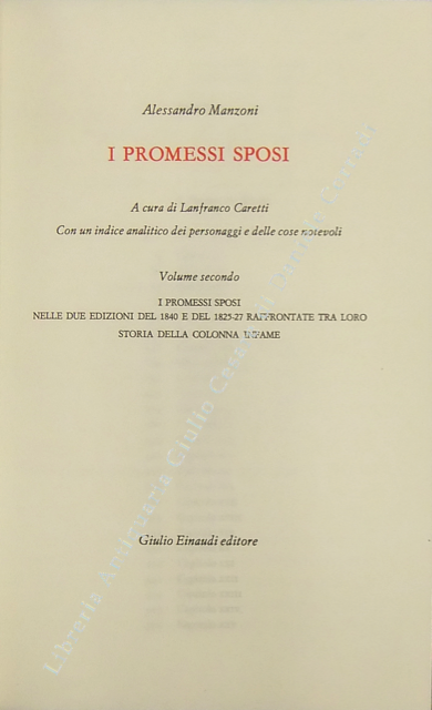 I Promessi Sposi. A cura di Lanfranco Caretti. Con un indice analitico dei personaggi e delle cose notevoli. Vol. I - Fermo e Lucia. Appendice storica su la colonna infame. Vol. II - I promessi sposi. Nelle due edizioni del 1840 e del 1825-27 raffrontate tra loro. Storia della colonna infame
