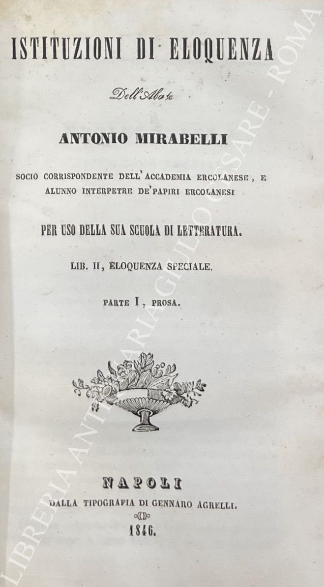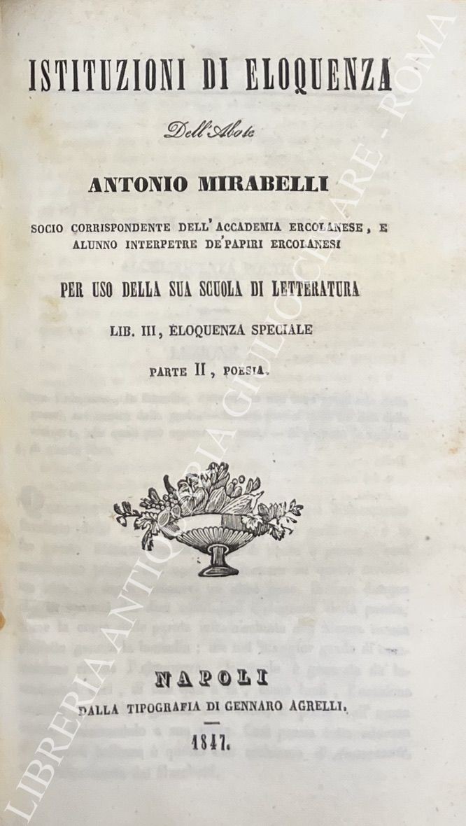 Istituzioni di eloquenza dell'Abate Antonio Mirabelli socio corrispondente dell'accademia ercolanese, e alunno interpetre de papiri ercolanesi per uso della sua scuola di letteratura. Lib. I, eloquenza generale