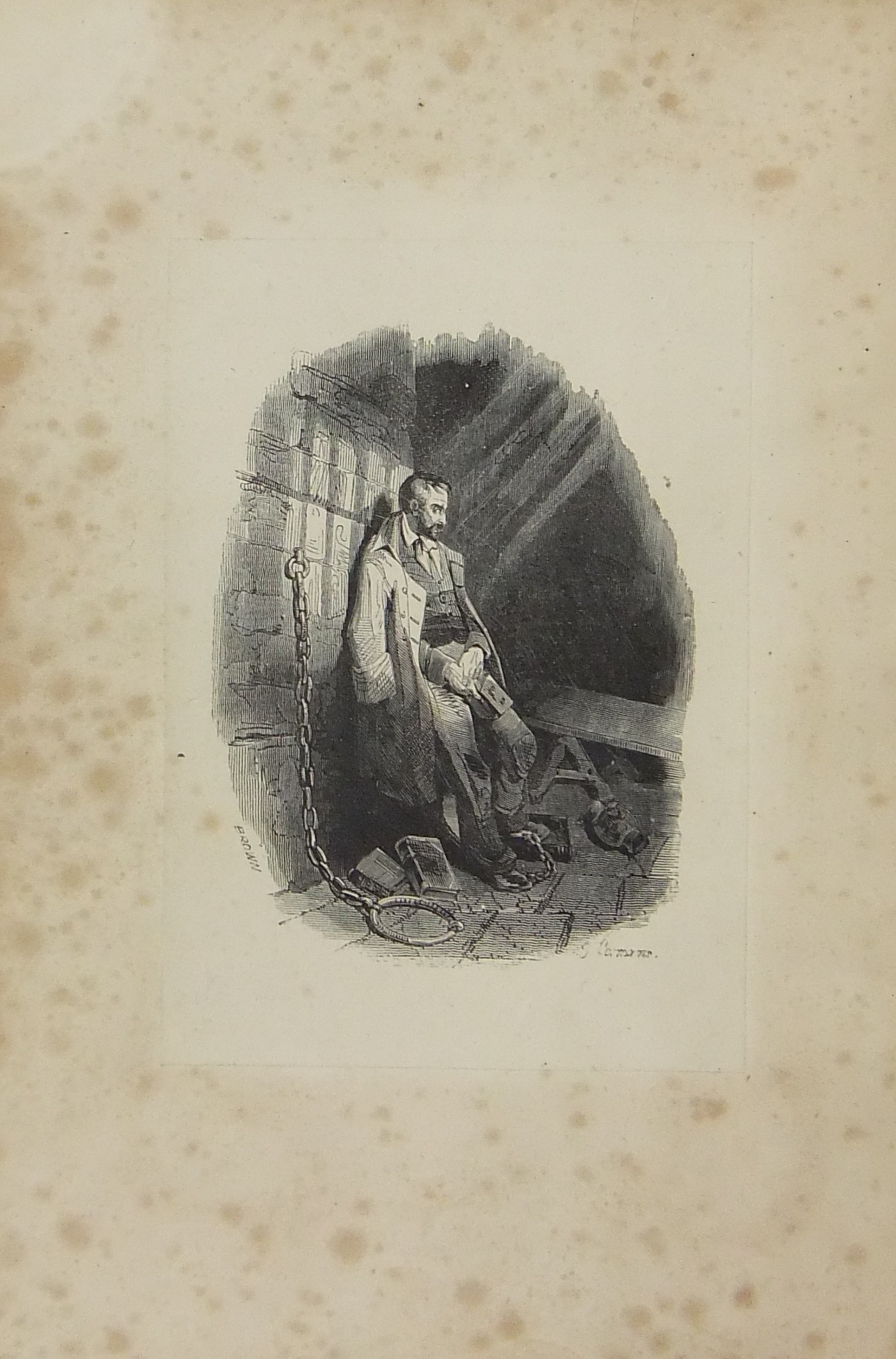 Bel frontespizio con cornice incisa illustrante le varie fasi della prigionia di Pellico. Tavola al controfrontespizio raffigurante l'Autore in catene con in mano un libro.