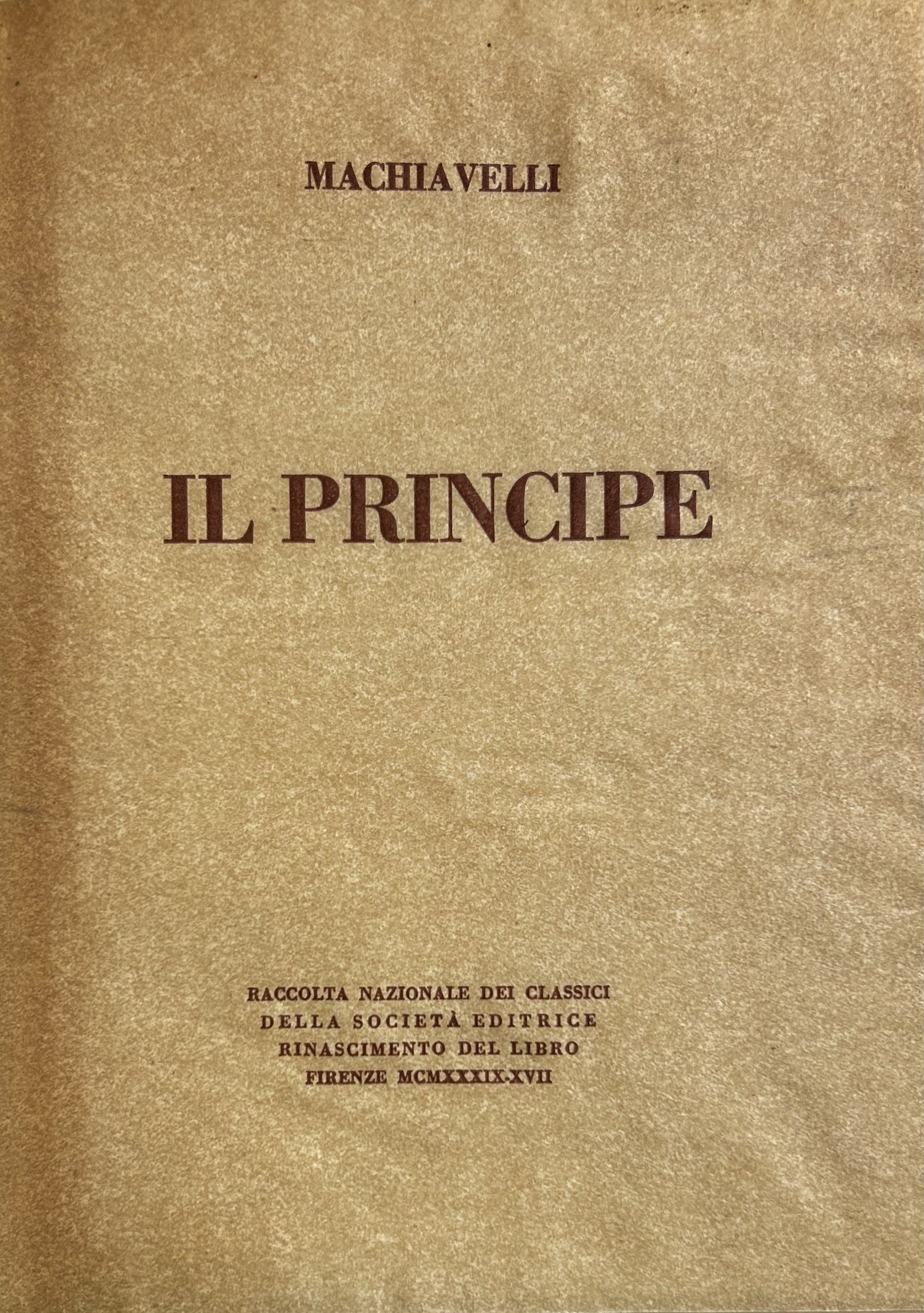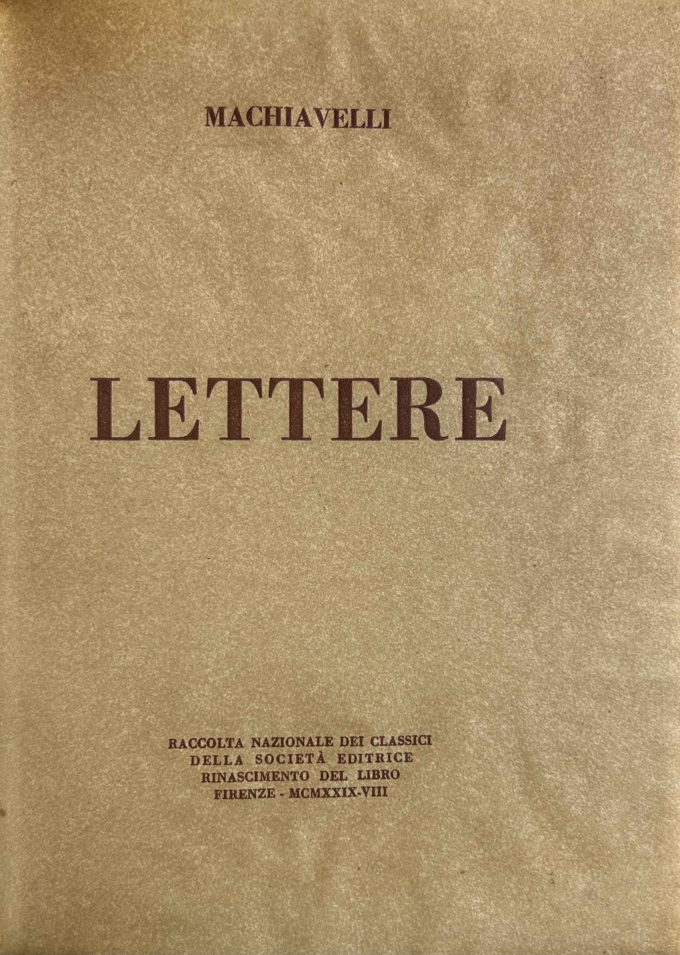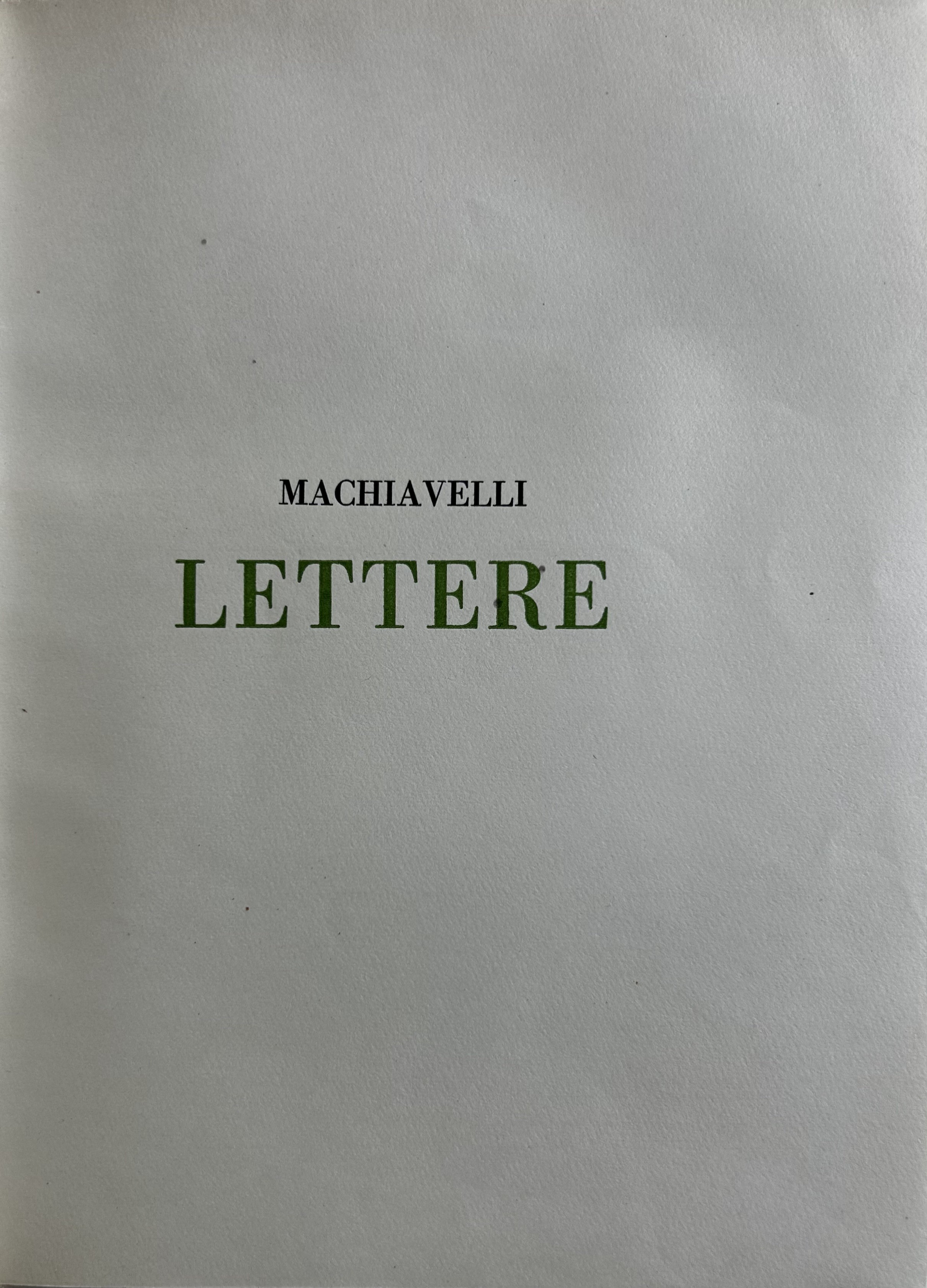 Questi 2 volumi fanno parte dei “Classici”, composti a mano coi caratteri di G.B. Bodoni. Il Principe in 1000 esemplari numerati, sotto la direzione di Guglielmo Vita (Nostro esemplare n. 414); Le Lettere in 1500 esemplari, sotto la direzione di Enrico Barfucci (Nostro esemplare n. 1433)