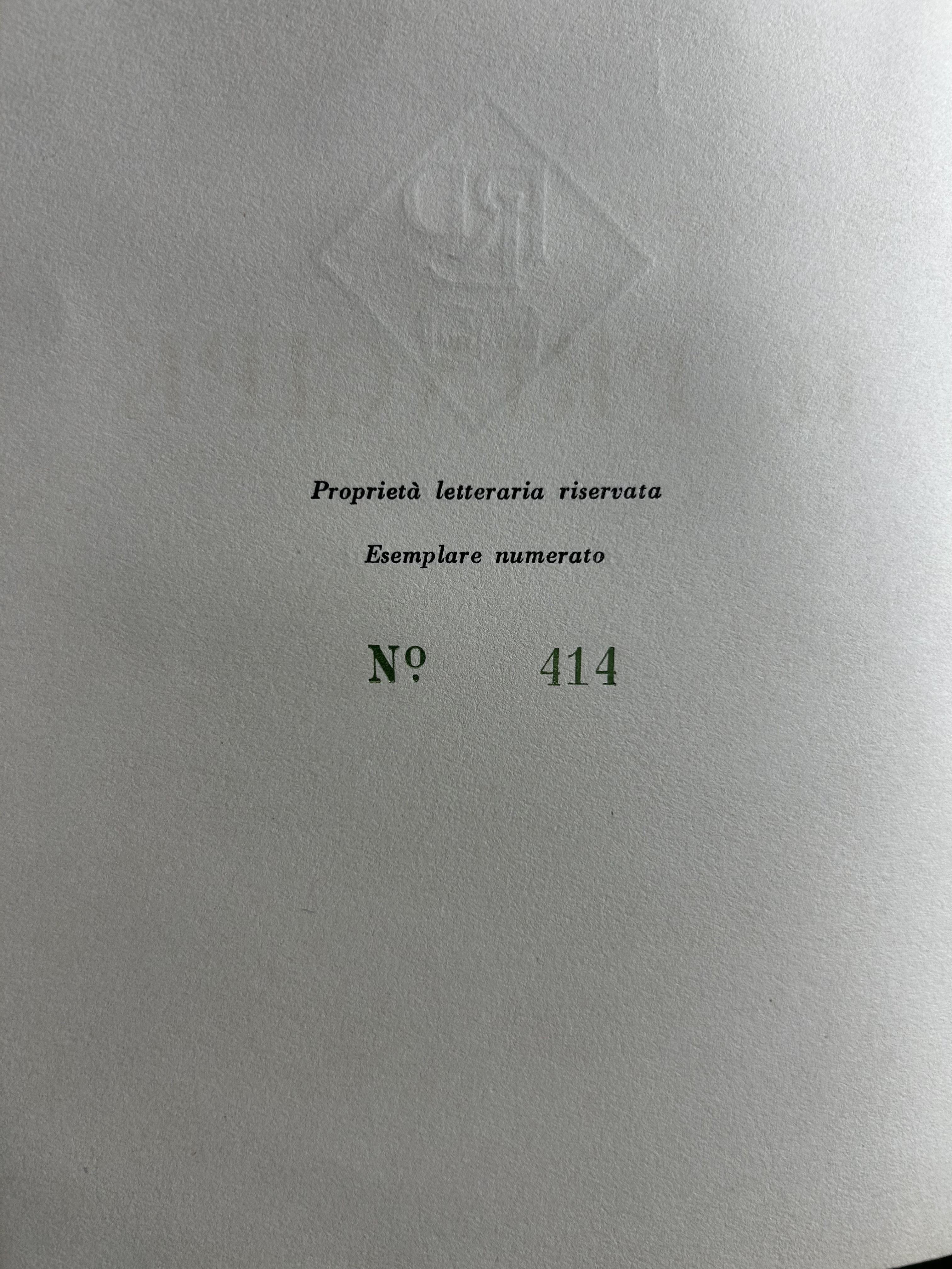 Questi 2 volumi fanno parte dei "Classici", composti a mano coi caratteri di G.B. Bodoni. Il Principe in 1000 esemplari numerati, sotto la direzione di Guglielmo Vita (Nostro esemplare n. 414); Le Lettere in 1500 esemplari, sotto la direzione di Enrico Barfucci (Nostro esemplare n. 1433)