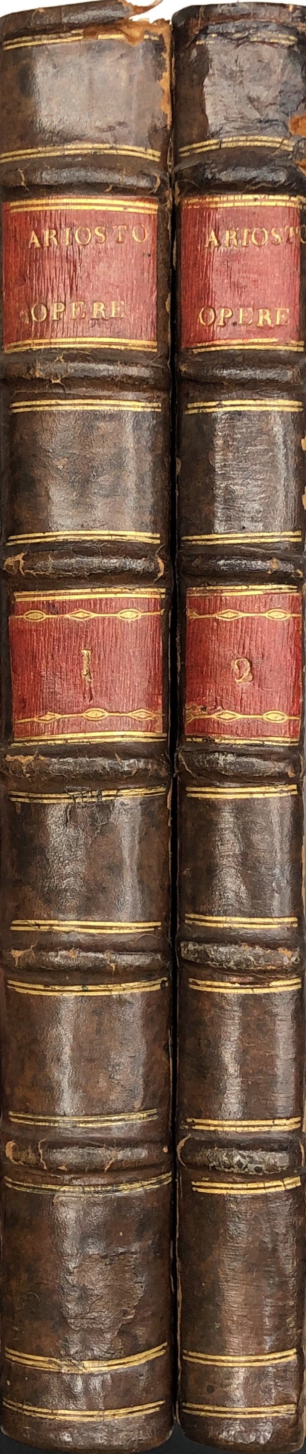 Doppio frontespizio finemente inciso: Primo frontespizio delle "Opere" e secondo in bicromo con marca editoriale raffigurante un fuoco che scaccia le api dall'arnia, con motto "Pro bono malum". Il secondo volume contiene un altro frontespizio interamente inciso da Giuseppe Filosi; Ritratto dell'Ariosto a inizio opera inciso da Carlo Orsolini. Magnifica edizione settecentesca in-folio dell'Orlando furioso e di tutte le restanti opere di Ariosto, preziosa per accuratezza testuale. Testatine e finalini incisi. Presente anche il frontespizio relativo alle commedie