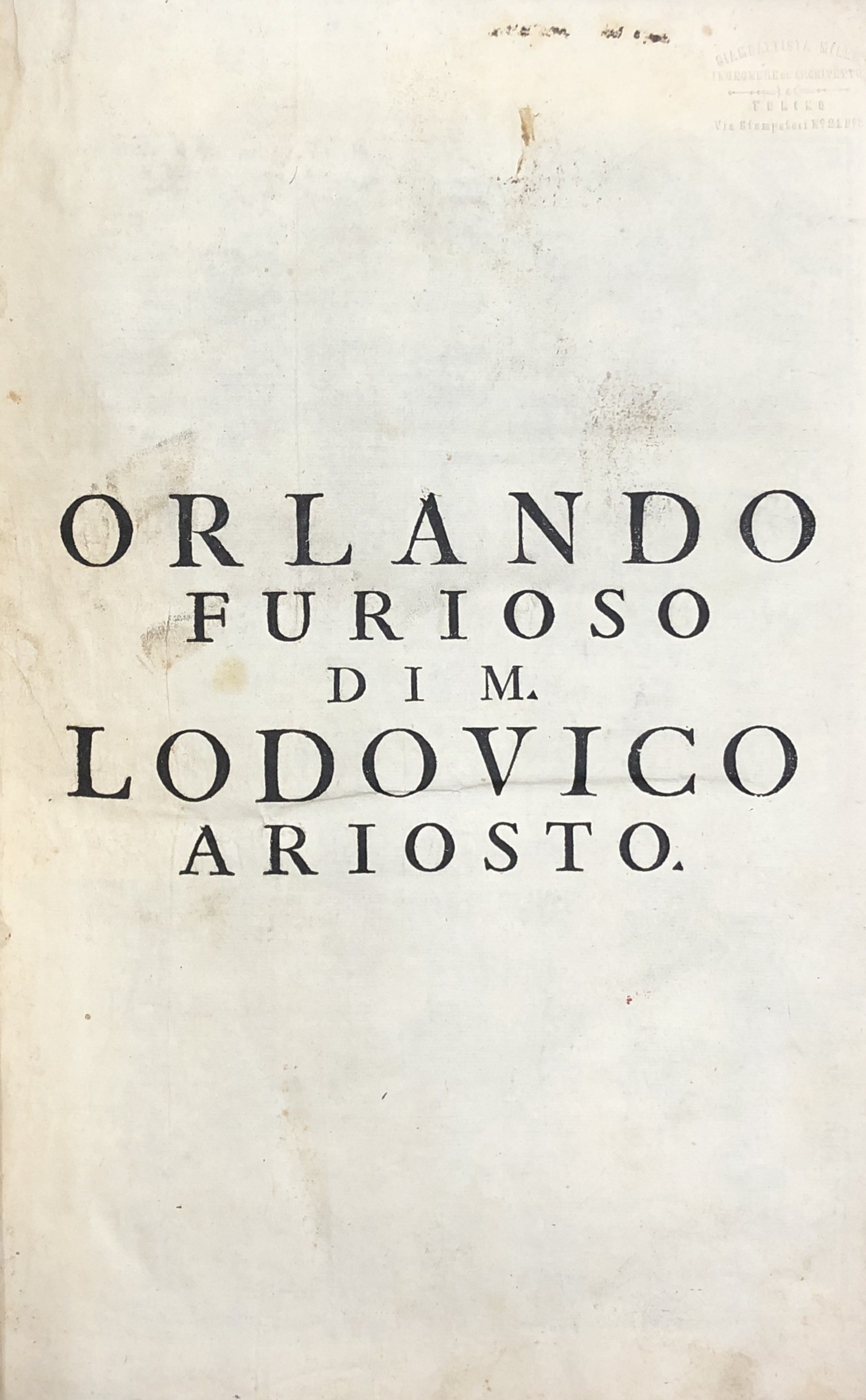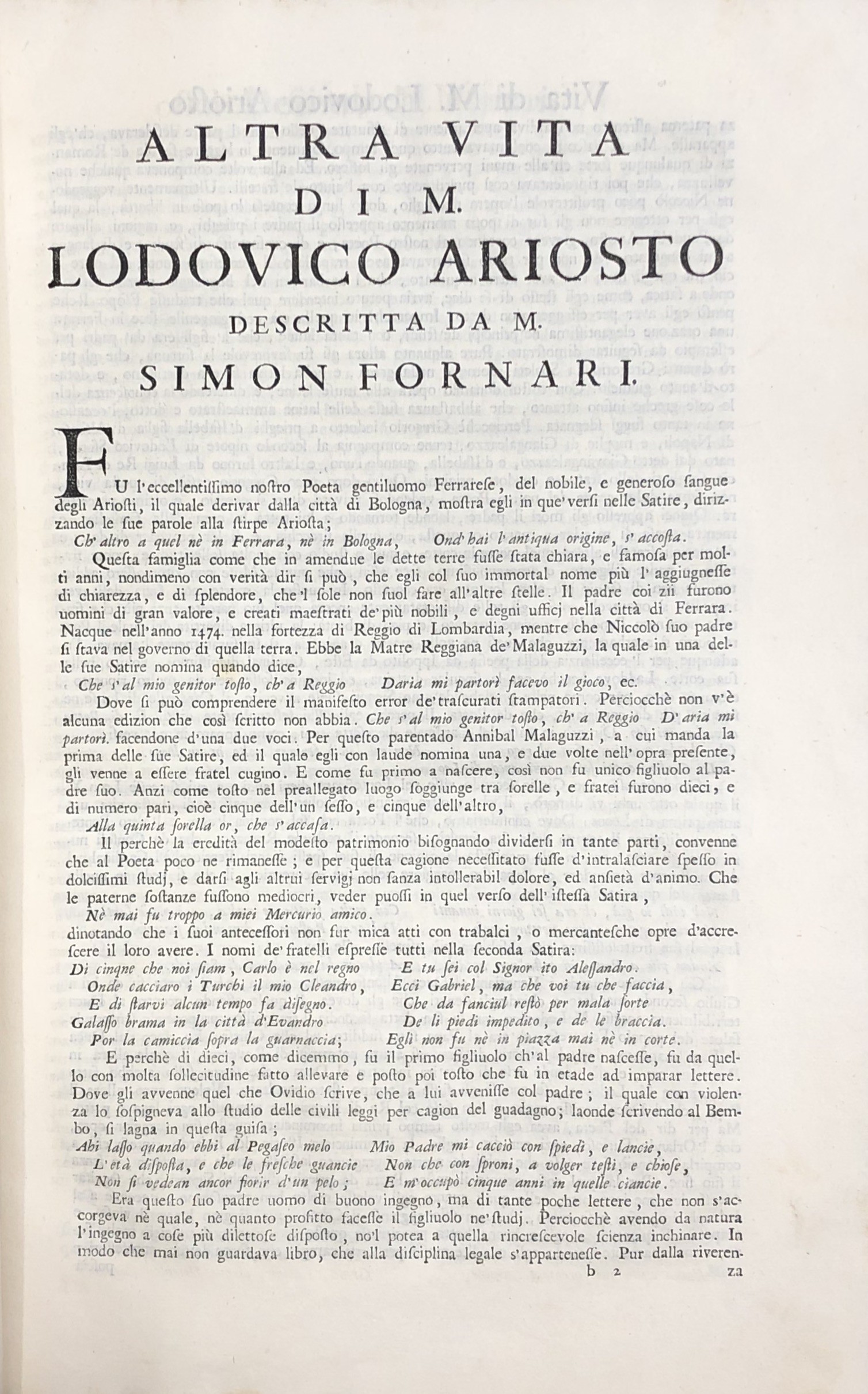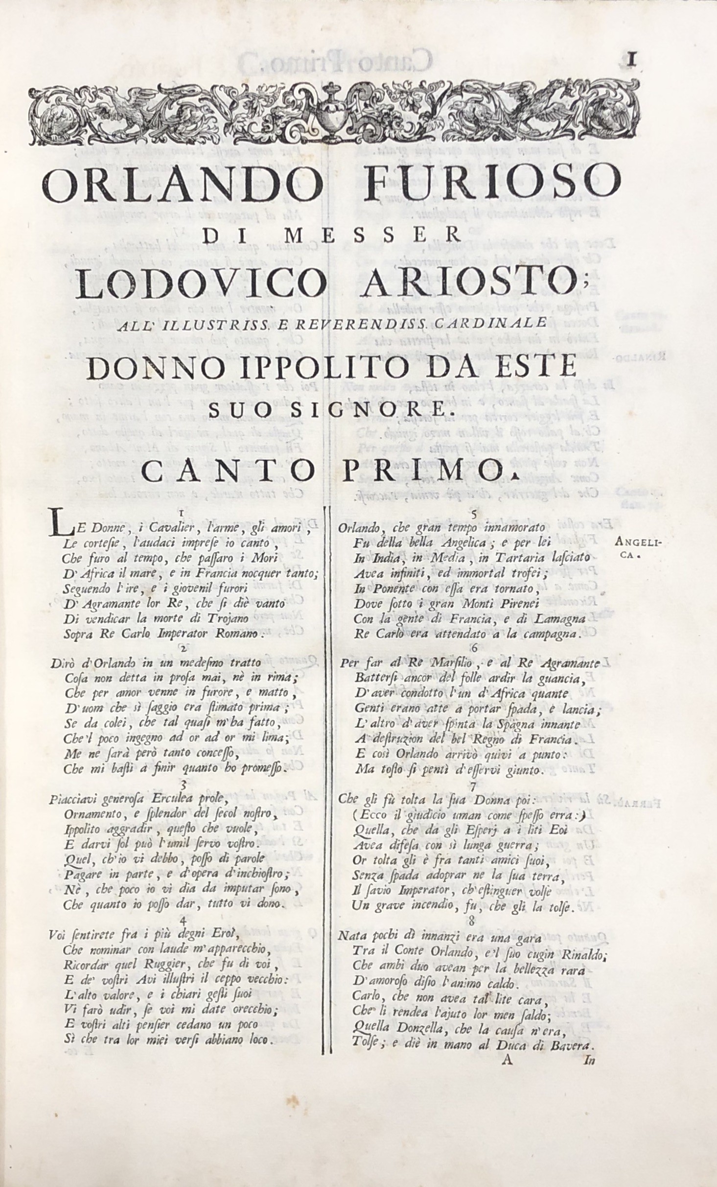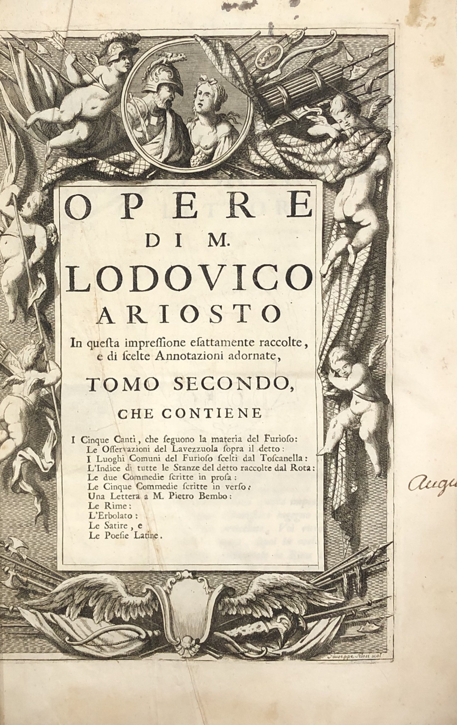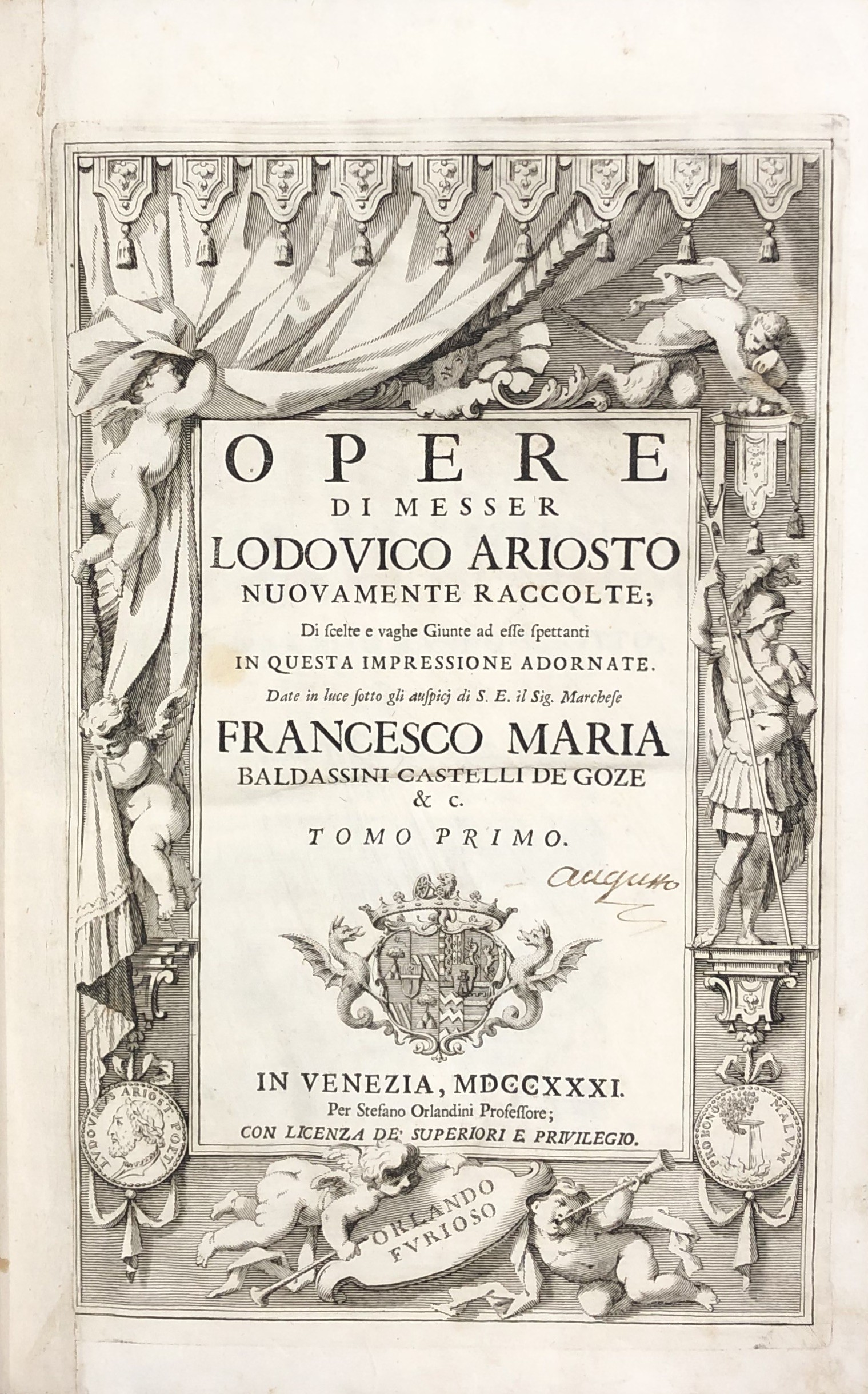 Doppio frontespizio finemente inciso: Primo frontespizio delle “Opere” e secondo in bicromo con marca editoriale raffigurante un fuoco che scaccia le api dall’arnia, con motto “Pro bono malum”. Il secondo volume contiene un altro frontespizio interamente inciso da Giuseppe Filosi; Ritratto dell’Ariosto a inizio opera inciso da Carlo Orsolini. Magnifica edizione settecentesca in-folio dell’Orlando furioso e di tutte le restanti opere di Ariosto, preziosa per accuratezza testuale. Testatine e finalini incisi. Presente anche il frontespizio relativo alle commedie
