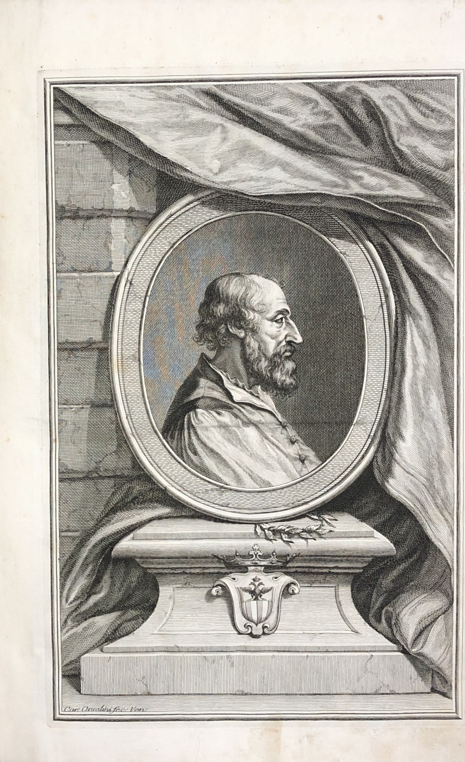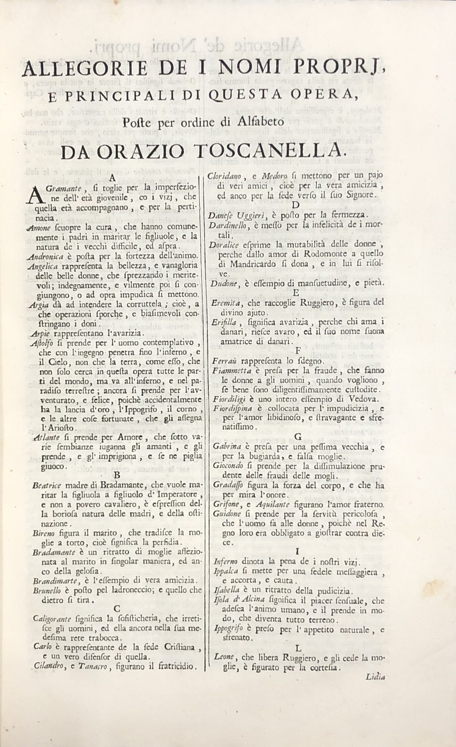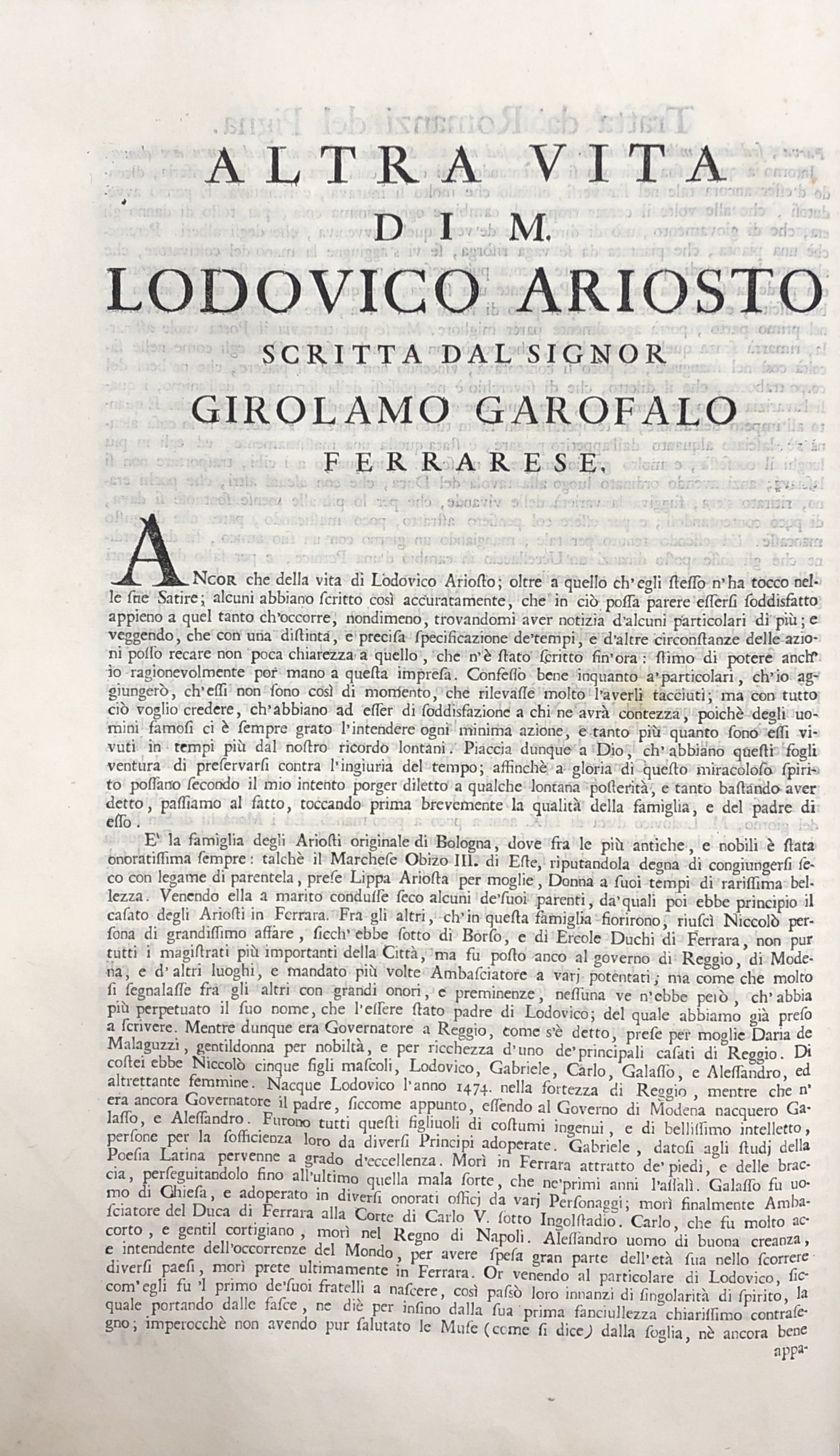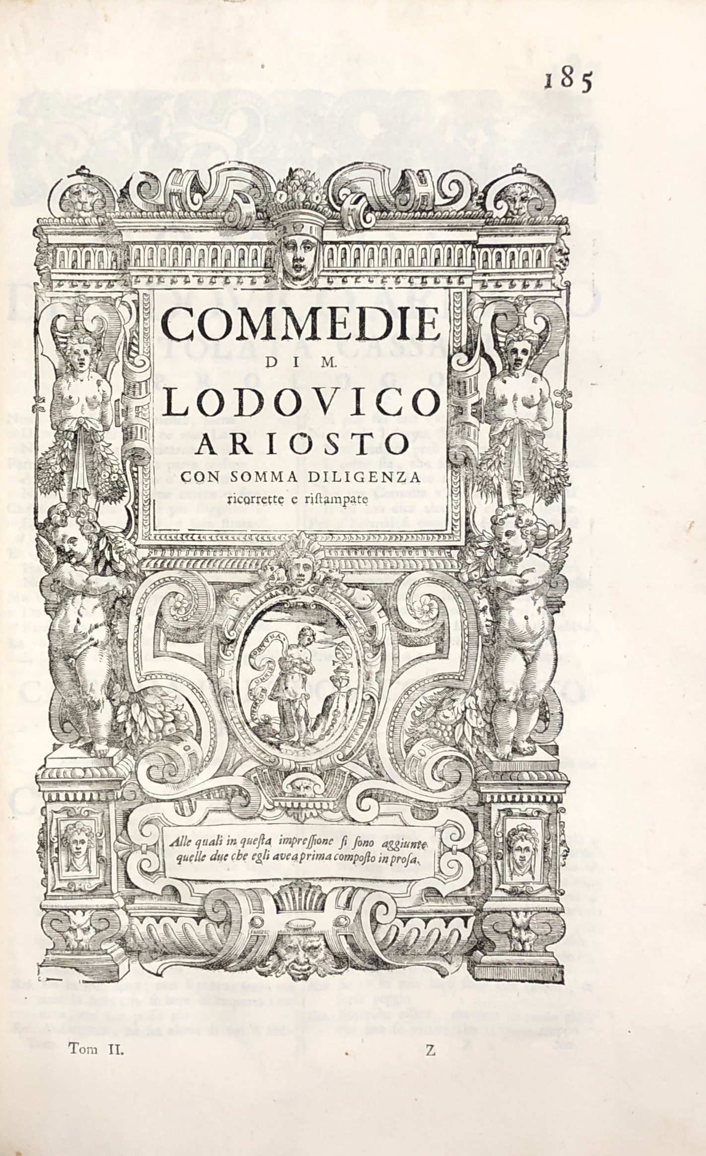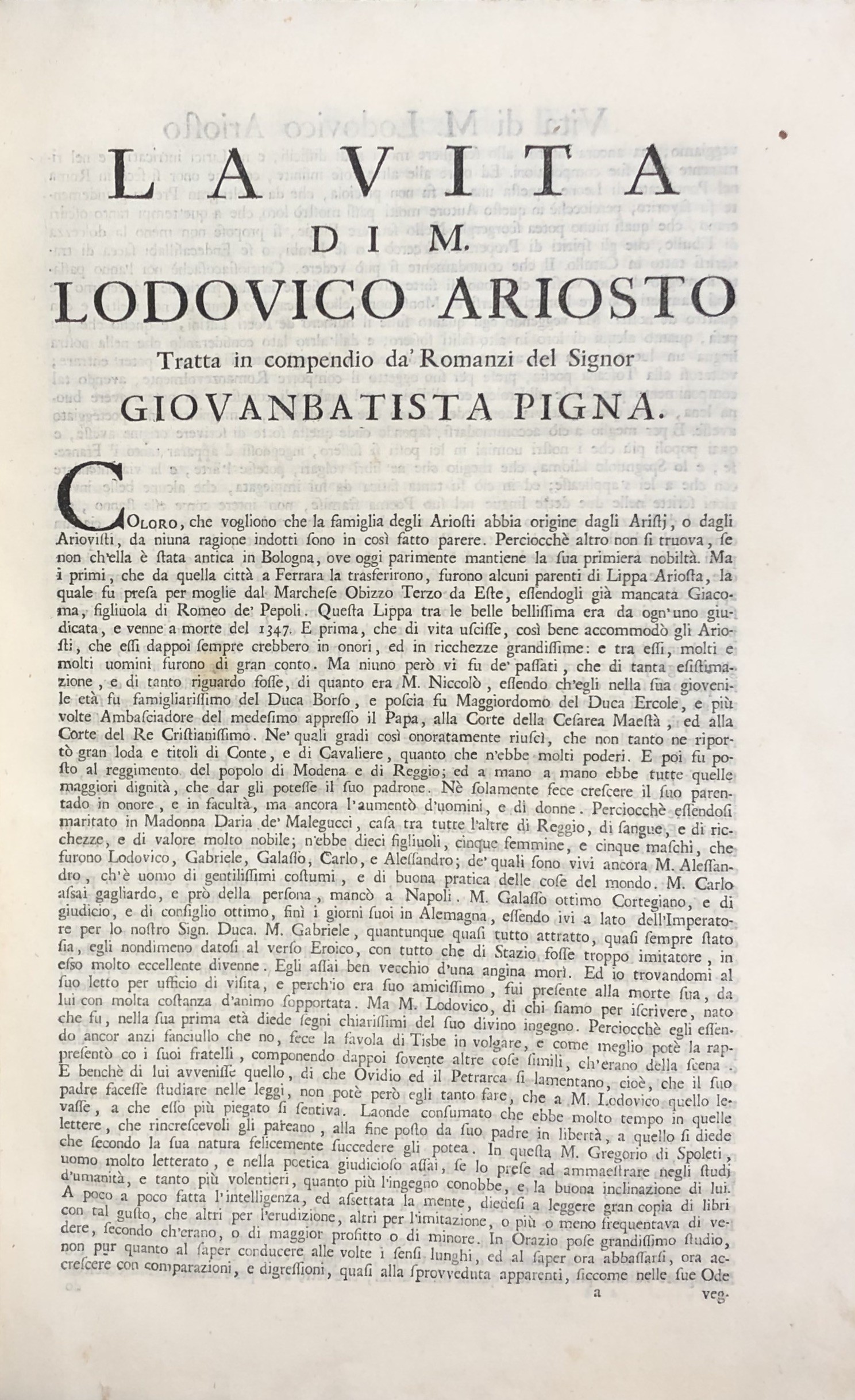 Doppio frontespizio finemente inciso: Primo frontespizio delle “Opere” e secondo in bicromo con marca editoriale raffigurante un fuoco che scaccia le api dall’arnia, con motto “Pro bono malum”. Il secondo volume contiene un altro frontespizio interamente inciso da Giuseppe Filosi; Ritratto dell’Ariosto a inizio opera inciso da Carlo Orsolini. Magnifica edizione settecentesca in-folio dell’Orlando furioso e di tutte le restanti opere di Ariosto, preziosa per accuratezza testuale. Testatine e finalini incisi. Presente anche il frontespizio relativo alle commedie