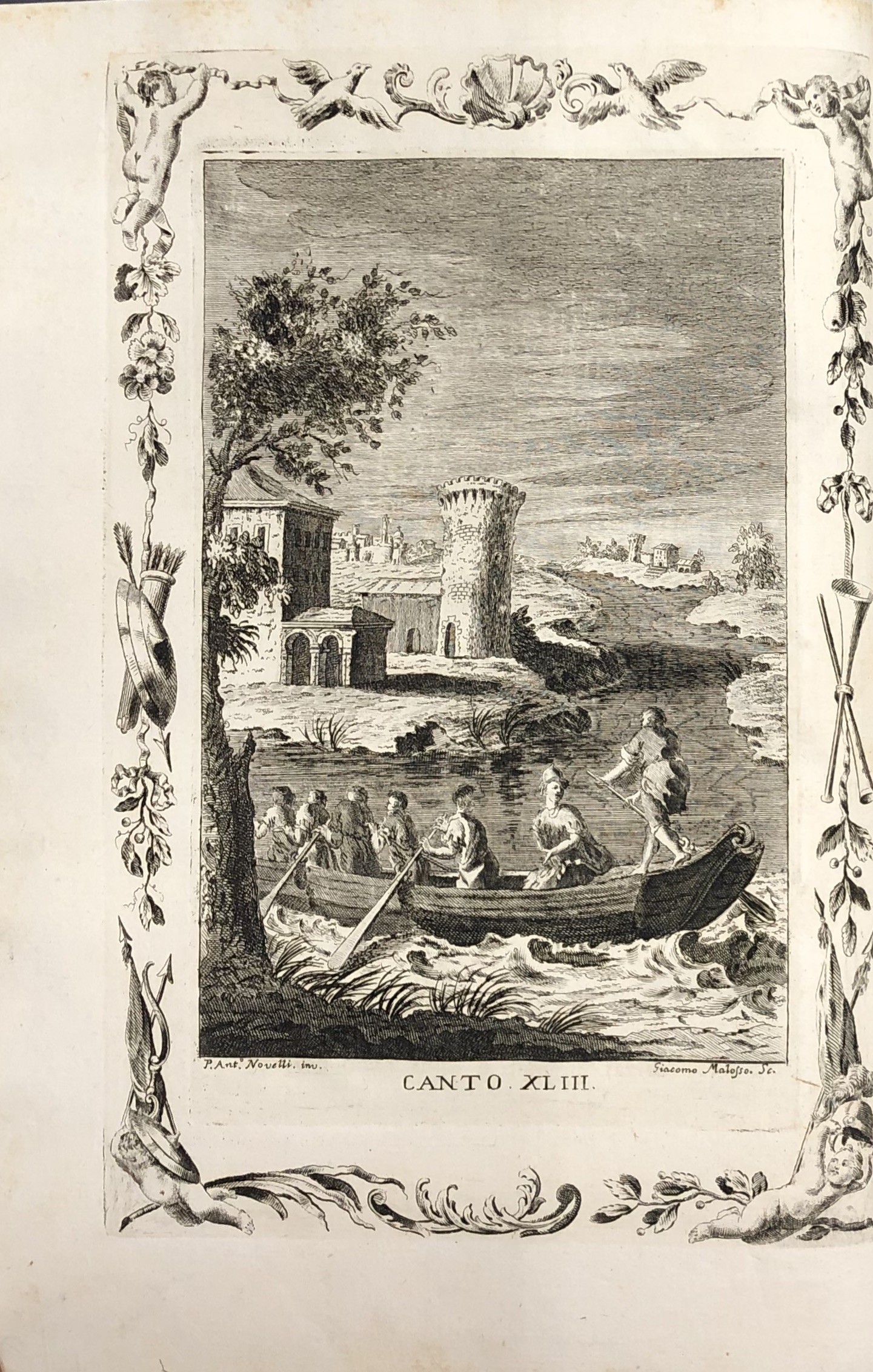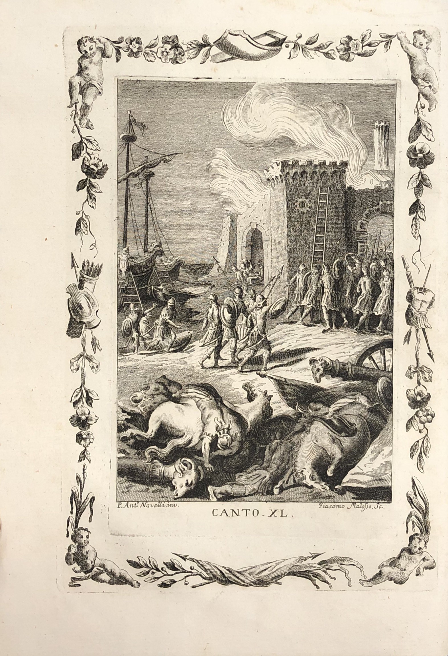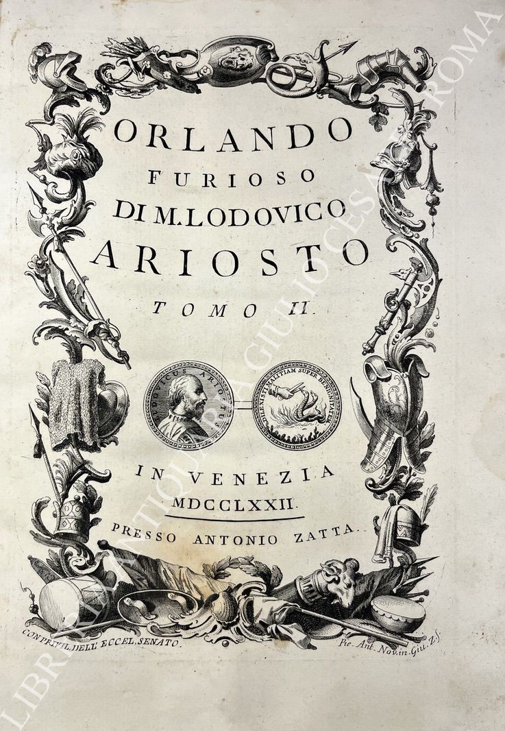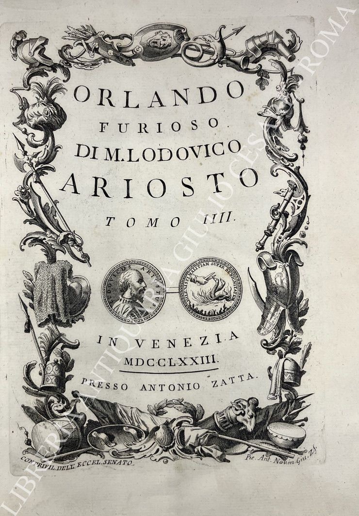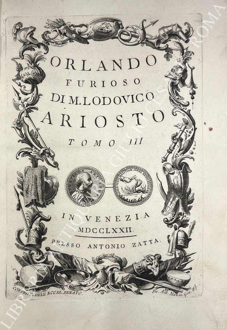 Opera considerata uno dei capolavori dell'editoria veneziana del '700. Quattro frontespizi calcografici, 62 tavole totali a piena pagina (tra le quali: il ritratto dell'Ariosto inciso da Giuseppe Daniotto, la casa, il sepolcro, la sedia, il calamaio, il facsimile della sua scrittura), 36 incisioni di piccole dimensioni, 51 quadranti con testo inciso a inizio di ogni canto (46 canti + 5 rivisti e ricorretti), 20 testatine e finalini incisi. Tra gli incisori: Giuliano Zuliani, Tommaso Baratti, Ferdinando Fambrini, Giacomo Malosso e altri, tutti su soggetti di Pietro Antonio Novelli.