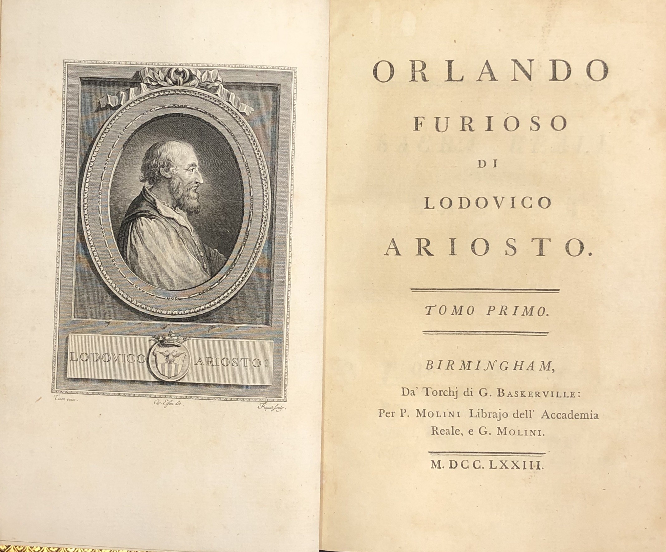 Celebre edizione dell'Orlando Furioso. Esemplare in elegante legatura italiana di fine settecento in pelle lucida maculata, piatti con filetti in oro, dorsi con doppio tassello e fregi oro negli scomparti, tagli oro e dentelle sui tagli dei piatti.