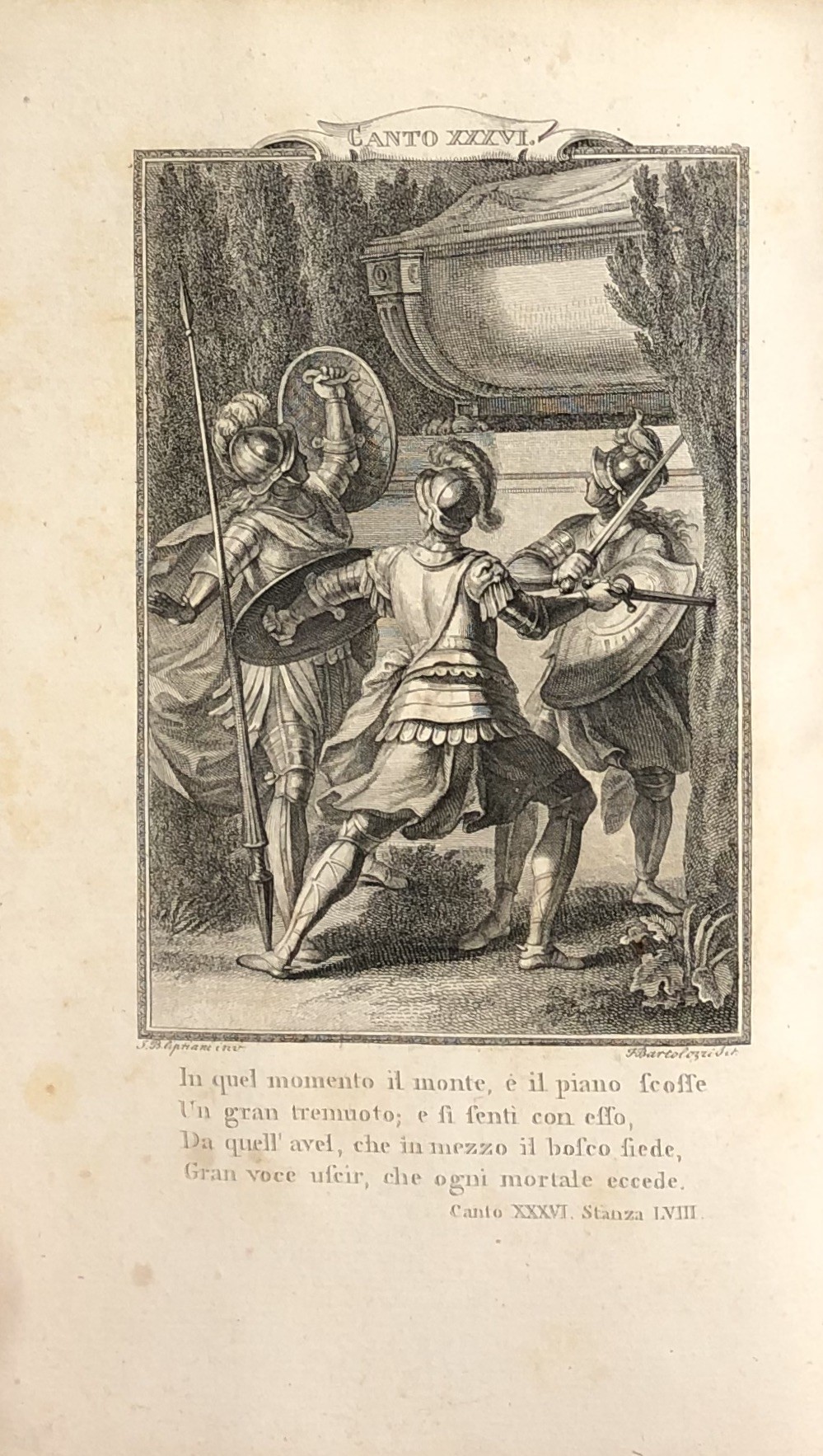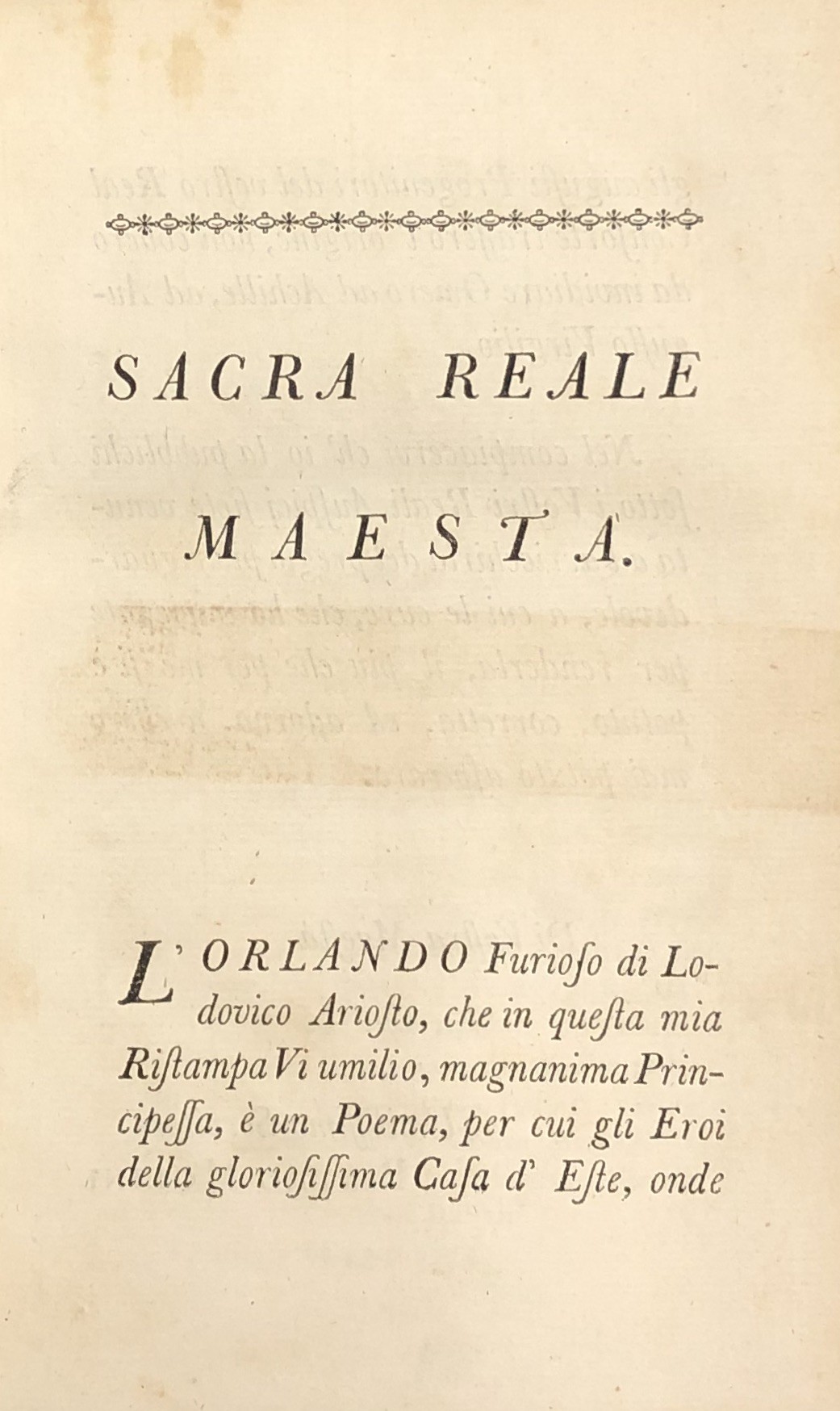 Celebre edizione dell’Orlando Furioso. Esemplare in elegante legatura italiana di fine settecento in pelle lucida maculata, piatti con filetti in oro, dorsi con doppio tassello e fregi oro negli scomparti, tagli oro e dentelle sui tagli dei piatti.