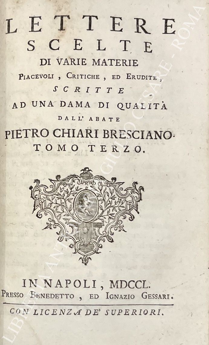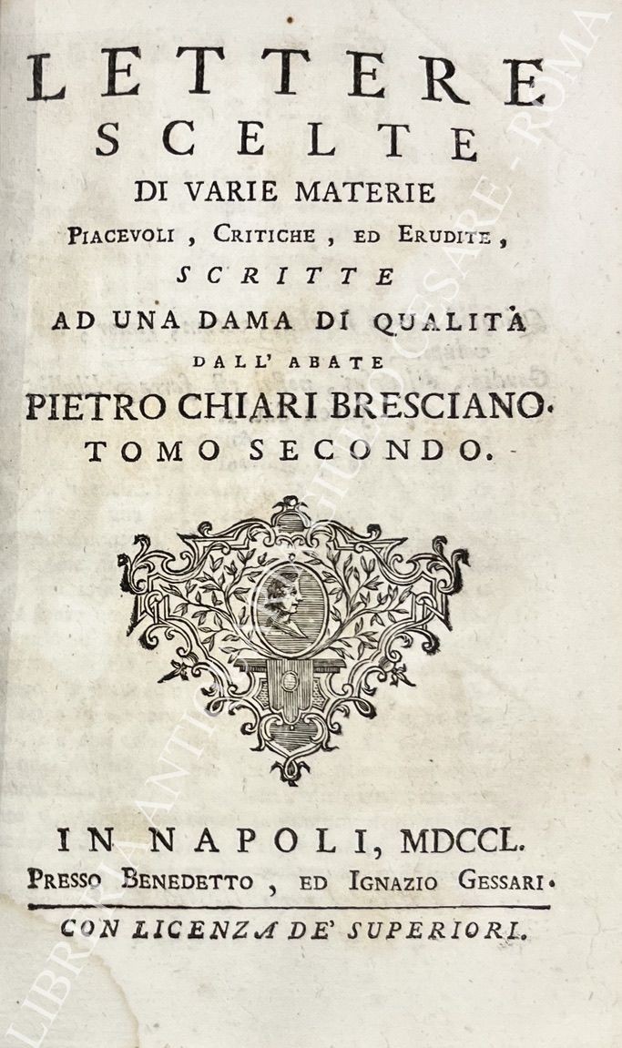 Lettere contro - critiche scritte dal suo ritiro da Godefrisio Toante ad un'amico in città dedicate Agli Eccellentissimi Signori Conte D. Francesco e D. Luigi D'Aquino De Conti di Palena. UNITO A: Lettere scelte di varie materie Piacevoli, Critiche, ed Erudite, scritte ad una dama di qualità dall'abate Pietro Chiari Bresciano, Tomo secondo e terzo