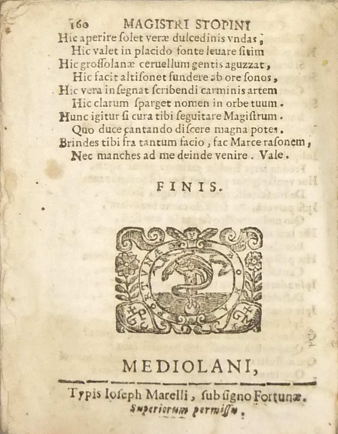 Raro. Marca tipografica xilografata al frontespizio e a fine opera con motto "Bona Fortunae"