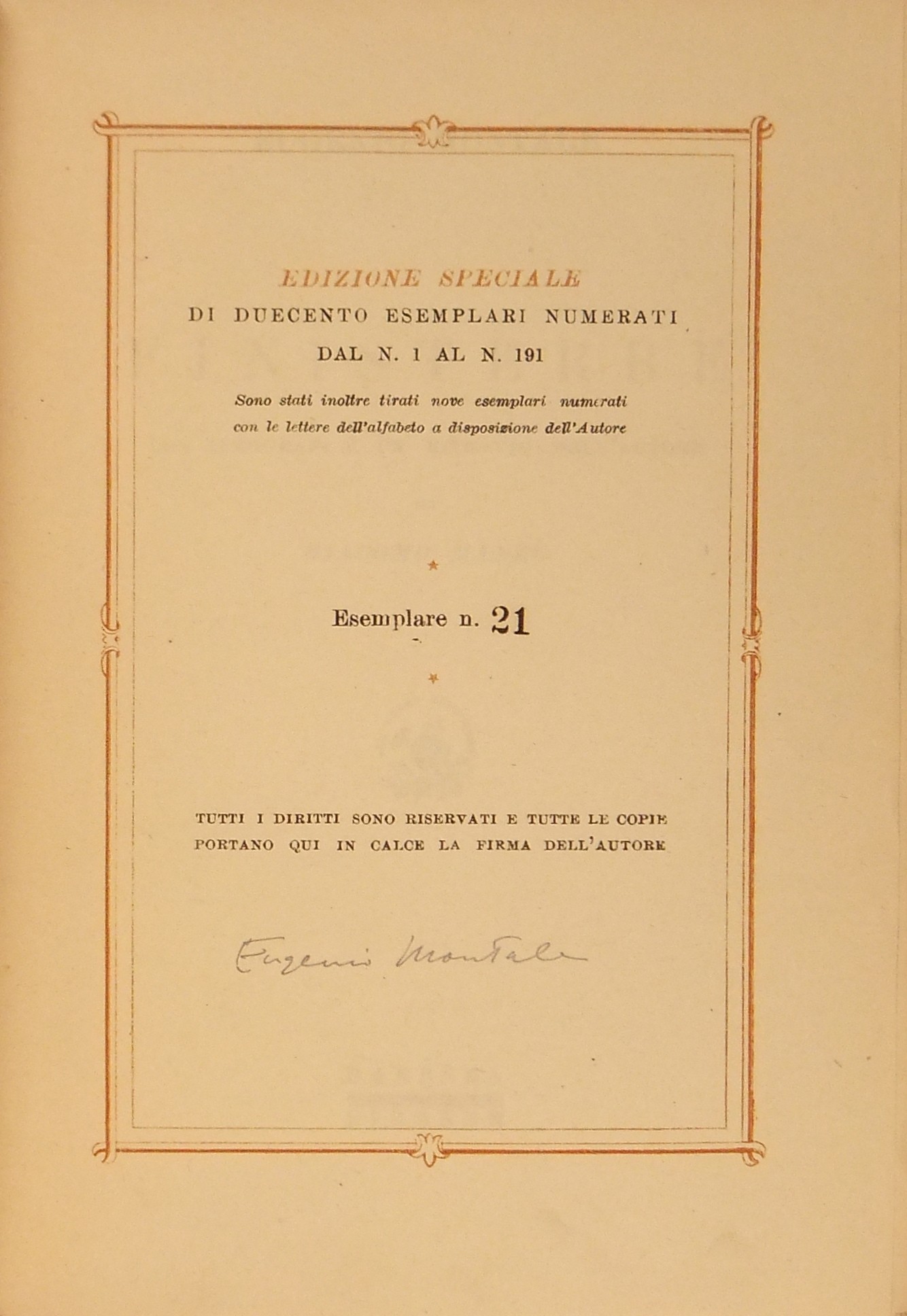 Edizione speciale di duecento esemplari numerati dal n. 1 al n. 191. Sono stati inoltre tirati 9 esemplari numerati con lettere dell'alfabeto a disposizione dell'Autore. Ns. esemplare n. 21. Firmato dall'Autore