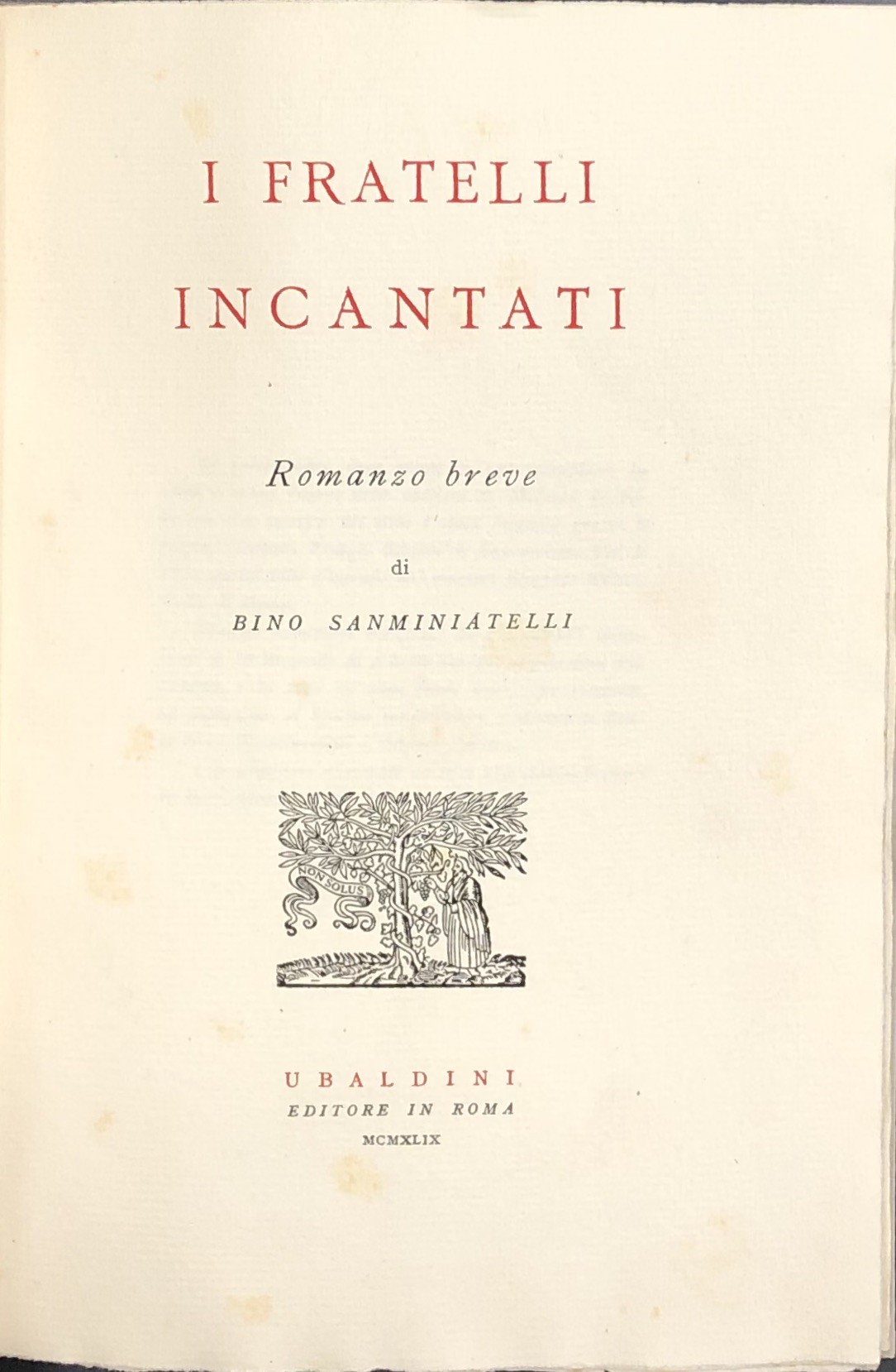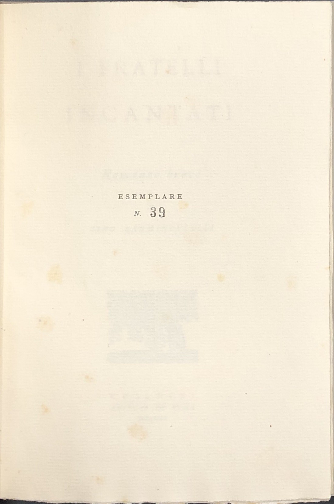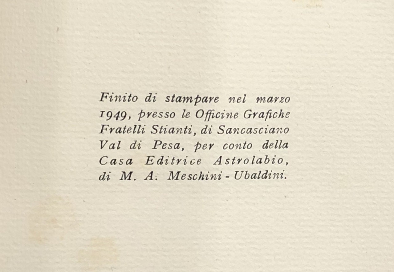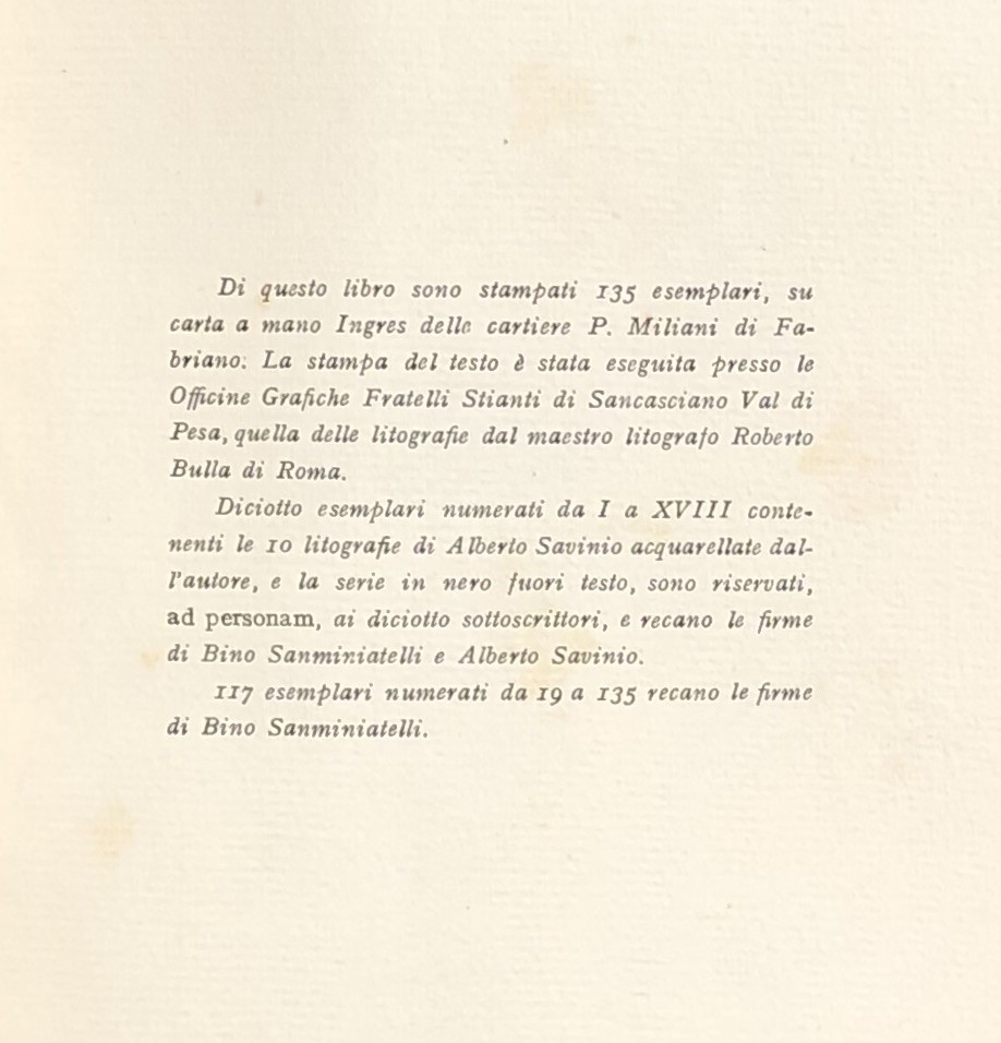 Libro stampato in 135 esemplari su carta a mano Ingres delle cartiere P. Miliani di Fabriano. L'opera si compone di: diciotto esemplari numerati da I a XVIII contenenti le 10 litografie di Alberto Savinio acquarellate dall'Autore e la serie in nero fuori testo riservata (ad personam) ai diciotto sottoscrittori recanti le firme di Bino Sanminiatelli e Alberto Savinio e 117 esemplari numerati da 19 a 135 recanti la firma di Bino Sanminiatelli. Nostro esemplare ad personam n. 39