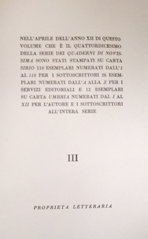 Nel novembre dell'anno XII di questo volume che è il quattordicesimo della serie dei Quaderni di Novissima sono stati stampati su carta Sirio 110 esemplari numerati dall'1 al 110 per i sottoscrittori 26 esemplari numerati dall'A alla Z per i servizi editoriali e 12 esemplari su carta Umbria numerati dal I al XII per l'Autore e i sottoscrittori all'intera serie. Il nostro esemplare è il III