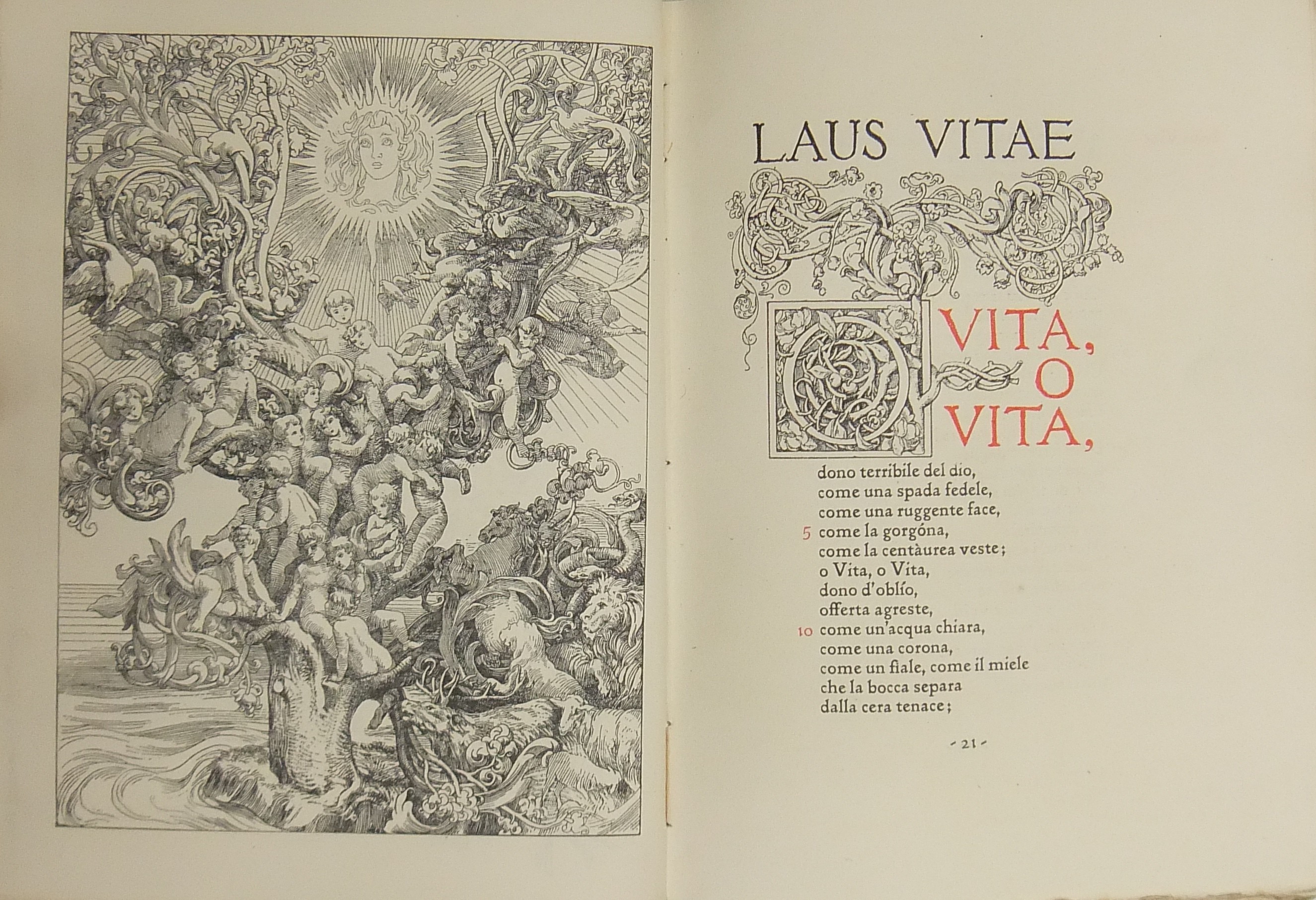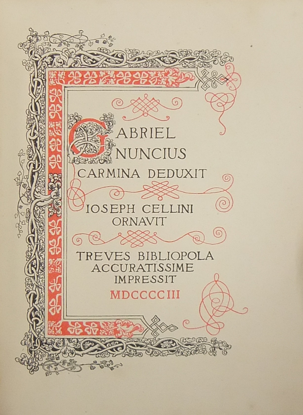Elegante edizione interamente stampata su carta forte in bicromatico rosso e nero, incisioni di Giuseppe Cellini