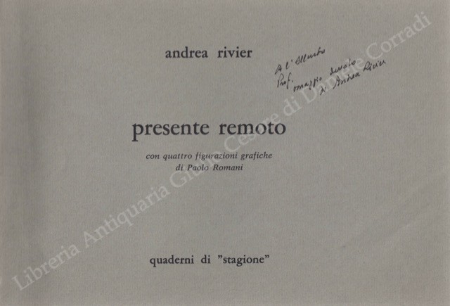 Questo quaderno di Andrea Rivier è stato stampato con i caratteri “Aster” corpo 12 su carta a mano “Ingres” delle Cartiere Milani di Fabriano, in soli 99 esemplari pro manuscripto, numerati ad personam e firmati dall’autore nel ottobre 1978 da Patrizio Graziani tipografo di Roma. Esemplare Nuova serie
