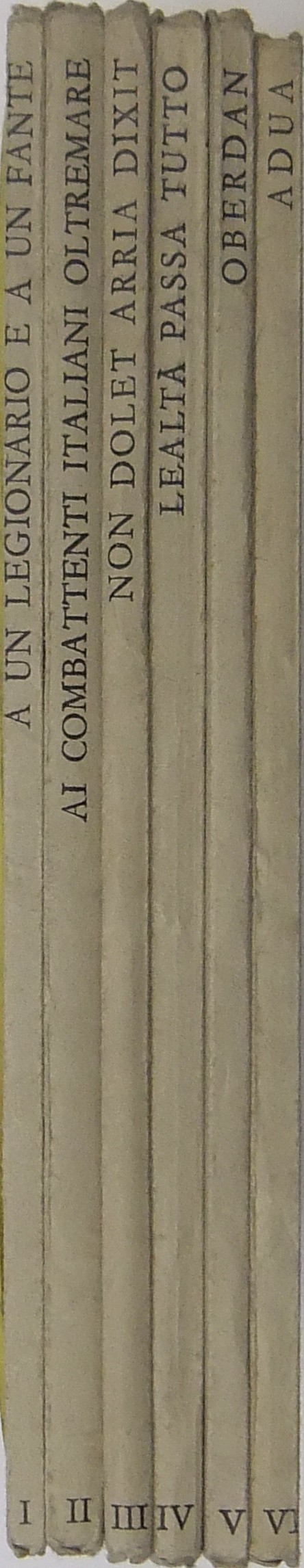 Teneo te Africa. Vol. I - A un legionario e a un fante; Vol. II - Ai combattenti italiani d'oltremare; Vol. III - Non dolet arria dixit; Vol. IV - Lealtà passa tutto; Vol. V - Oberdan; Vol. VI - Adua