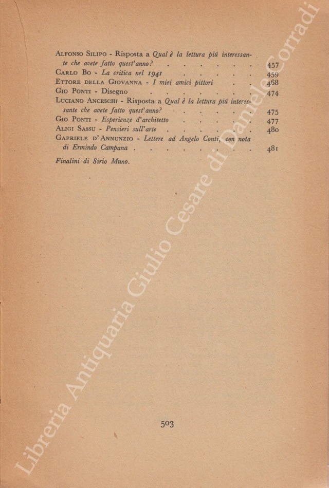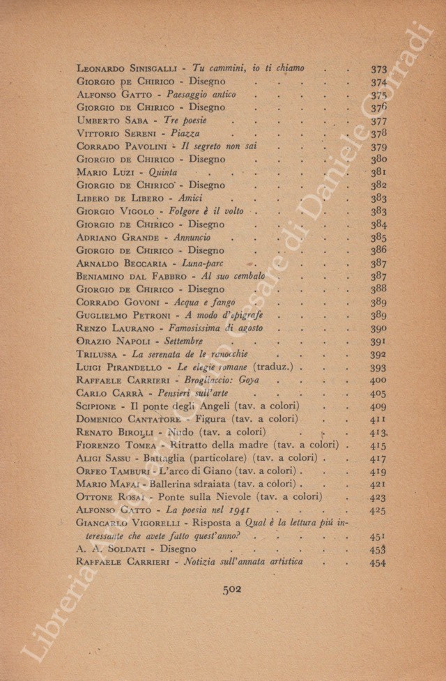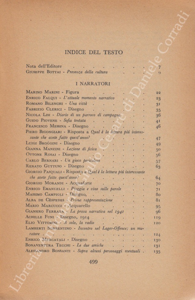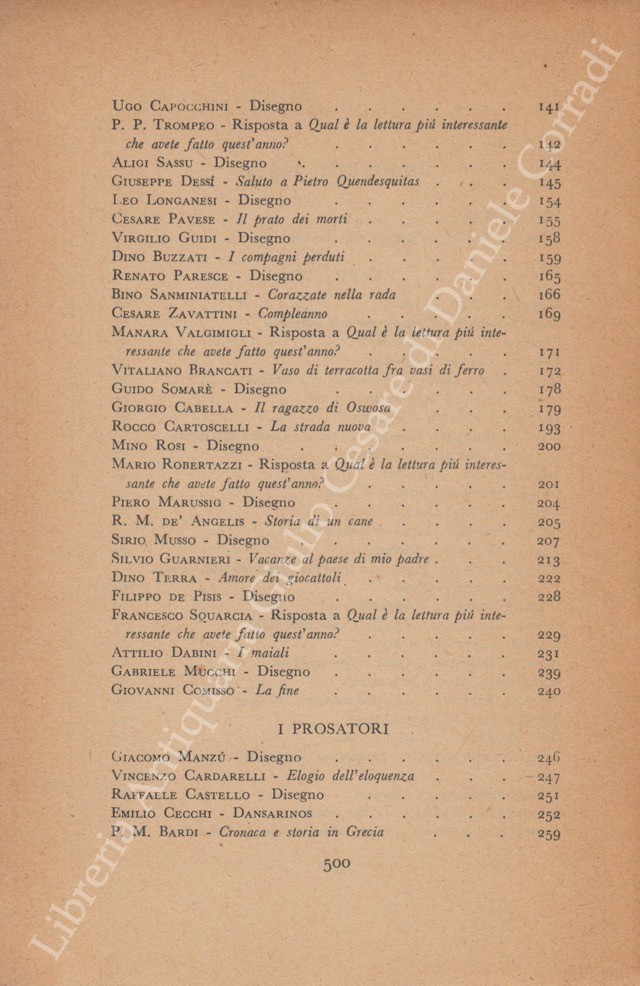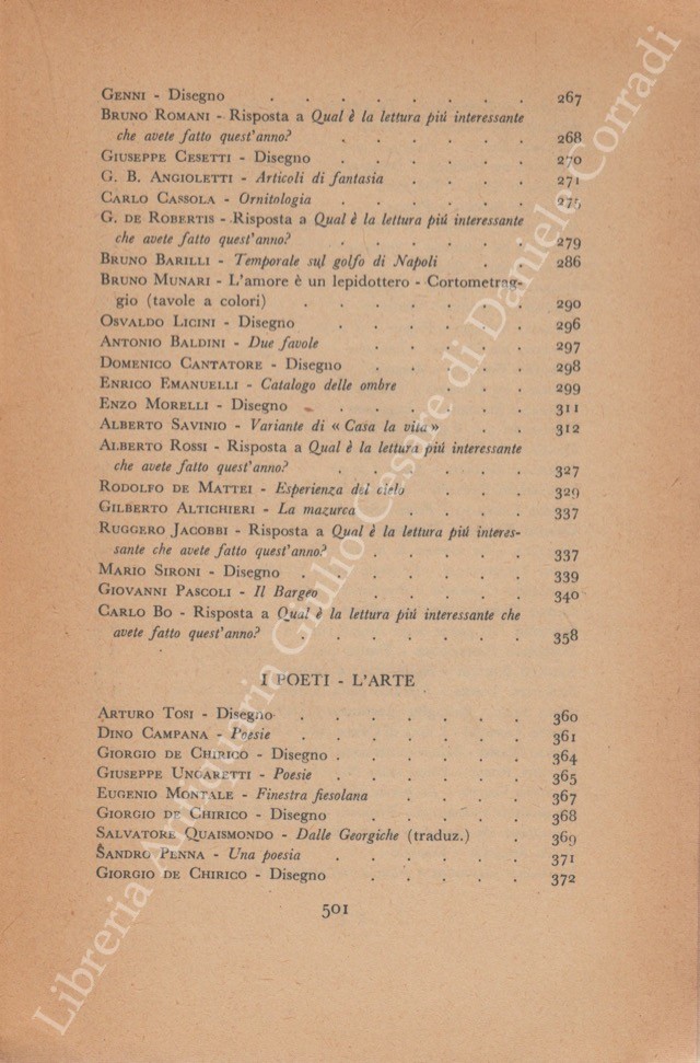 Scritti di: Altichieri, Anceschi, Angioletti, Baldini, Bardi, Barilli, Beccaria, Bernardi, Bigongiari, Bilenchi, Birolli, Bo, Bonsanti, Bottai, Brancati, Broggini, Buzzati, Cabella, Campana, Campigli, Cantatore, Capocchini, Cardarelli, Carrà , Carrieri, Cartoscelli, Cassola, Castelli, Cecchi, Cesetti, Cespedes, Clerici, Comisso, D'Annunzio, Dabini, Dal Fabbro, De' Angelis, De Chirico, De Libero, De Mattei, De Pisis, De Robertis, Della Giovanna, Dessi, Emanuelli, Falqui, Ferrata, Funi, Gatto, Genni, Govoni, Grande, Guarnieri, Guidi, Guttuso, Jacobbi, Laurano, Licini, Lisi, Longanesi, Luzi, Mafai, Manzini, Manzù, Marcucci, Marini, Marussig, Mercatali, Messina, Montale, Morandi, Morelli, Mucchi, Munari, Musso, Napoli, Paresce, Pascoli, Pasquali, Pavese, Pavolini, Penna, Petroni, Pirandello, Piovene, Ponti, Quasimodo, Robertazzi, Romani, Rosai, Rosi, Rossi, Saba, Sanminiatelli, Sassu, Savinio, Scipione, Sereni, Silipo, Sinisgalli, Sironi, Somarè, Sorrentino, Squarcia, Tamburi, Tecchi, Terra, Tomea, Tosi, Trilussa, Trompeo, Ungaretti, Valgimigli, Vigolo, Vigorelli, Vittorini, Zavattini