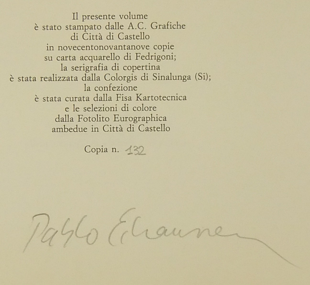 Tiratura limitata in 999 copie su carta acquarello di Fedrigoni. Ns. esemplare n. 132 con firma dell'Autore
