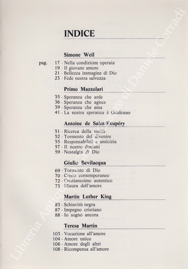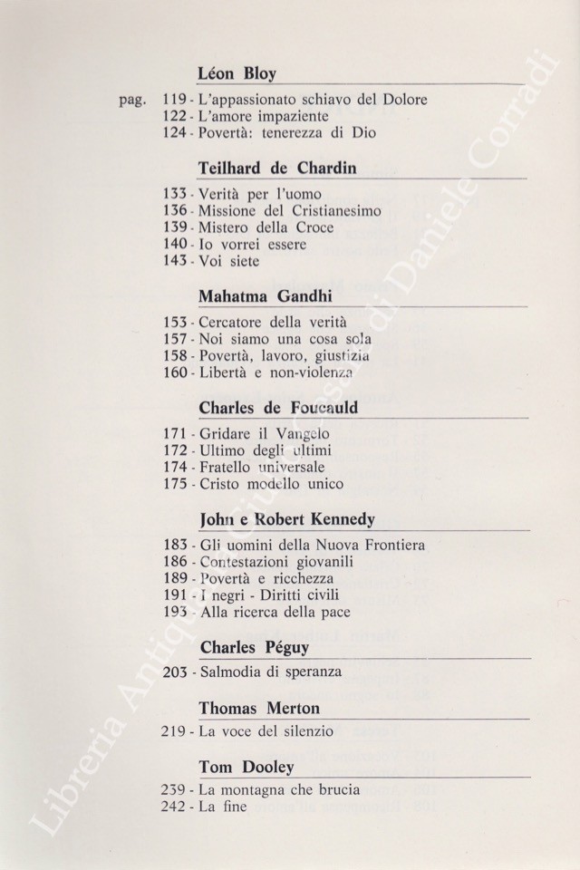 Scritti di: Bevilacqua, Bloy, de Chardin, de Foucauld, de Saint-Exupéry, Dooley, Gandhi, Kennedy J. e R., Luther King, Martin, Mazzolari, Merton, Péguy, Weil