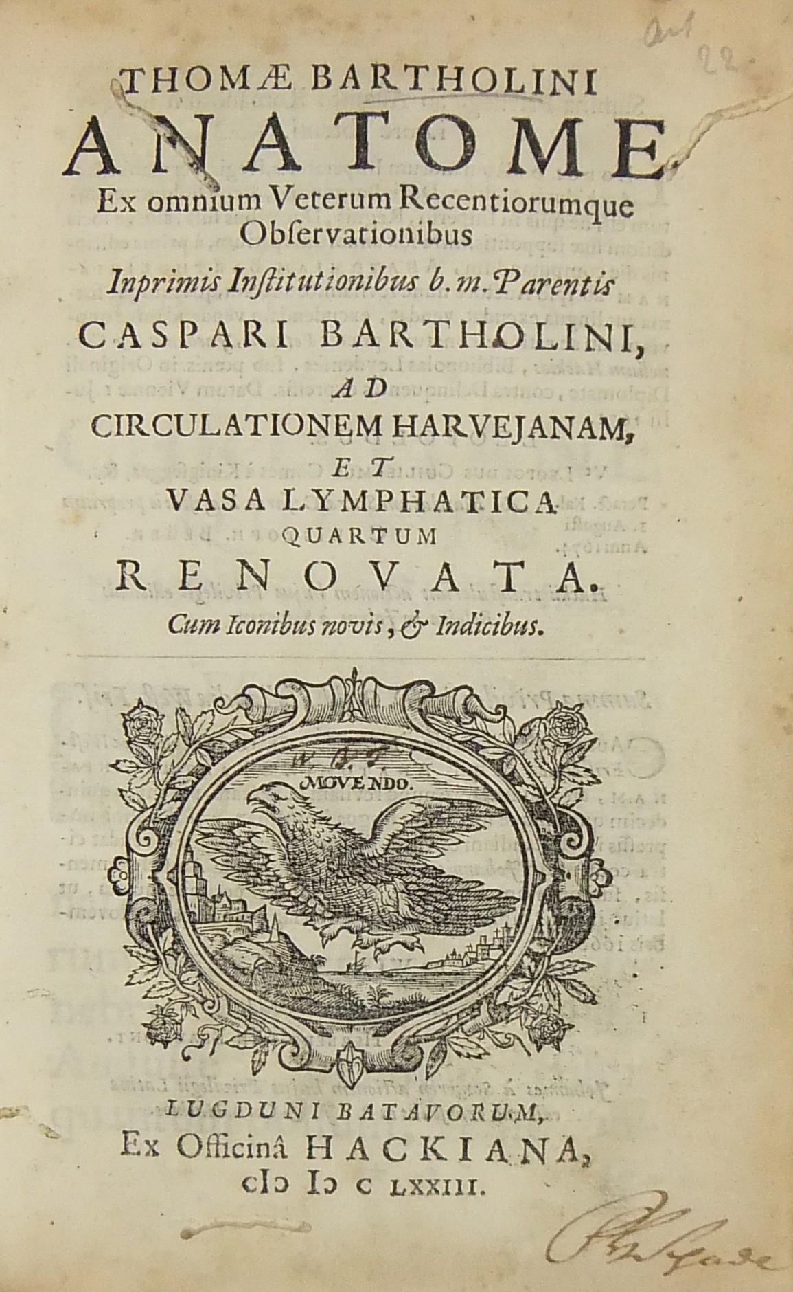 Anatome. Ex omnium Veterum Recentiorumque Observationibus. Imprimis Institutionibus b. m. Parentis Caspari Bartholini ad circulationem harvejanam et vasa lymphatica quartum renovata. Cum iconibus novis & Indicibus