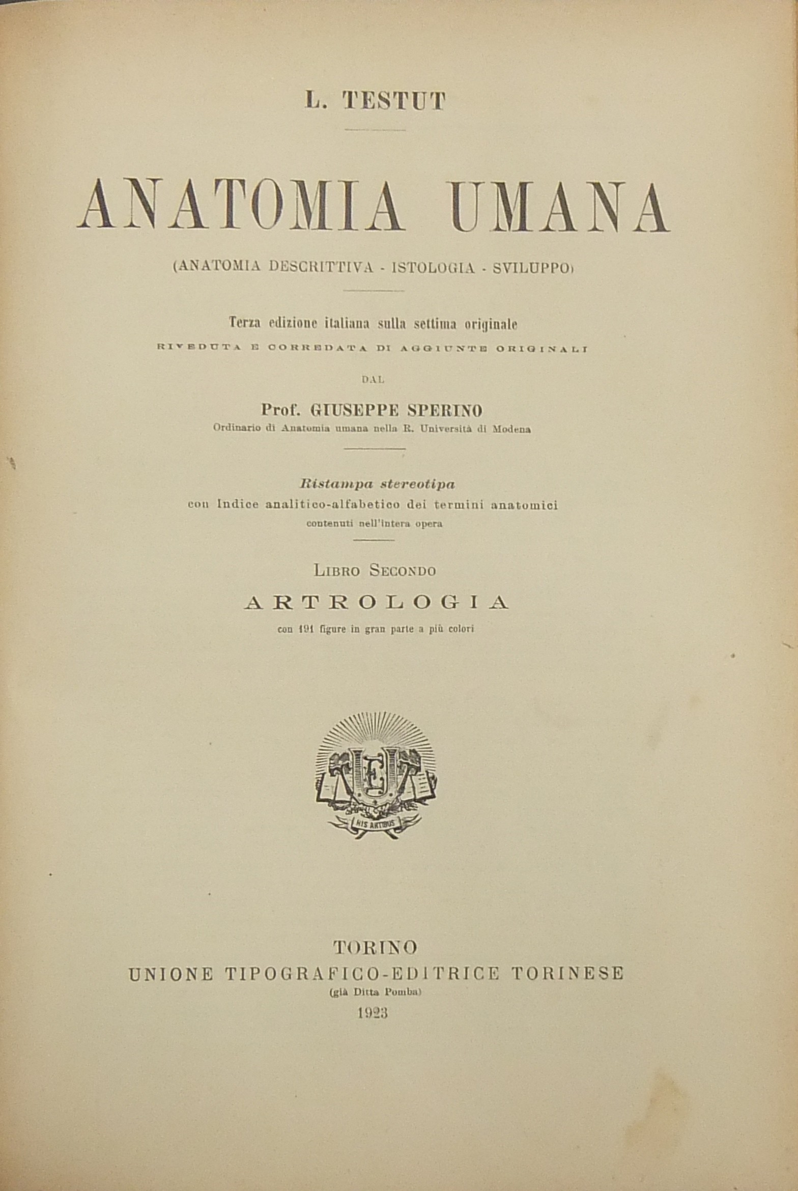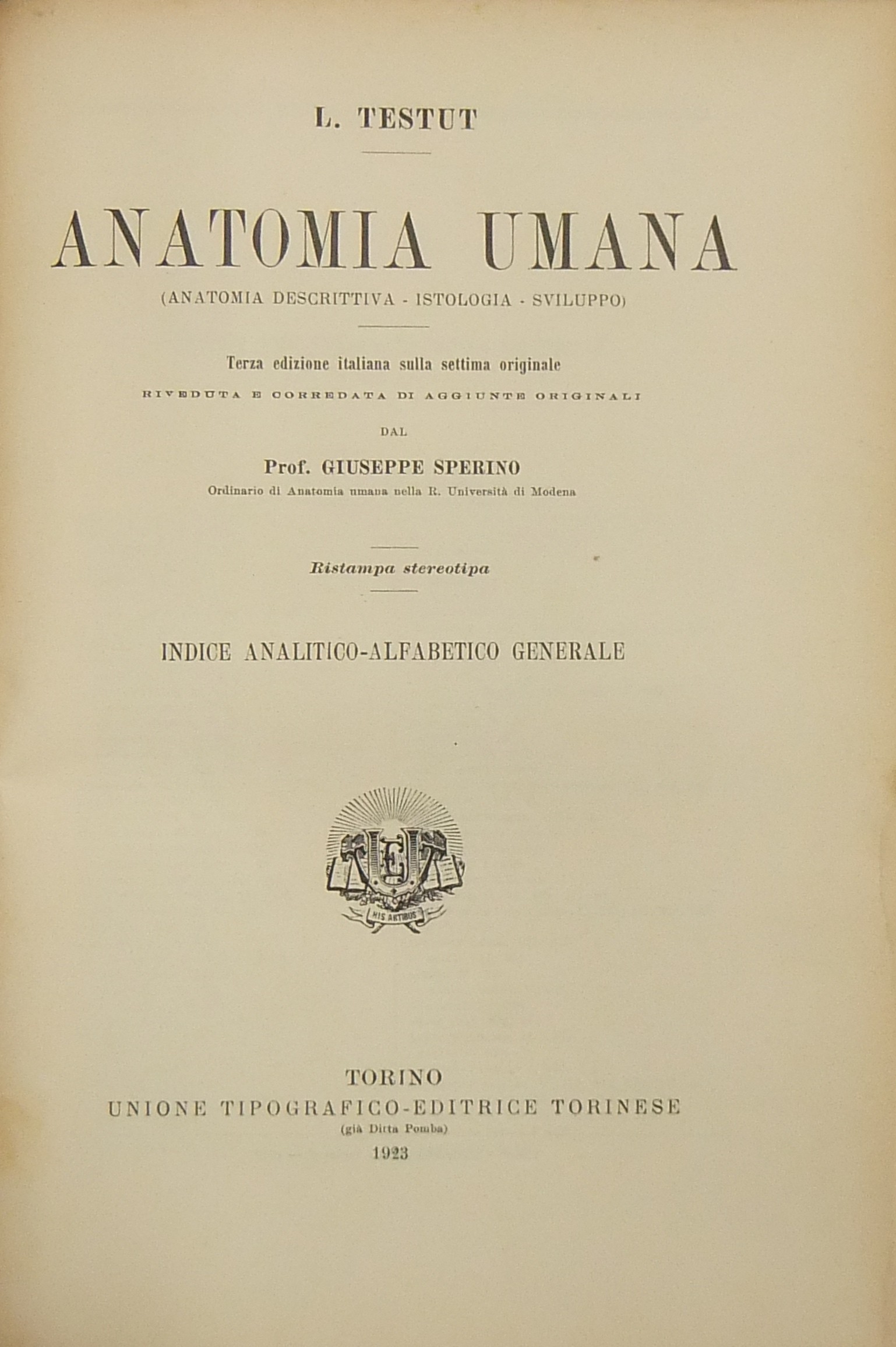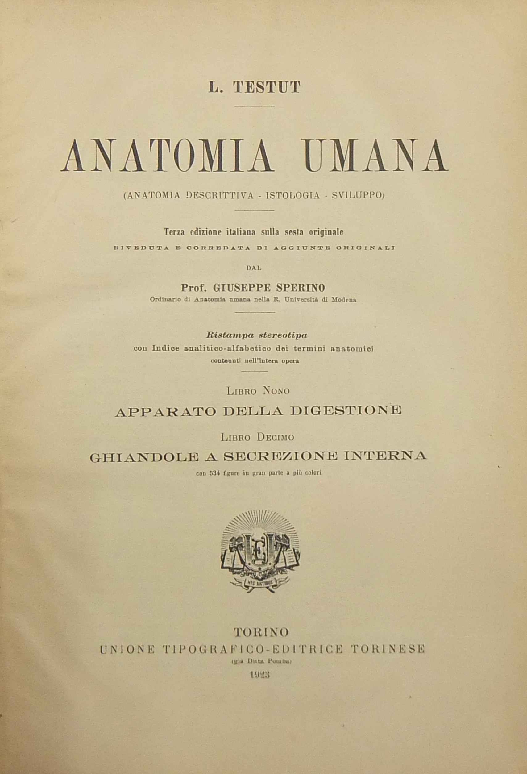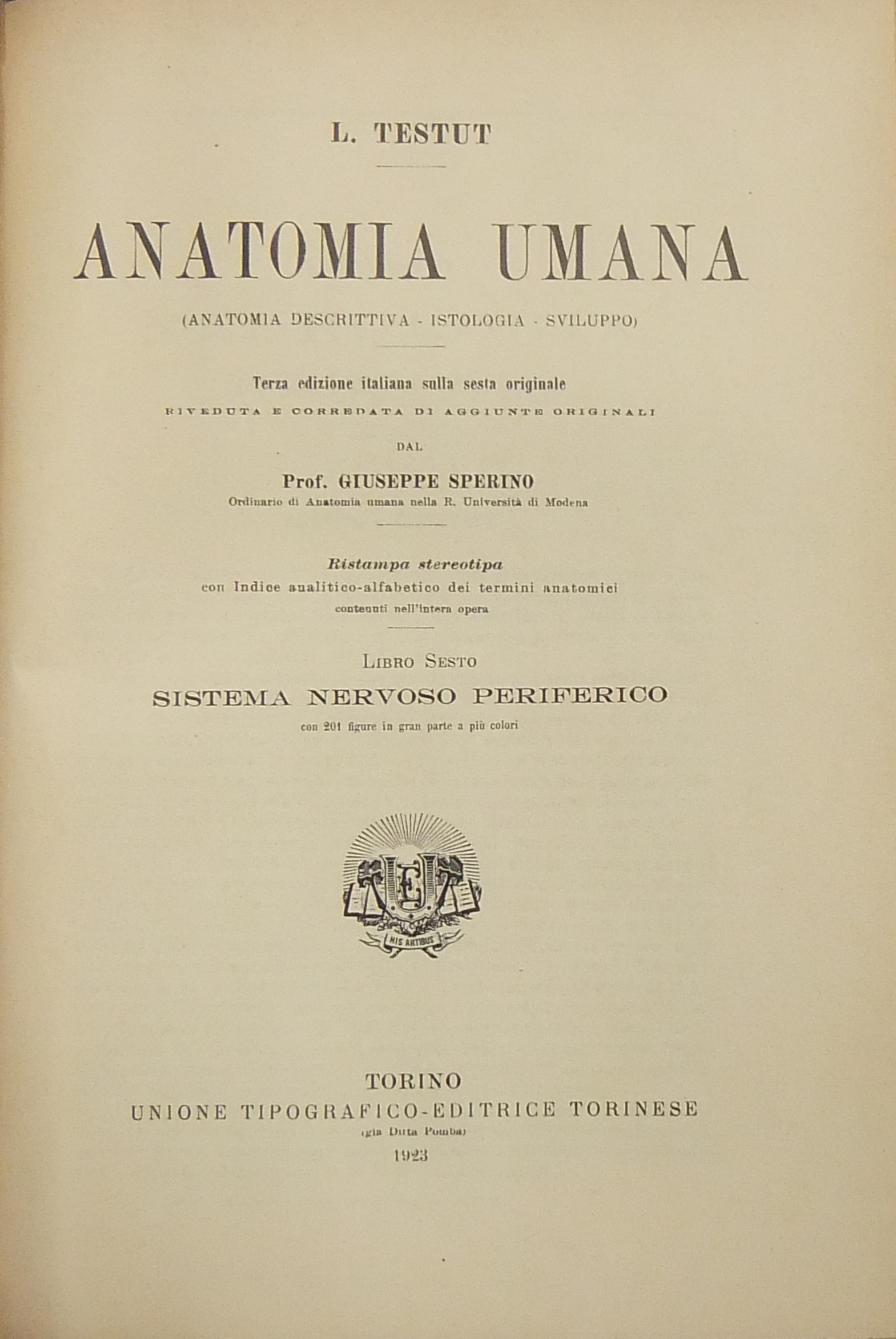 Anatomia umana. Vol. I - Osteologia. Con 417 figure in gran parte a più colori; Vol. II - Artrologia. Con 191 figure; Vol. III - Miologia. Con 285 figure; Vol. IV - Angiologia. Con 343 figure; Vol. V - Sistema nervoso centrale. Con 647 figure; Vol. VI - Sistema nervoso periferico. Con 201 figure; Vol. VII - Organi dei sensi. Con 498 figure; Vol. VIII - Respirazione e fonazione. Con 112 figure; Vol. IX - Apparato della digestione; Vol. X - Ghiandole a secrezione interna. Con 534 figure; Vol. XI - Apparato uro-genitale. Con 474 figure; Vol. XII - Embriologia. Con 90 figure; Indice analitico-alfabetico generale