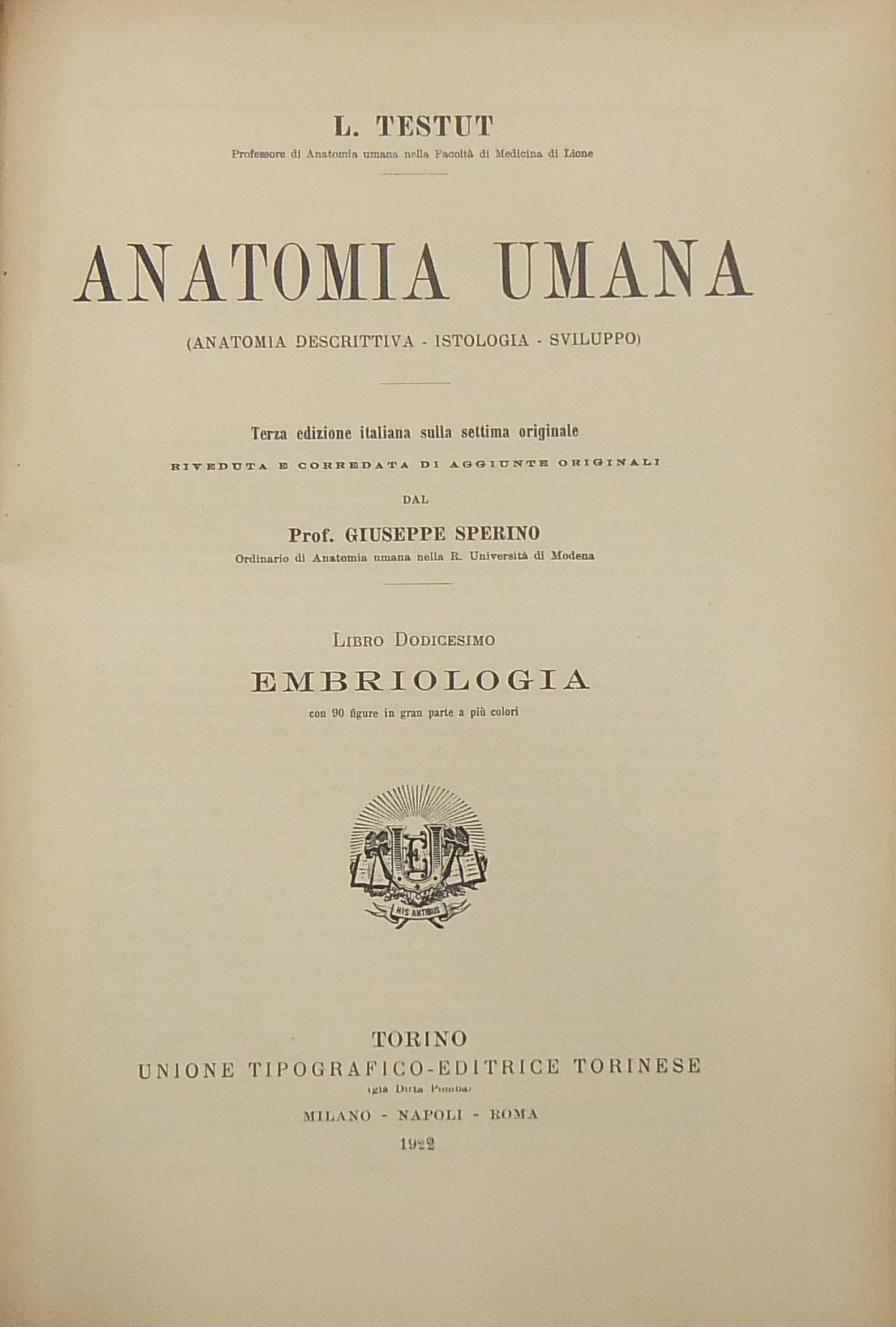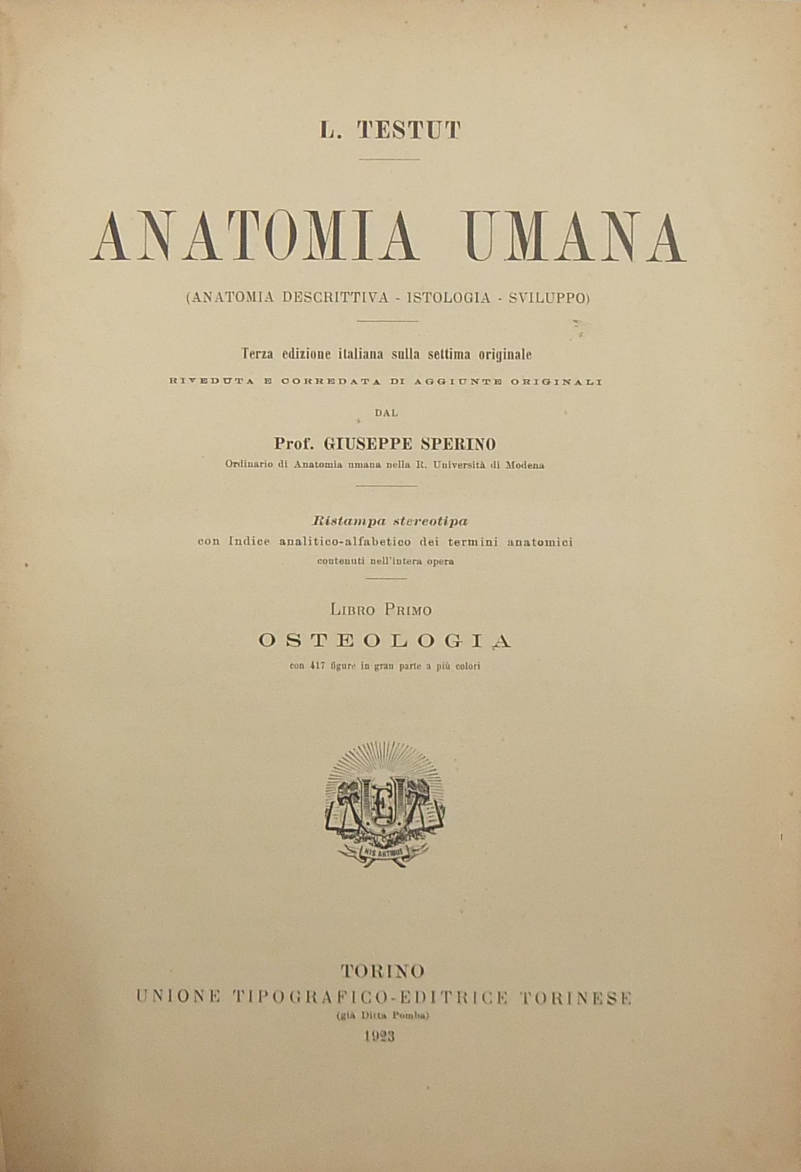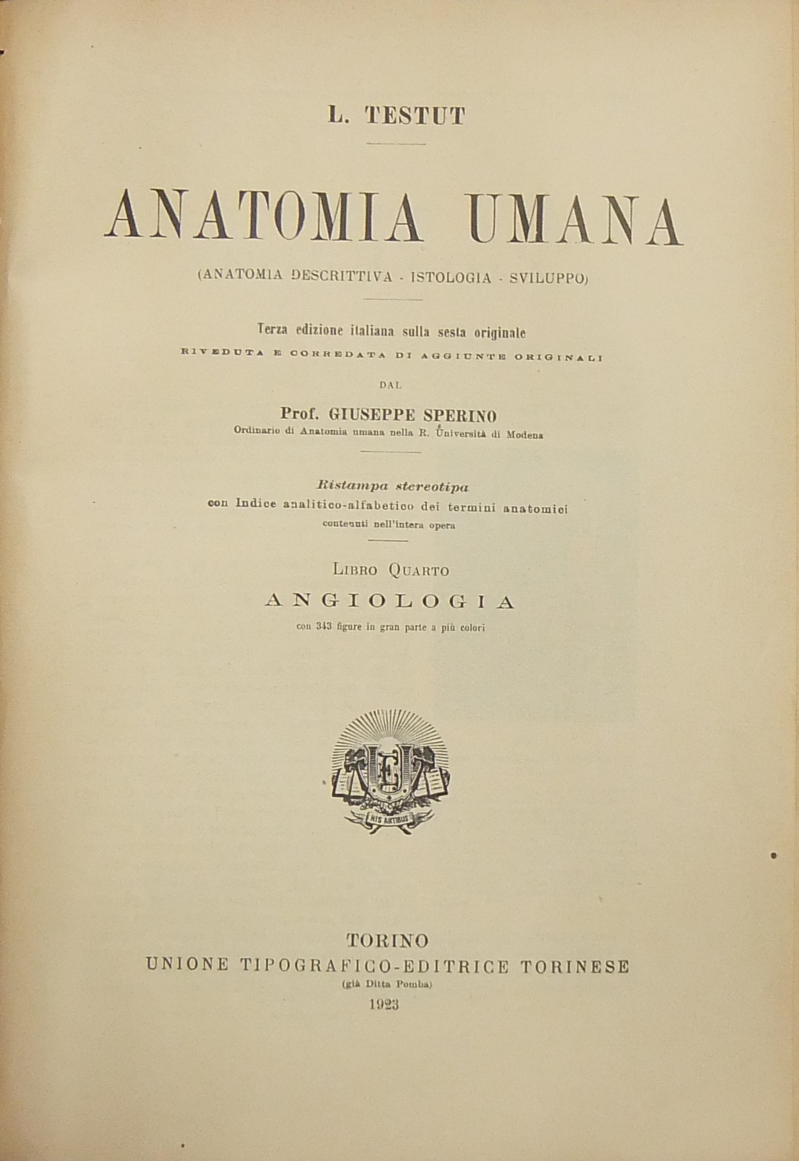 Anatomia umana. Vol. I - Osteologia. Con 417 figure in gran parte a più colori; Vol. II - Artrologia. Con 191 figure; Vol. III - Miologia. Con 285 figure; Vol. IV - Angiologia. Con 343 figure; Vol. V - Sistema nervoso centrale. Con 647 figure; Vol. VI - Sistema nervoso periferico. Con 201 figure; Vol. VII - Organi dei sensi. Con 498 figure; Vol. VIII - Respirazione e fonazione. Con 112 figure; Vol. IX - Apparato della digestione; Vol. X - Ghiandole a secrezione interna. Con 534 figure; Vol. XI - Apparato uro-genitale. Con 474 figure; Vol. XII - Embriologia. Con 90 figure; Indice analitico-alfabetico generale