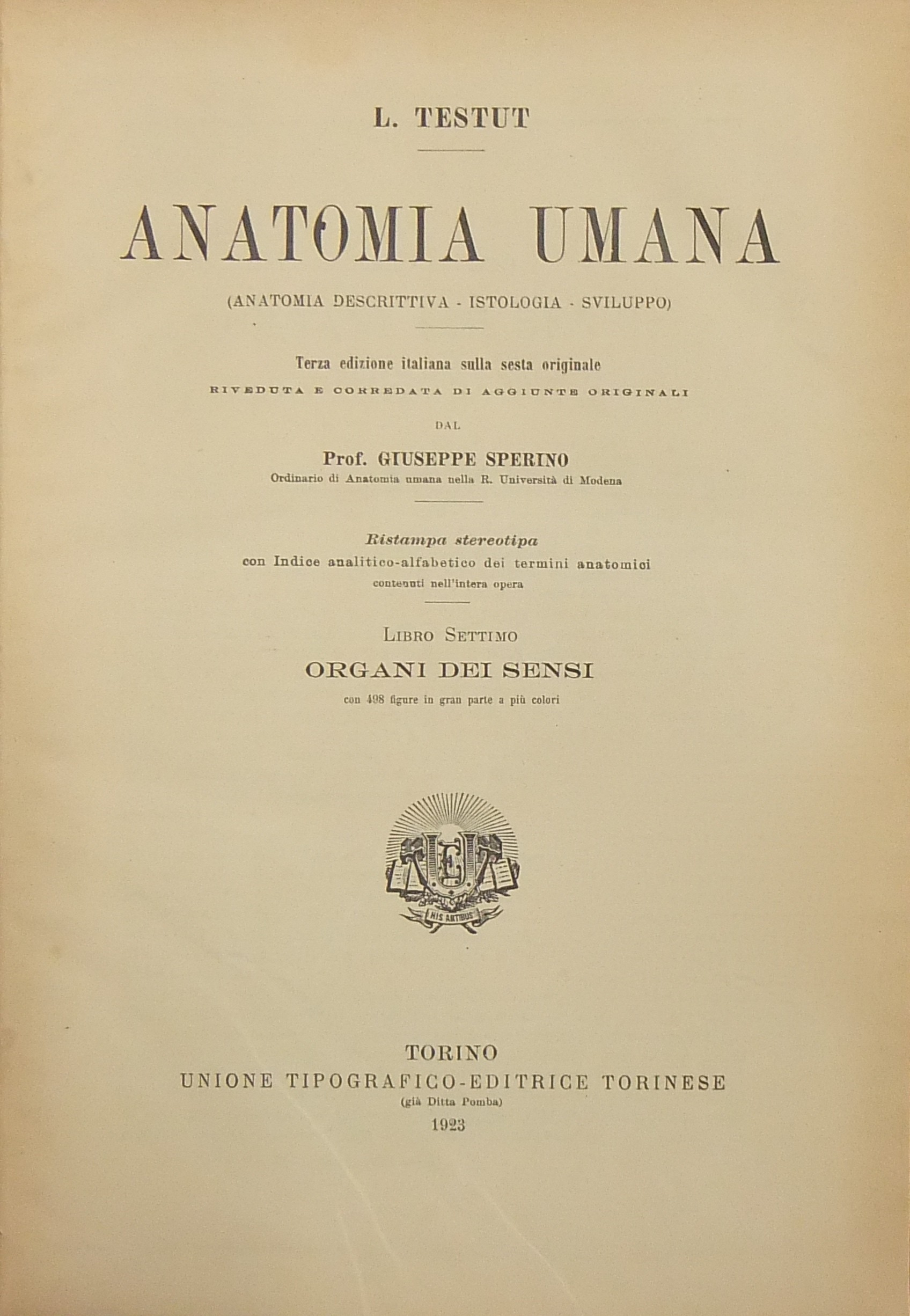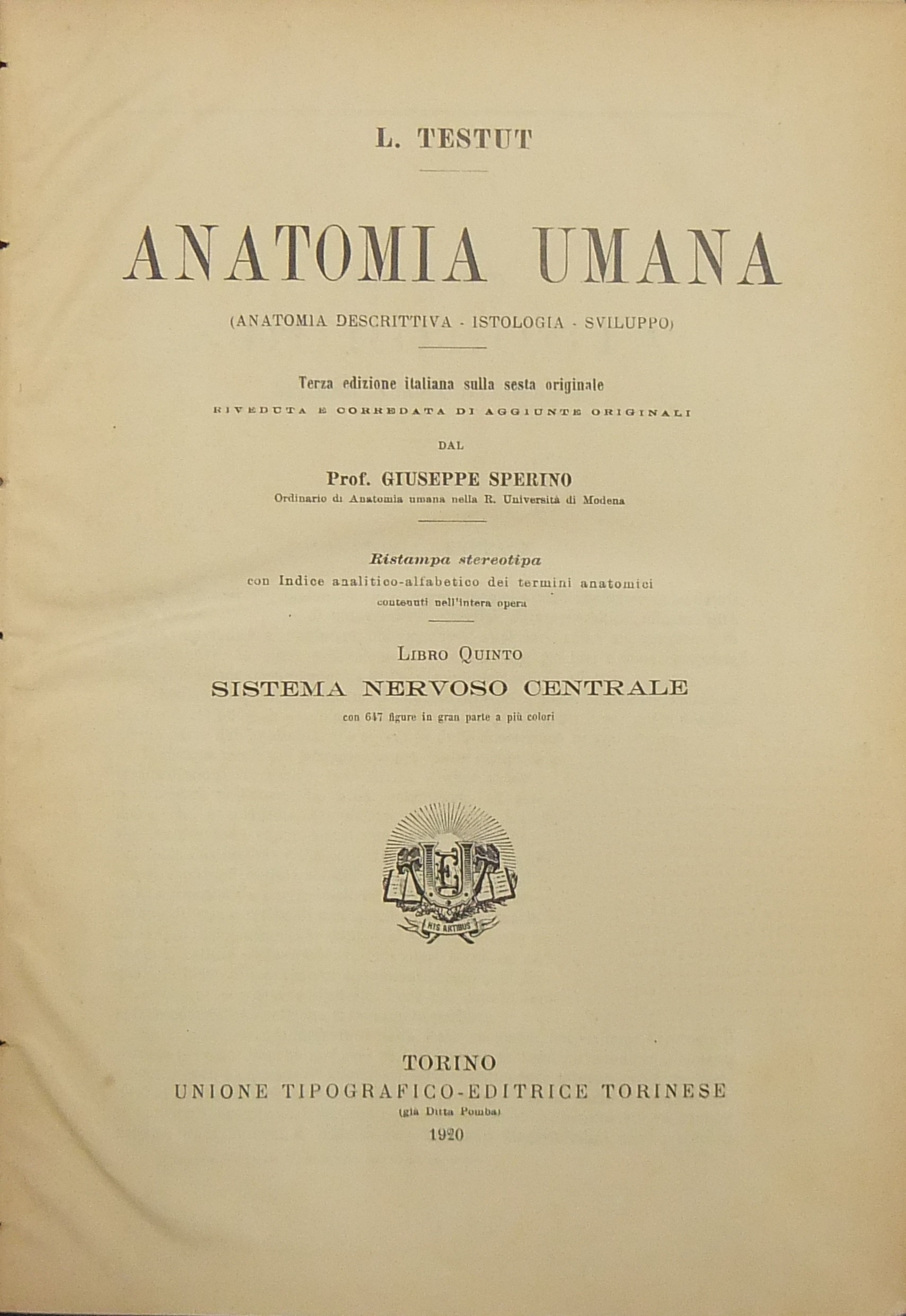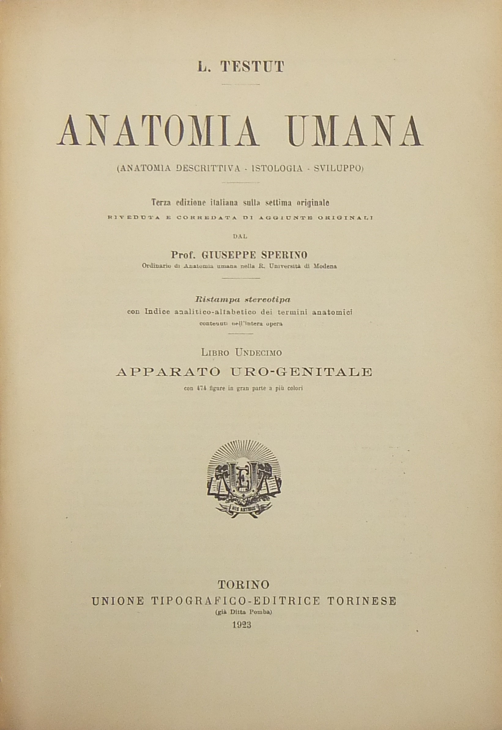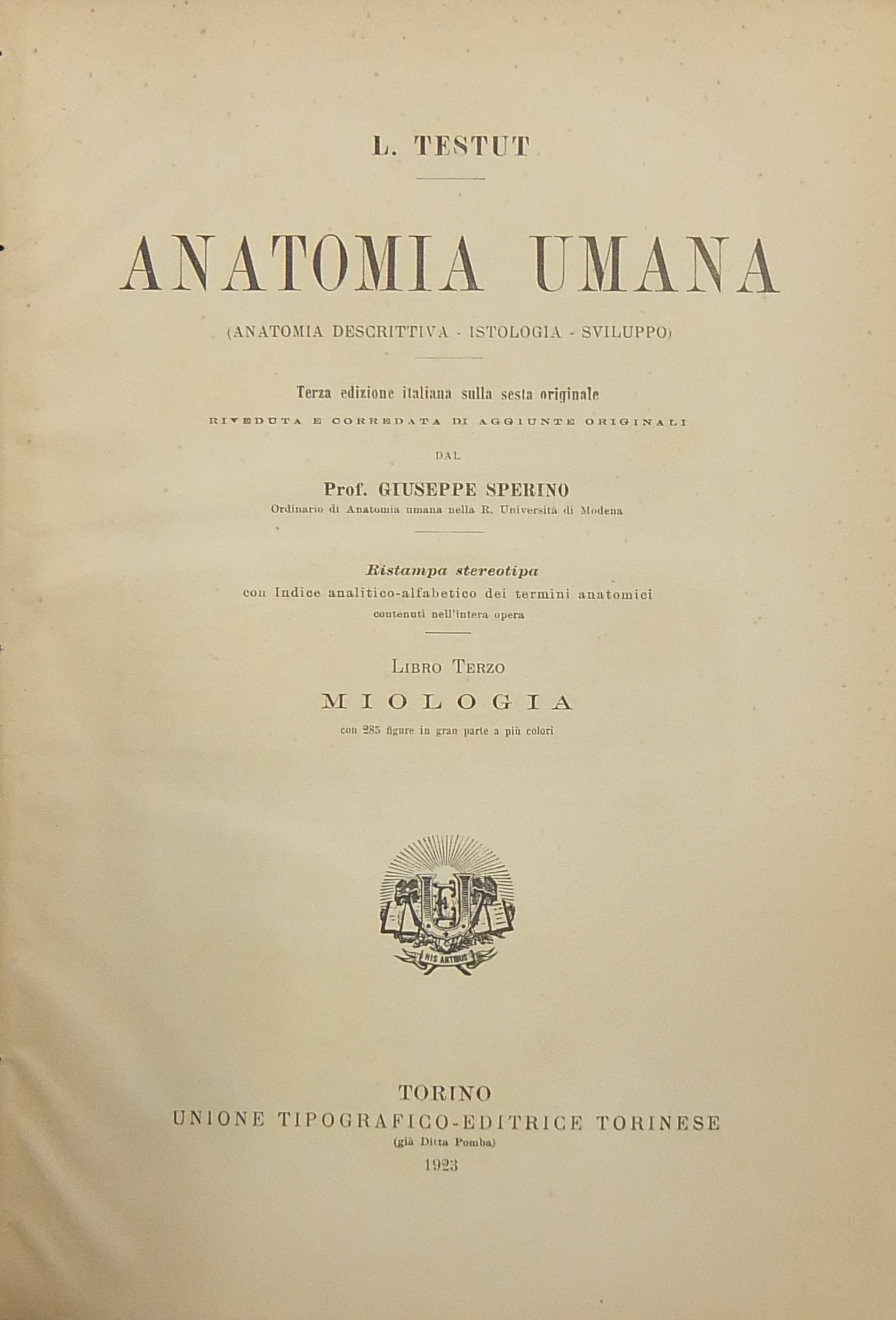 Anatomia umana. Vol. I - Osteologia. Con 417 figure in gran parte a più colori; Vol. II - Artrologia. Con 191 figure; Vol. III - Miologia. Con 285 figure; Vol. IV - Angiologia. Con 343 figure; Vol. V - Sistema nervoso centrale. Con 647 figure; Vol. VI - Sistema nervoso periferico. Con 201 figure; Vol. VII - Organi dei sensi. Con 498 figure; Vol. VIII - Respirazione e fonazione. Con 112 figure; Vol. IX - Apparato della digestione; Vol. X - Ghiandole a secrezione interna. Con 534 figure; Vol. XI - Apparato uro-genitale. Con 474 figure; Vol. XII - Embriologia. Con 90 figure; Indice analitico-alfabetico generale
