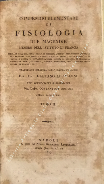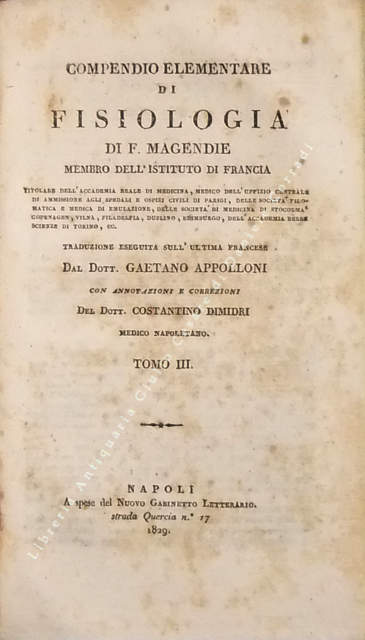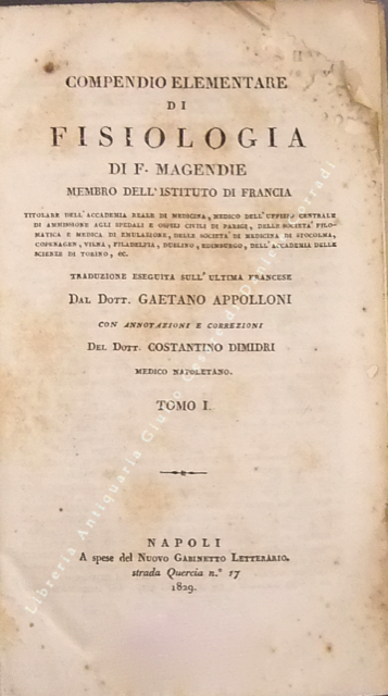 Compendio elementare di fisiologia. Traduzione eseguita sull'ultima francese dal dott. Gaetano Appolloni con annotazioni e correzioni del dott. Costantino Dimidri