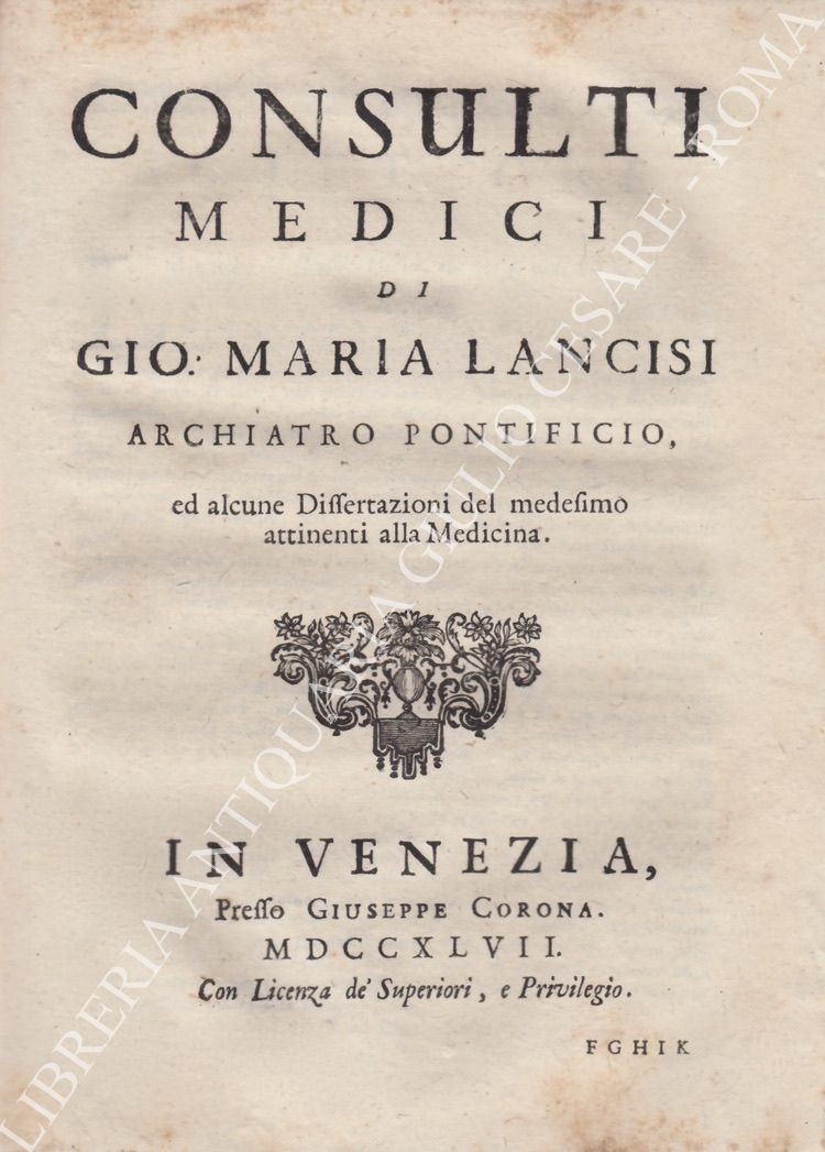 Consultationum medicarum. Nonnullarumque dissertationum collectio, ante hac plurimum desiderata, nunc denique in lucem edita, & publicae utilitati donata; UNITO A: Gio: Maria Lancisi - Consulti medici ed alcune dissertazioni del medesimo attinenti alla medicina