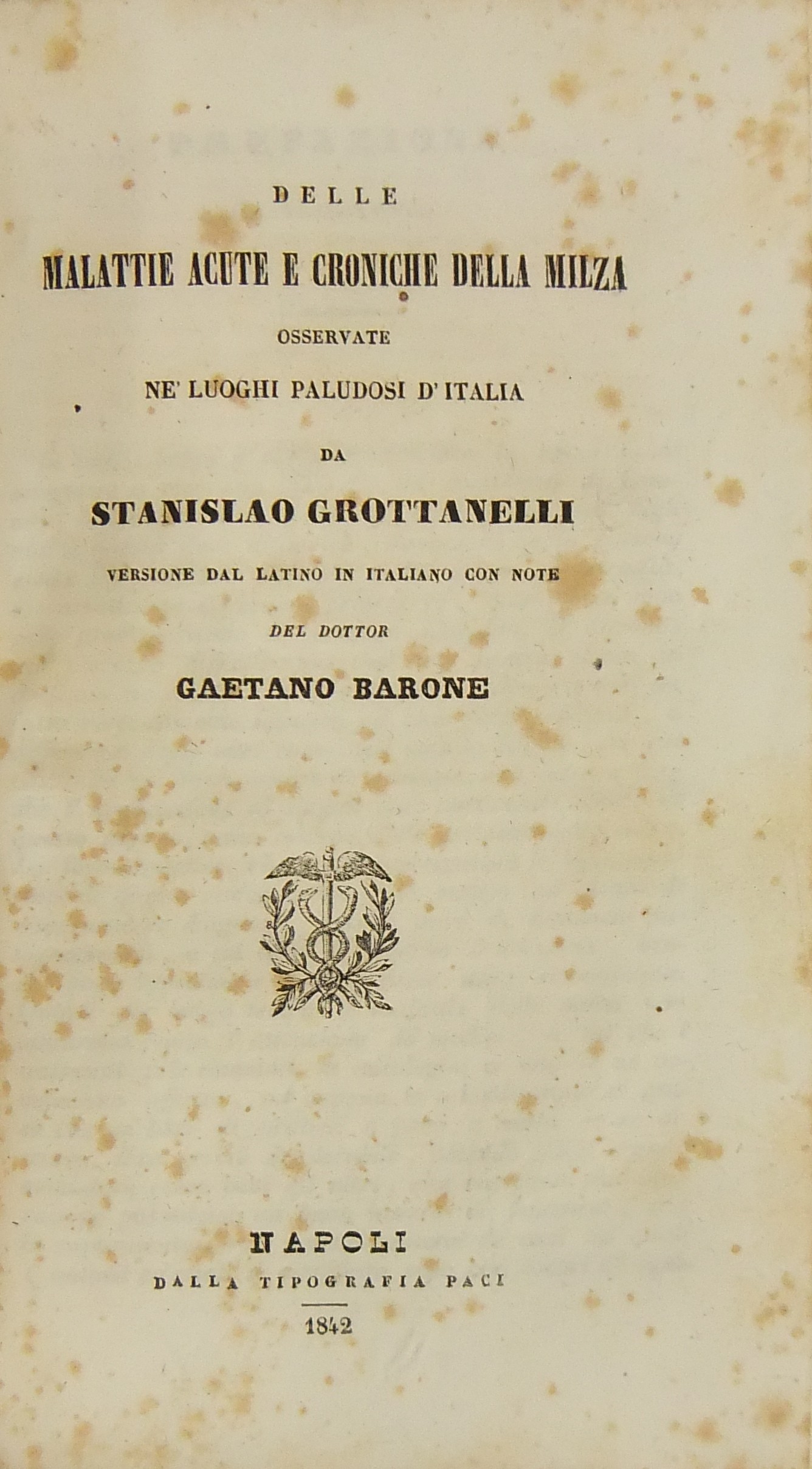 Del tifo contagioso con alcune considerazioni sul modo di arrestare o totalmente estinguere la peste bellica ed altre contagioni dell'uomo. Trattato del sig. Giovanni Valentino da Hildebrand.. Versione Italiana sulla seconda edizione tedesca corretta ed accresciuta dall'Autore pe' dottori in medicina Gregorio Althamer e Giovambatista Berti. UNITO A: Stanislao Grottanelli - Delle malattie acute e croniche della milza osservate ne' luighi paludosi d'Italia. Versione del latino in italiano con note del dottor Gaetano Barone. Napoli ,Tipografia Paci, 1842, pp. 139