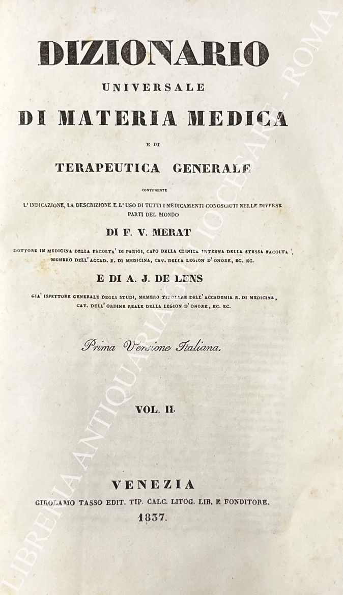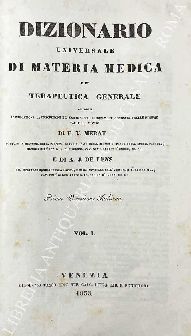 Dizionario universale di materia medica e di terapeutica generale contenente l'indicazione, la descrizione e l'uso di tutti i medicamenti conosciuti nelle diverse parti del mondo. Prima versione italiana