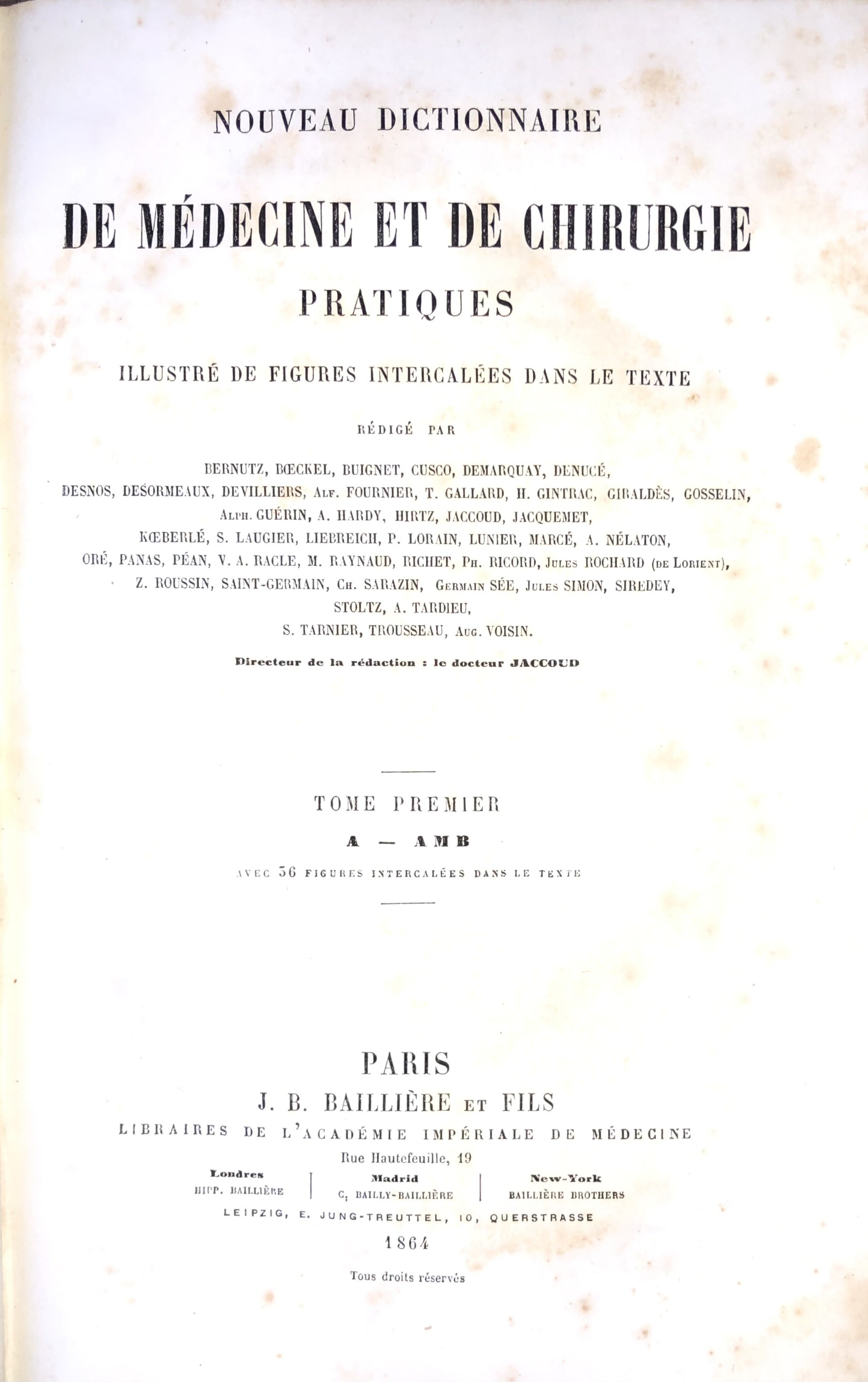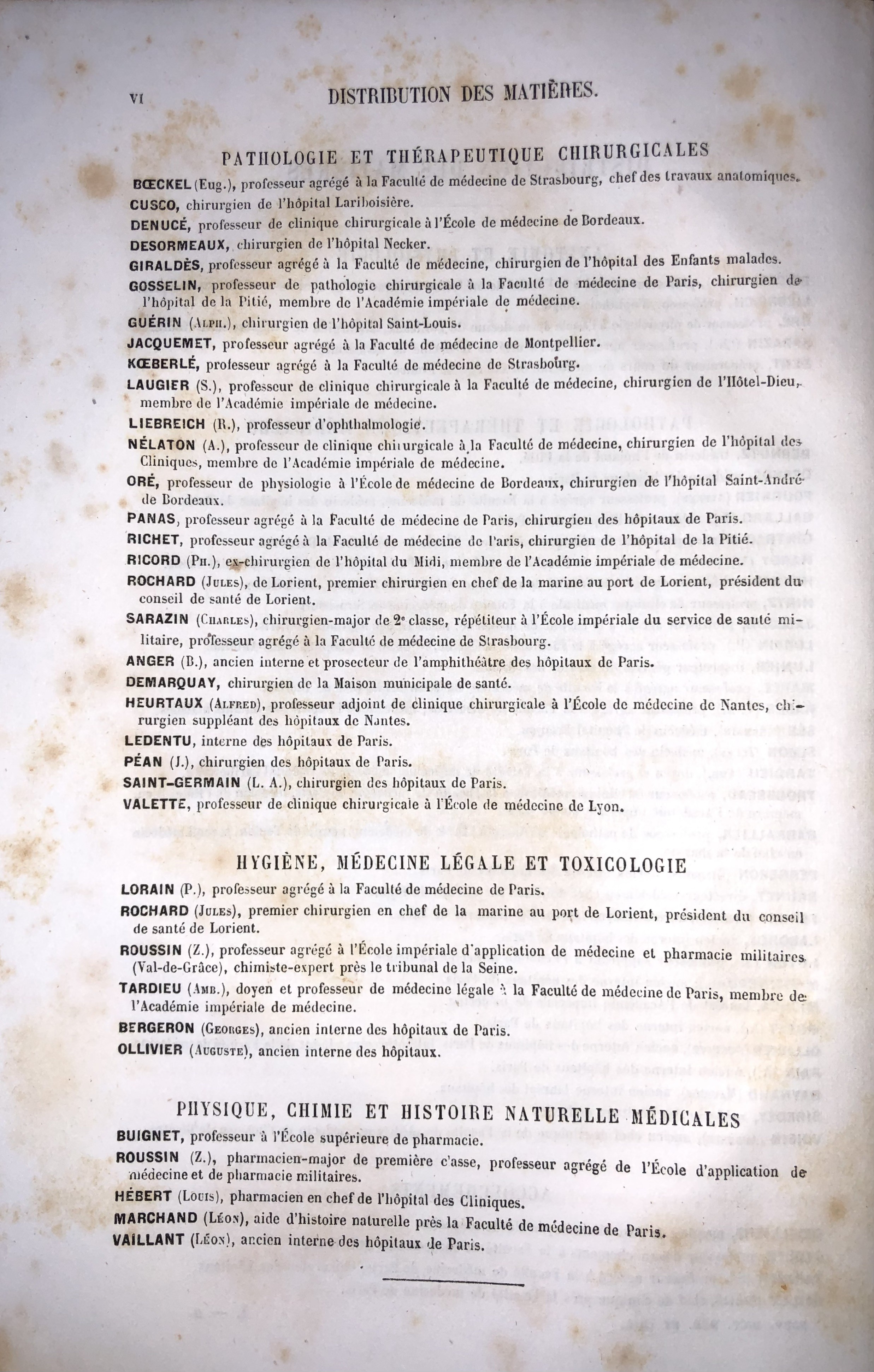 Scritti di: Anger, Bailly, Barrallier, Bernutz, Bert, Boeckel, Buignet, Cusco, Demarquay, Denucé, Desormeaux, Després, Devilliers, Duval, Fernet, Fournier, Foville, Gallard, Gintrac, Gombault, Gosselin, Guérin, Hardy, Héraud, Heurtaux, Hirtz, Jaccoud, Jacquemet, Jeannel, Koeberlé, Lannelongue, Ledentu