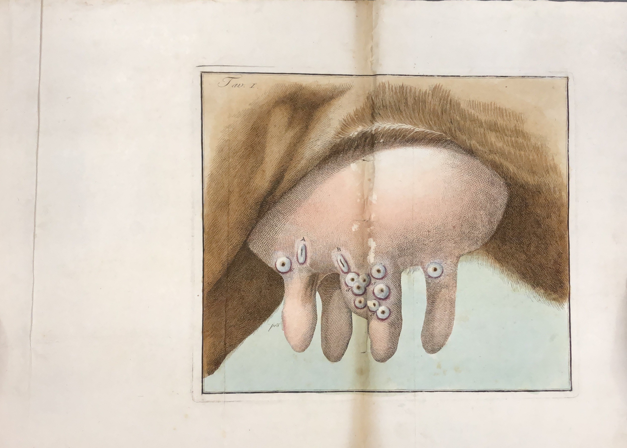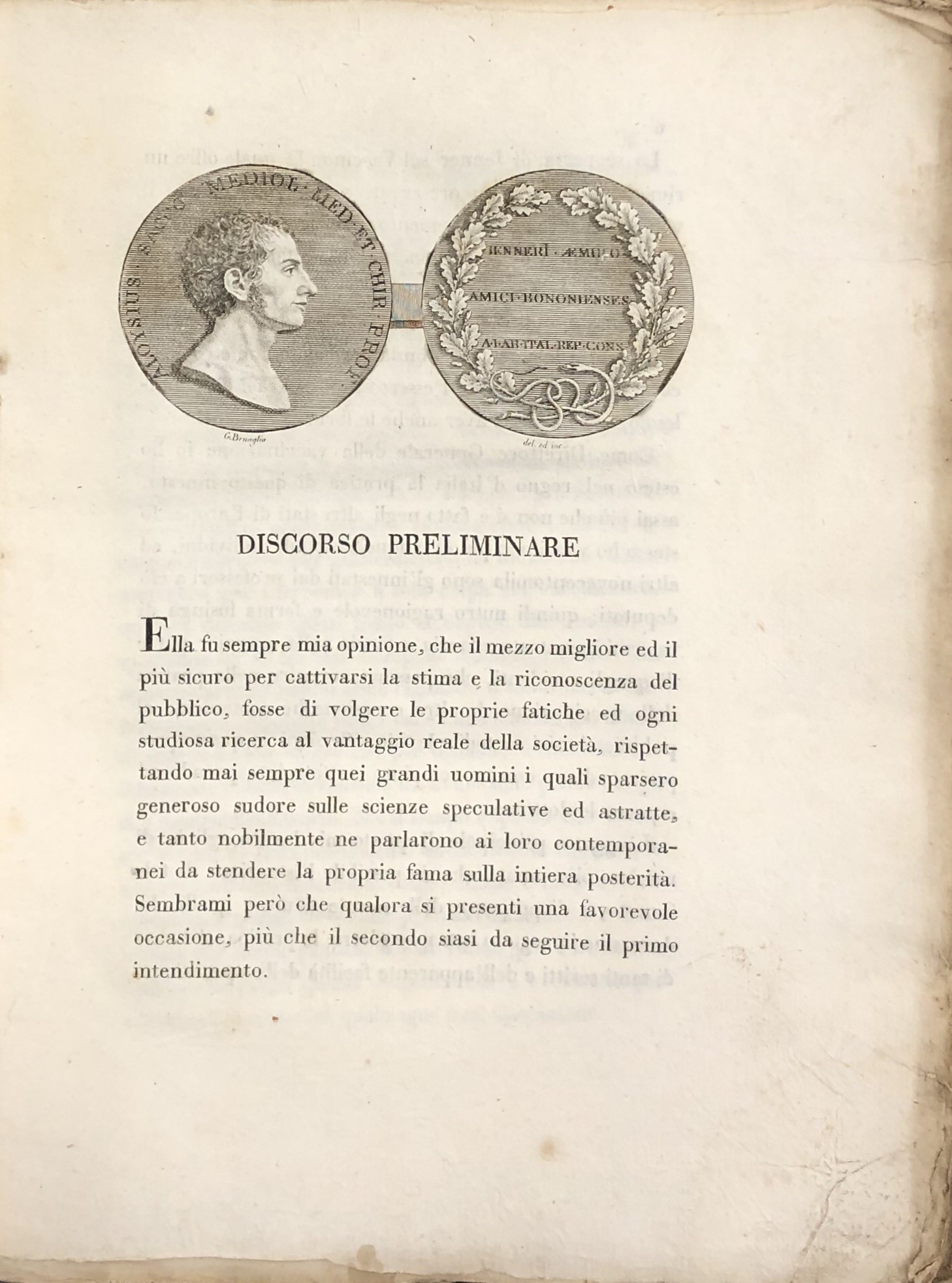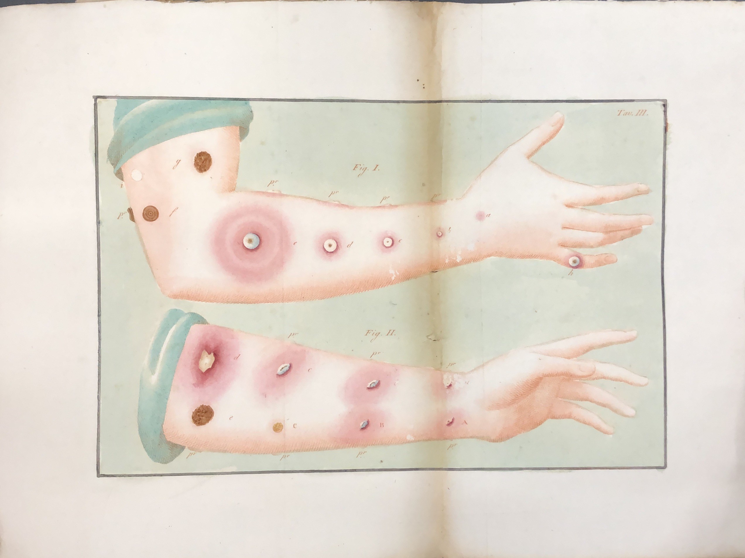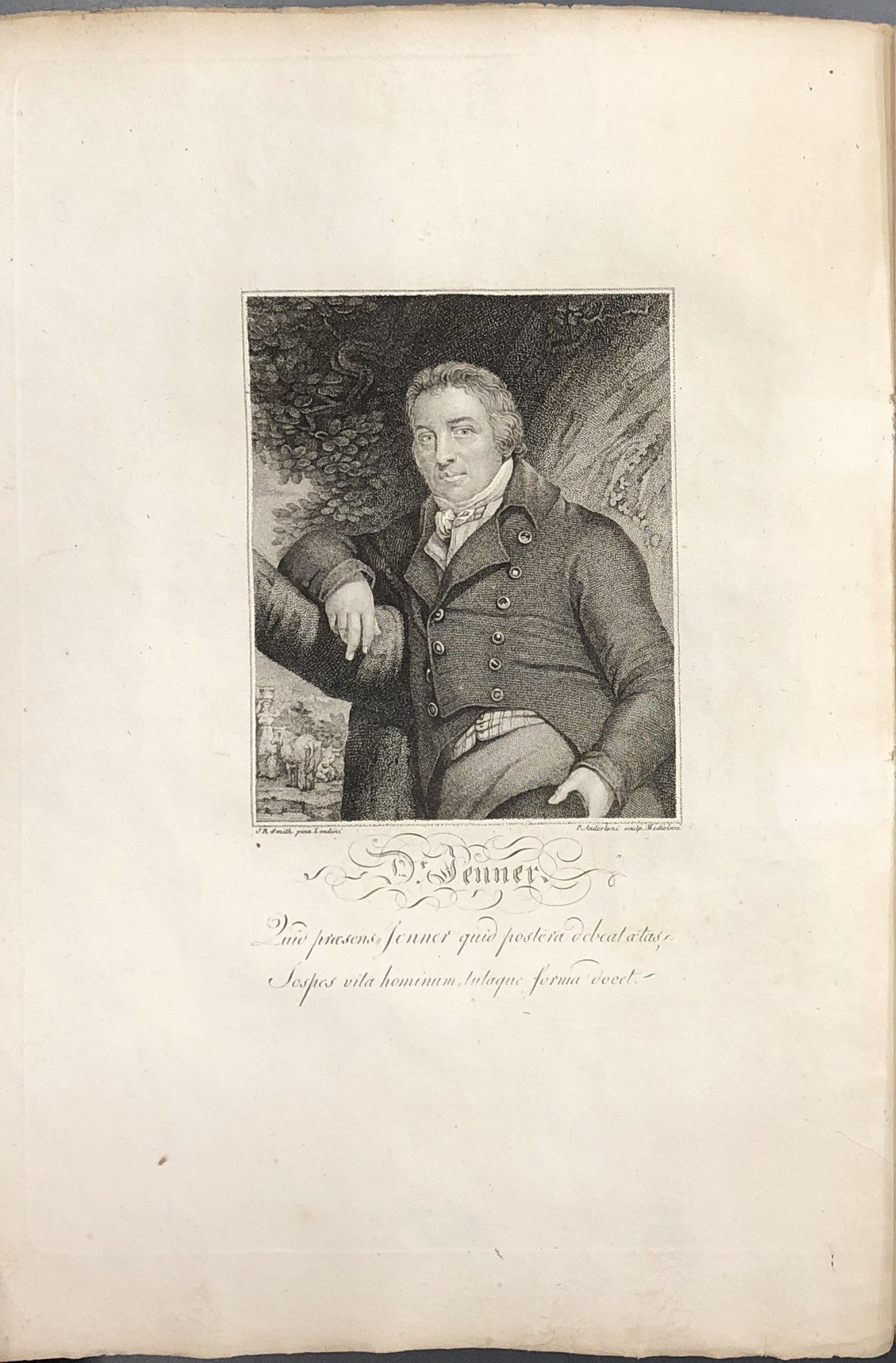 Ritratto inciso da Anderloni raffigurante E. Jenner a inizio opera e 4 tavole ripiegate fuori testo incise in rame e colorate a mano. Bella marca tipografica incisa da Bordigna. Altra incisione di Benaglia raffigurante il ritratto dell'Autore prima del discorso preliminare