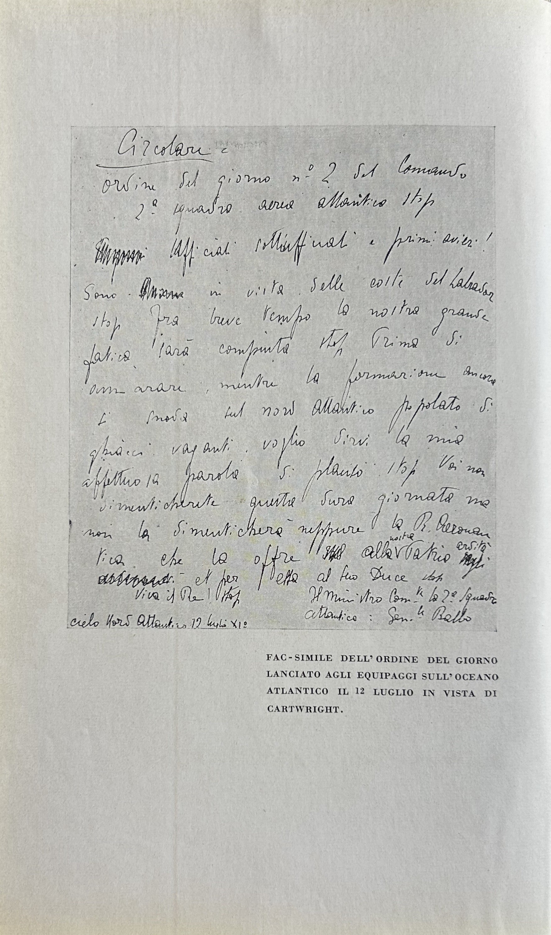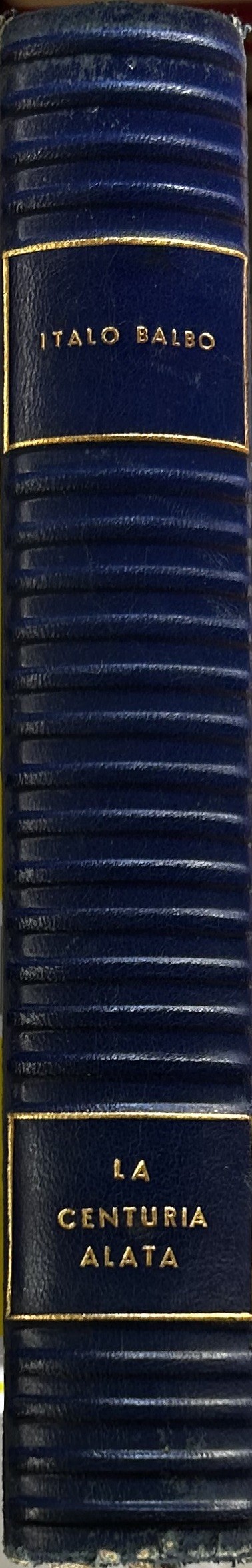 Edizione di lusso con stupenda rilegatura in pelle e taglio superiore oro. L'opera contiene 48 tavole fotografiche a piena pagina, una tavola ripiegata rafigurante l'itinerario della crociera e il facsimile dell'ordine del giorno lanciato agli equipaggi sull'oceano Atlantico il 12 luglio in vista di Cartwright