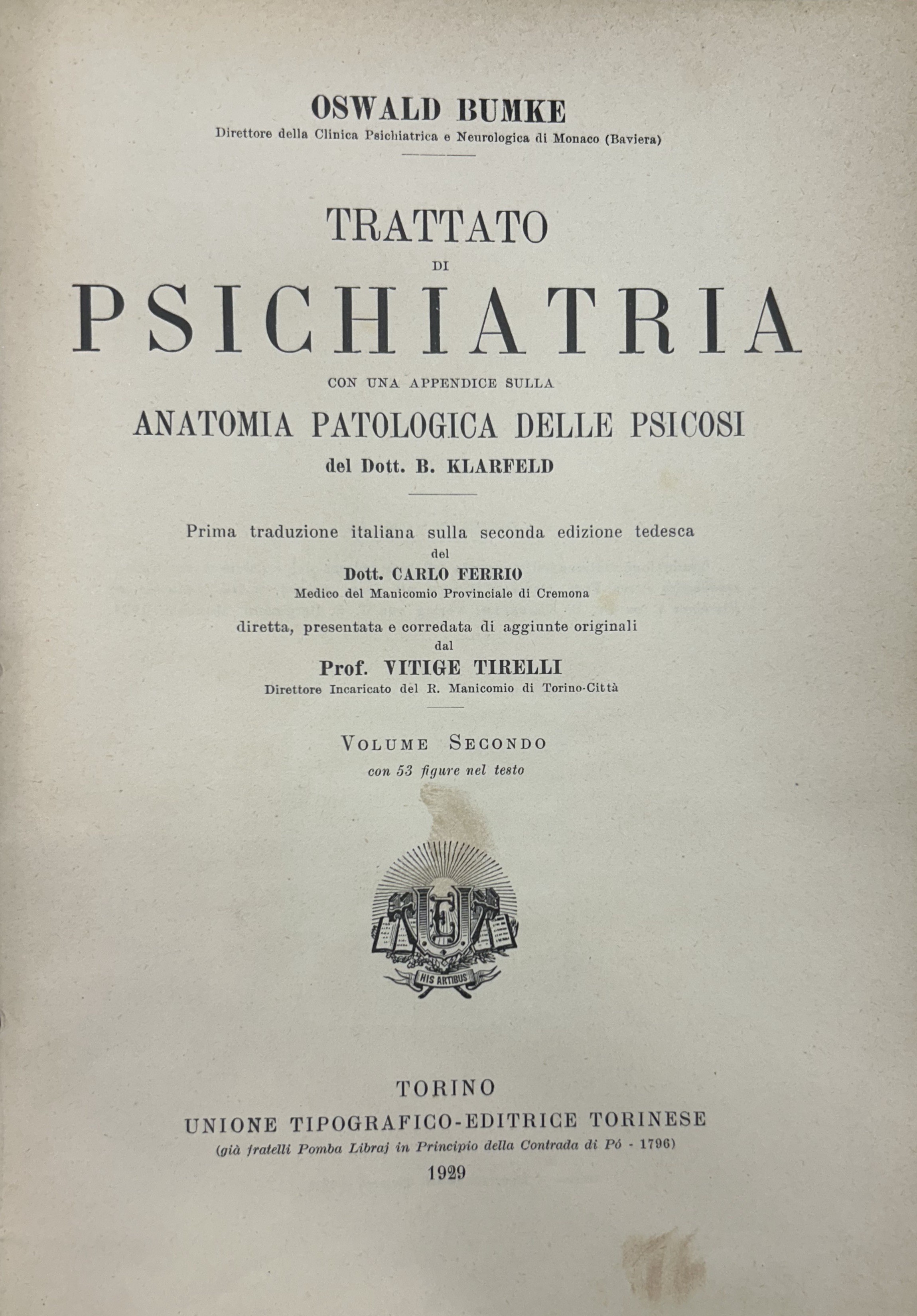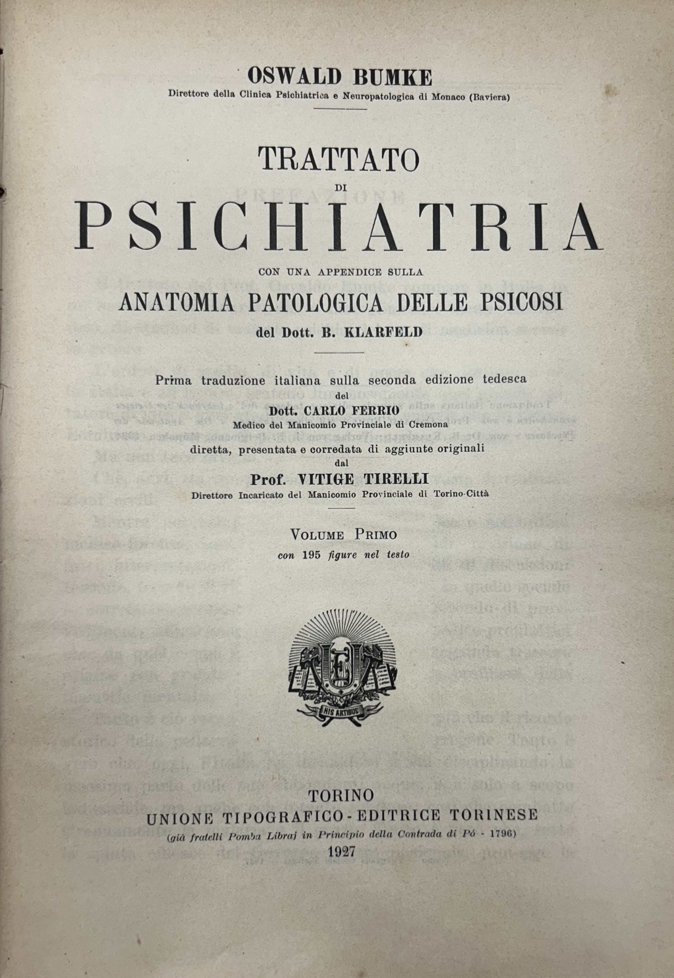 Trattato di psichiatria. Con una appendice sulla anatomia patologica delle psicosi del Dott. B. Klarfeld. Prima traduzione italiana sulla seconda edizione tedesca del Dott. Carlo Ferrio diretta, presentata e corredata di aggiunte originali dal Prof. Vitige Tirelli. Vol. I con 195 figure nel testo; Vol. II con 53 figure nel testo