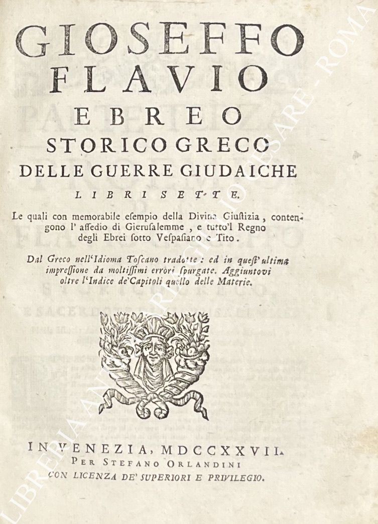 Gioseffo Flavio ebreo storico greco. Delle antichità e guerre giudaiche. Libri XXVII divisi in tre Parti: Nella prima, si tratta della creazione del Mondo fino alla guerra di Sennacherib; Nella seconda, del tornare che fecero i Giudei in Gerusalemme, fino alla discordia fra li Giudei e i Filadelfi; Nella terza, delle guerre ch'ebbero gli Ebrei con li Romani. Tradotto in Lingua Italiana per M. Pietro Lauro Modonese. UNITO A: Delle guerre giudaiche, Libri sette. Le quali con memorabile esempio della Divina Giustizia, constengono l'assedio di Gierusalemme, e tutto'l Regno degli Ebrei sotto Vespasiano e Tito