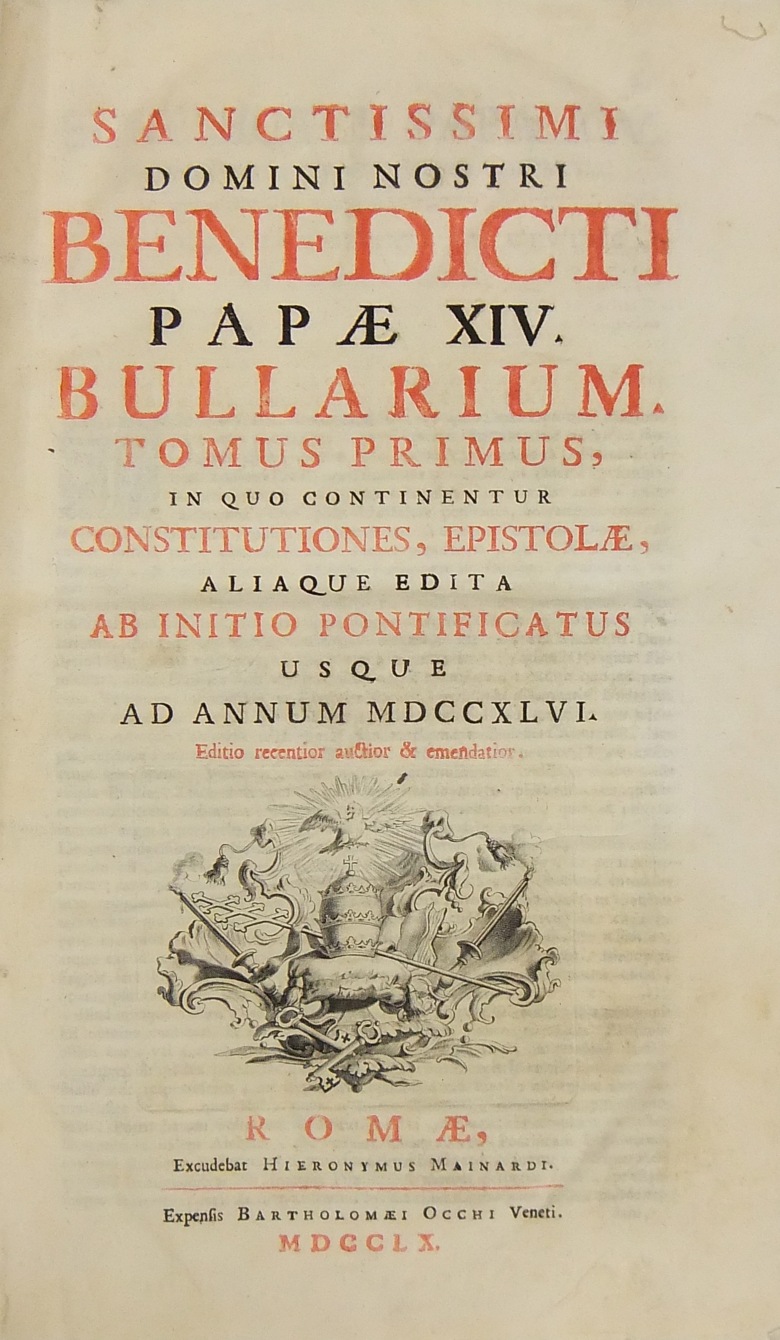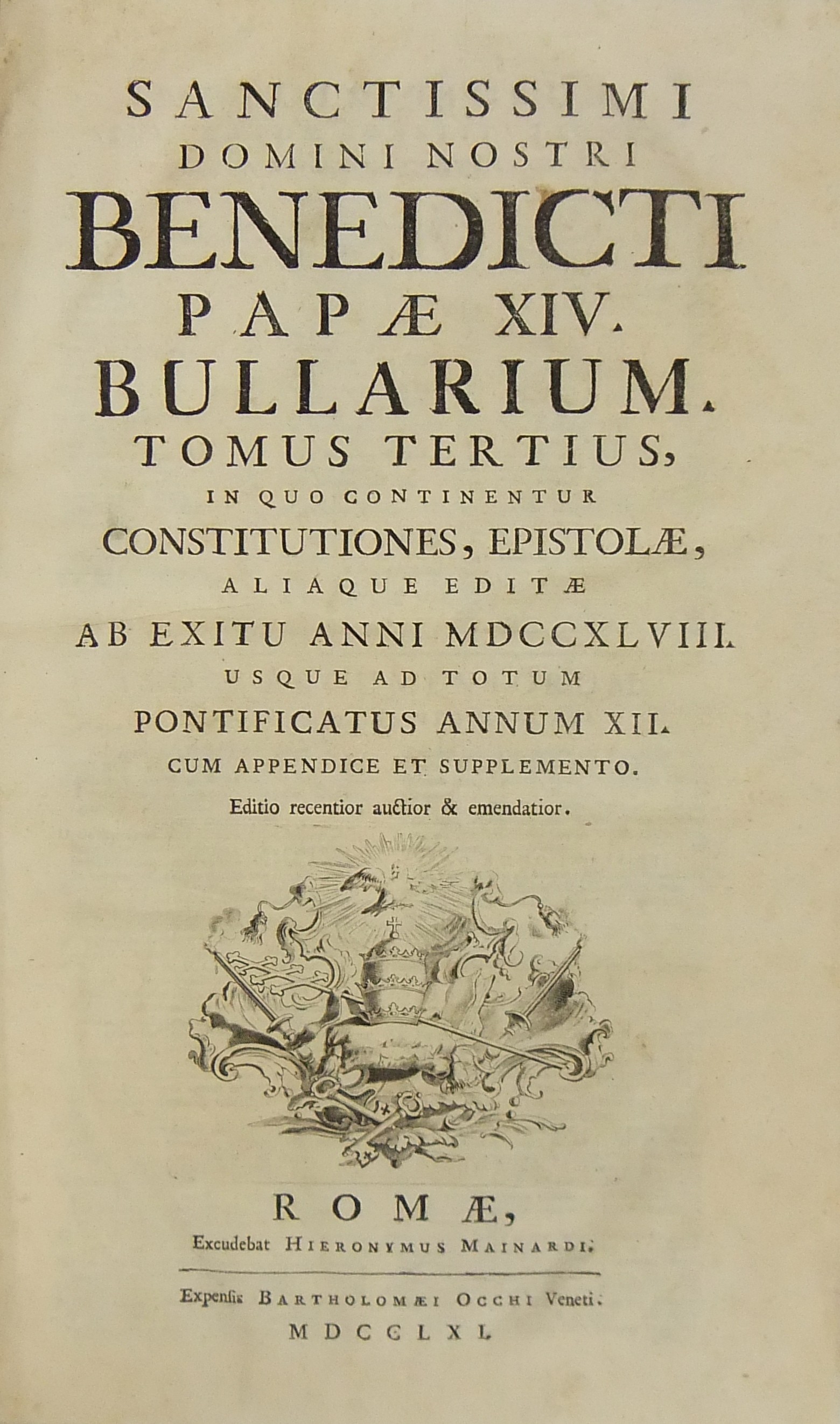 Sanctissimi Domini Nostri. Bullarium. Tomus primus, In quo continentur Constitutiones, Epistolae, aliaque edita ab initio pontificatus usque ad annum 1746. Tomus secundus, In quo continentur Constitutiones, Epistolae, aliaque editae ab anno 1746 usque ad totum annum 1748. Tomus tertius, In quo continentur Constitutiones, Epistolae, aliaque editae ab exitu anni 1748 usque ad totum pontificatus annum XII, cum appendice et supplemento. Tomus quartus, In quo continentur Constitutiones, Epistolae & c. editae ab initio anni XIII pontificatus usque ad totum ejusdem pontificatus annum XVII cum appendice