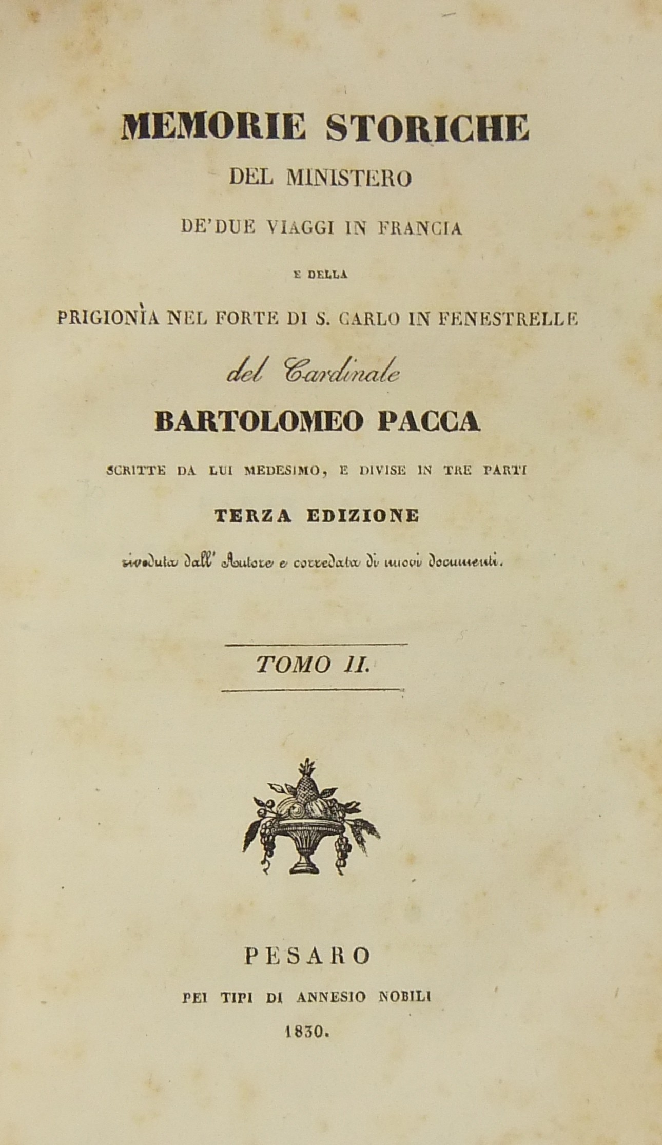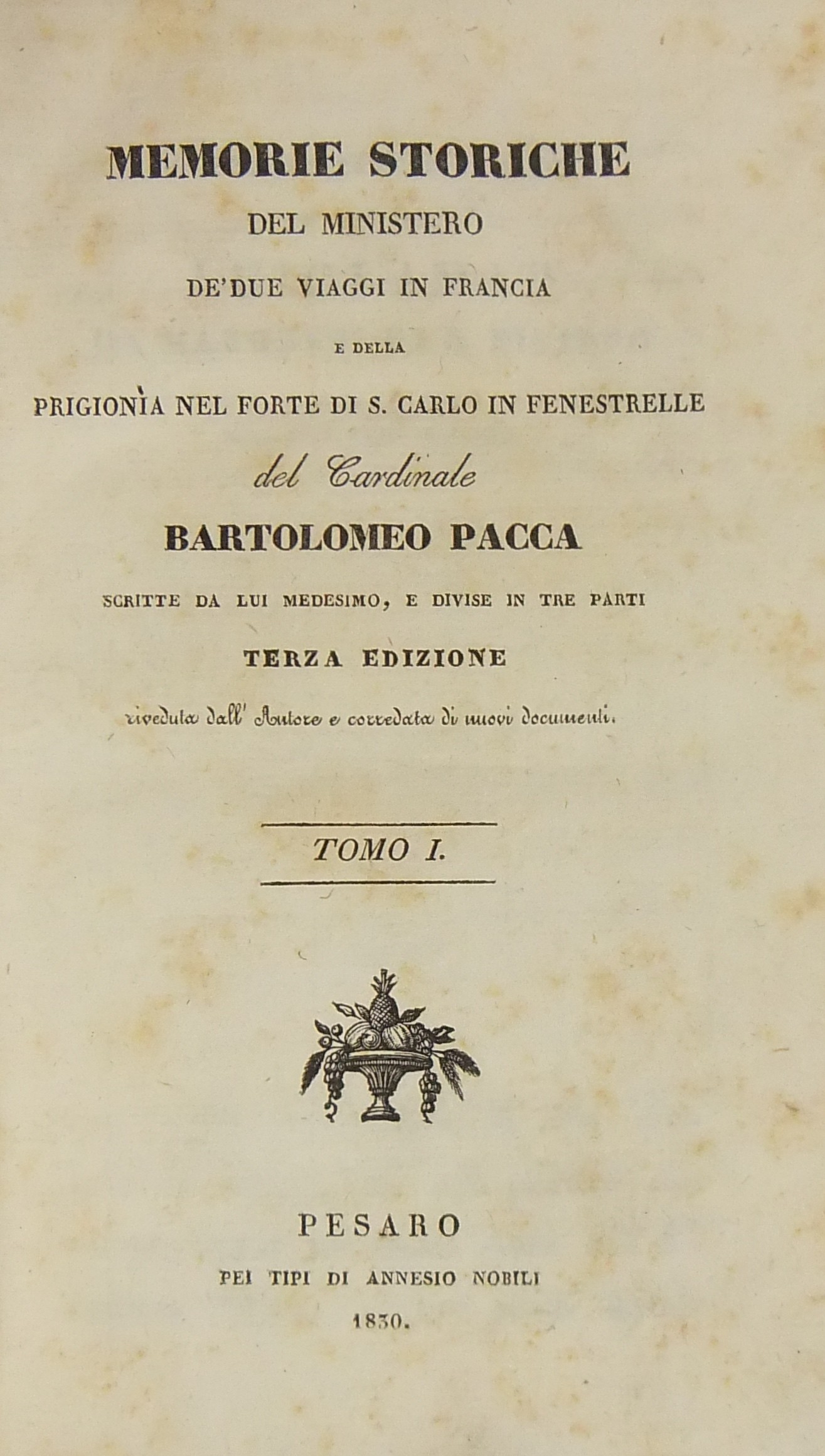 Memorie storiche del ministero de' due viaggi in Francia e della prigionia nel forte di S. Carlo in Fenestrelle del cardinale Bartolomeo Pacca scritte da lui medesimo e divise in tre parti