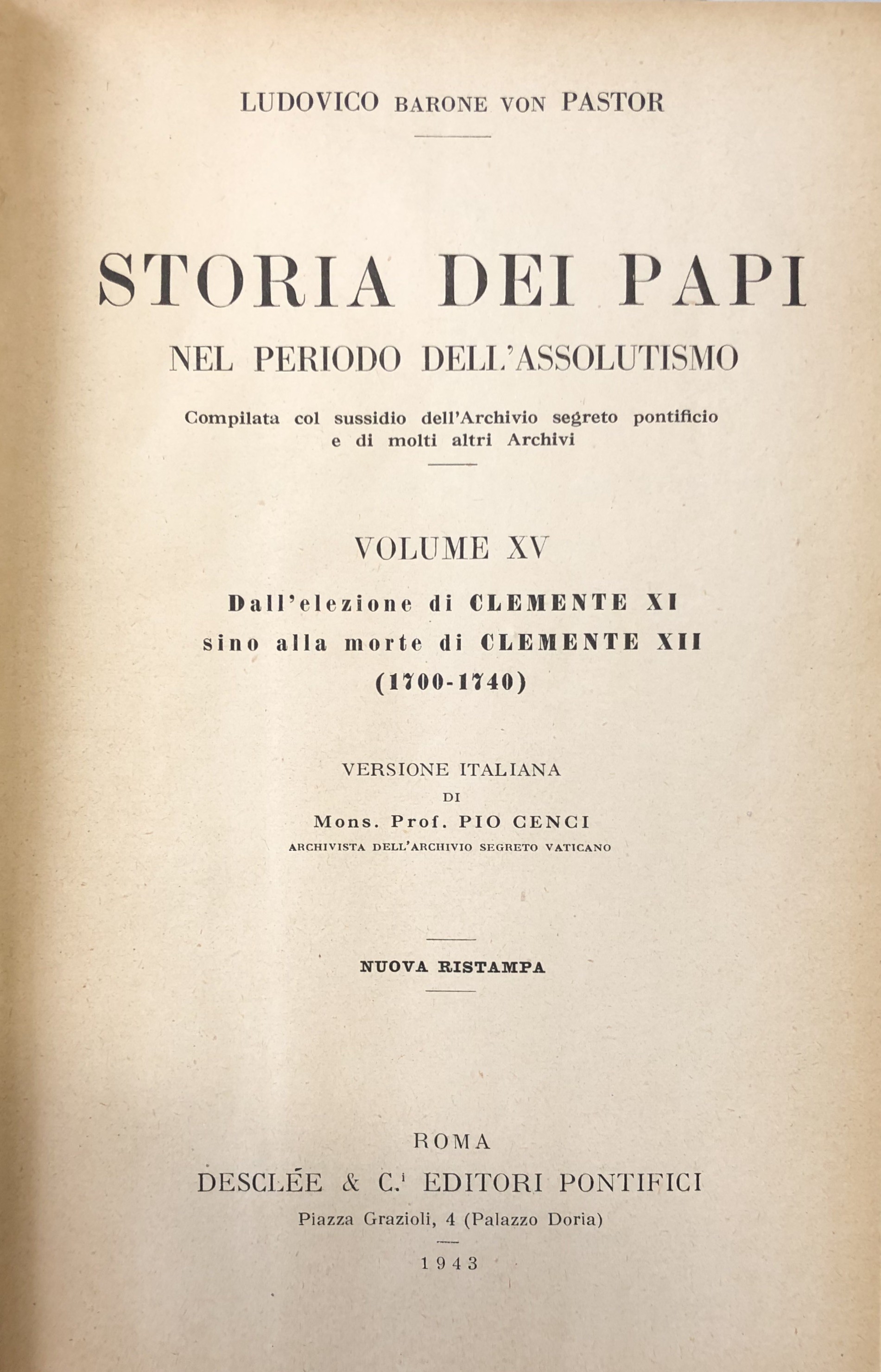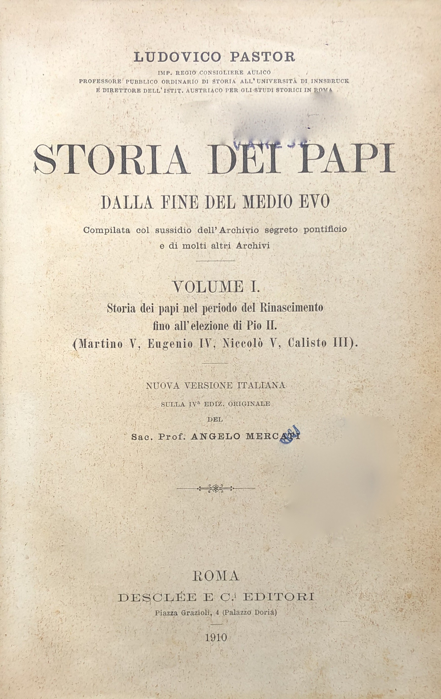 Storia dei papi dalla fine del Medio Evo. Compilata col sussidio dell'Archivio segreto pontificio e di molti altri Archivi. Nuova versione italiana sulla quarta edizione originale di Mons. Prof. Angelo Mercati. Vol. I-XII; Vol. XIV-XV e supplemento ai volumi I-III