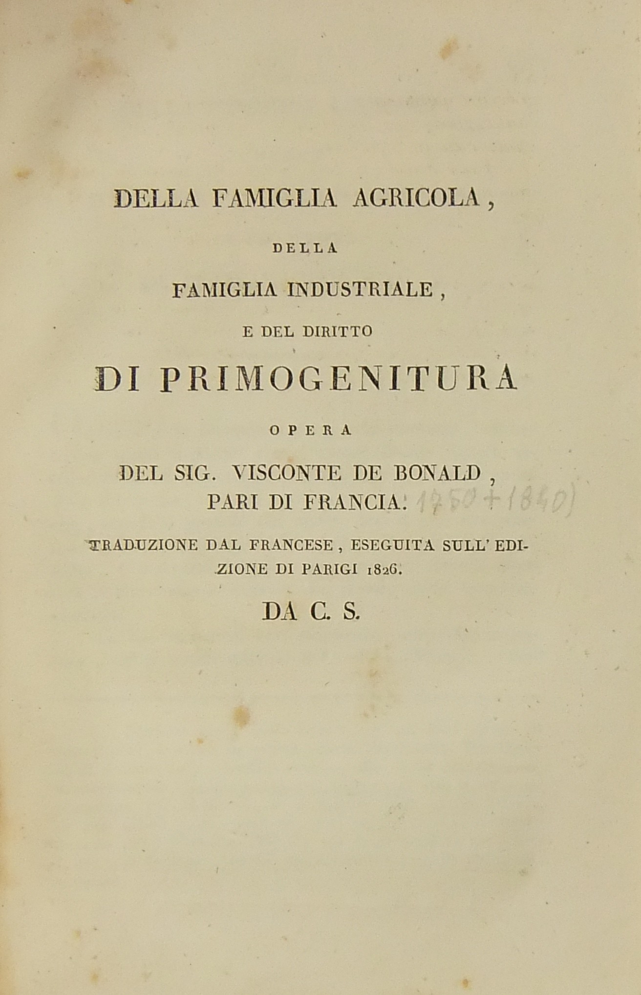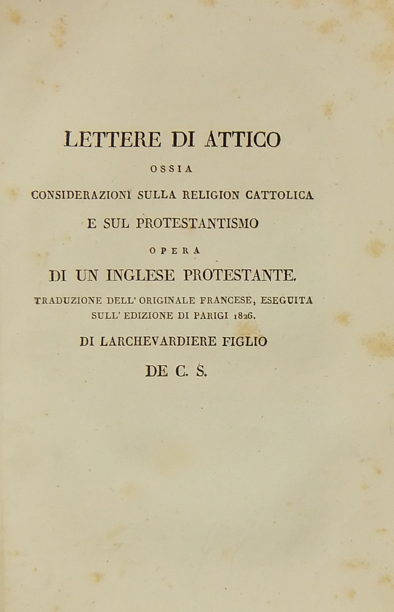 Sui ritardi della giustizia divina nella punizione dei colpevoli. Opera di Plutarco novellamente tradotta in francese con aggiunte e note. UNITO A: Lettere di Attico ossia considerazioni sulla religione cattolica e sul protestantismo opera di un inglese protestante. Traduzione dell'originale francese eseguita sull'edizione di Parigi 1826. Di Larchevardiere figlio. (pp. 42). UNITO A: Della famiglia agricola della famiglia industriale e del diritto di primogenitura opera del sig. Visconte De Bonald pari di Francia. Traduzione dal francese eseguita sull'edizione di Parigi 1826. Da C. S. (pp. 33)