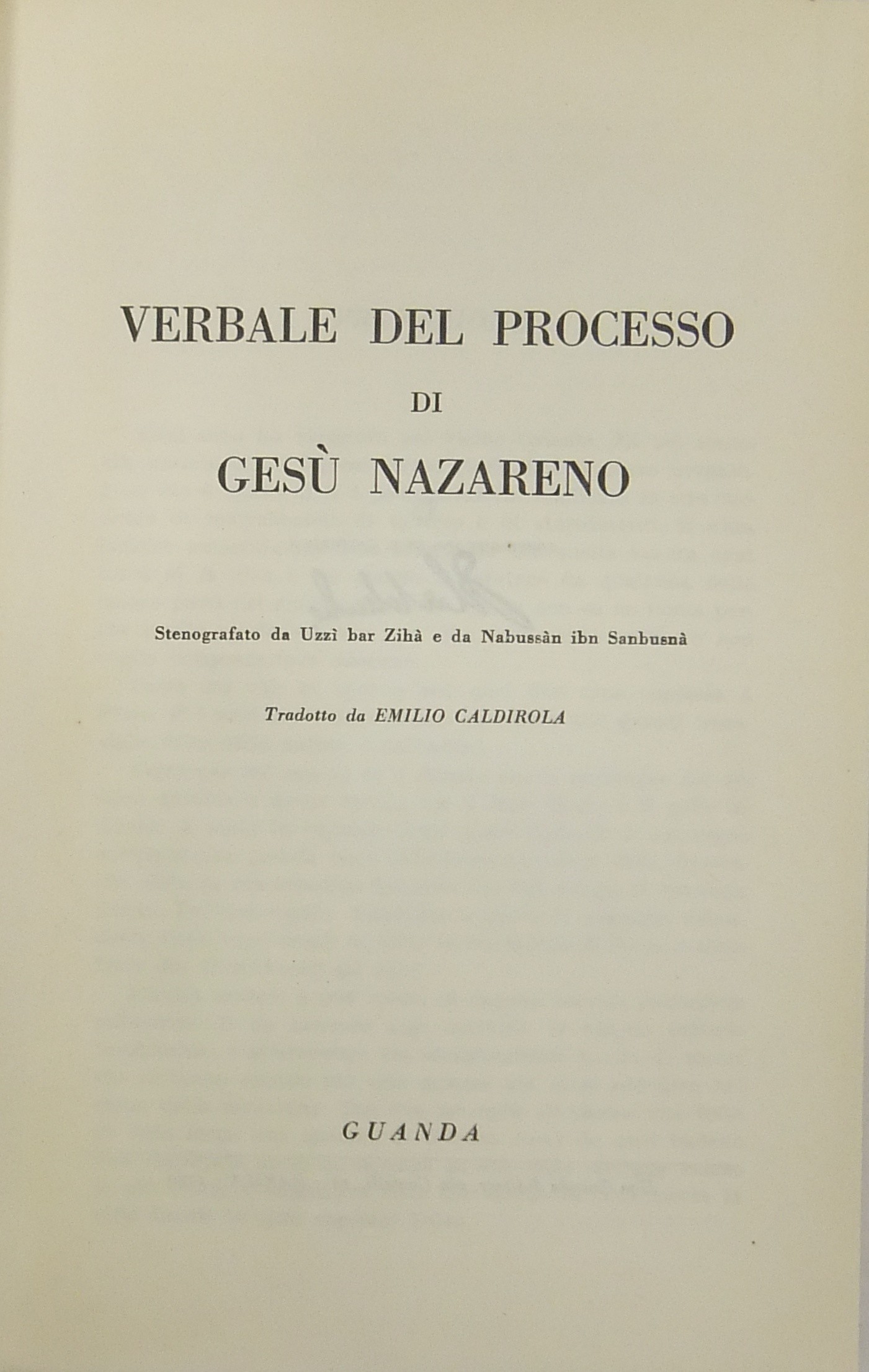 Verbale del processo di Gesù Nazareno. Stenografato da Uzzì bar Zihà e da Nabussà n ibn Sanbusnà . Tradotto da Emilio Caldirola