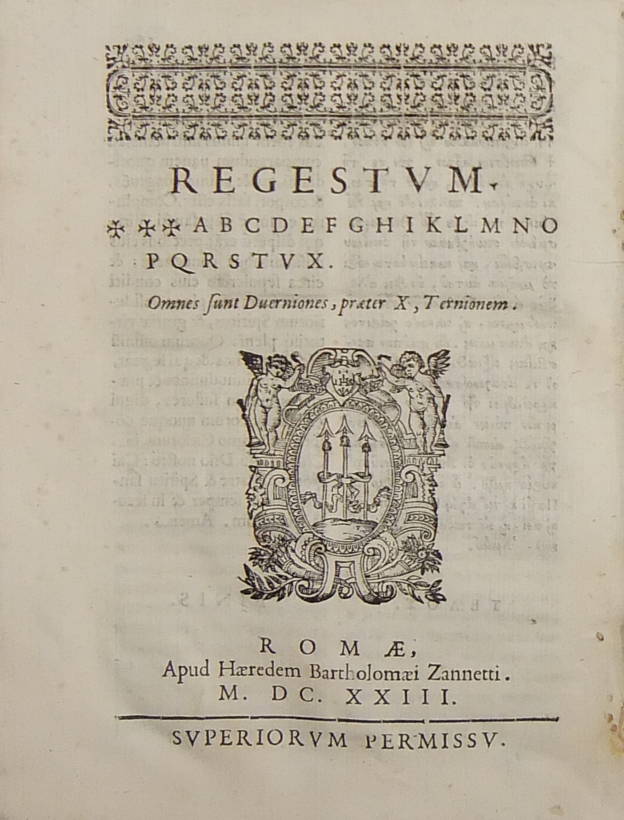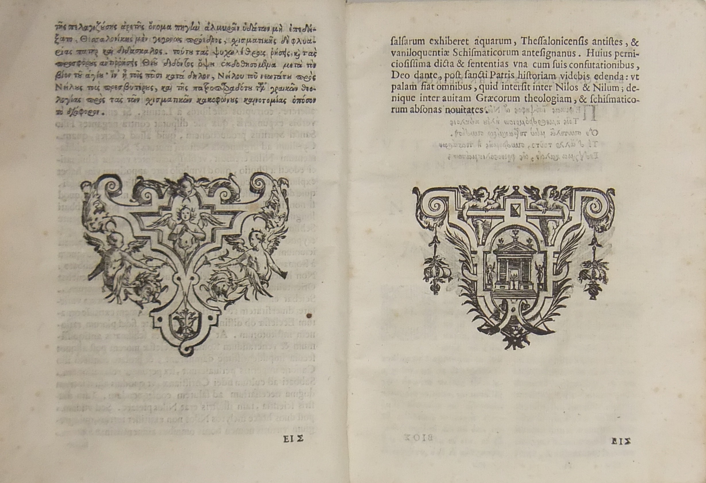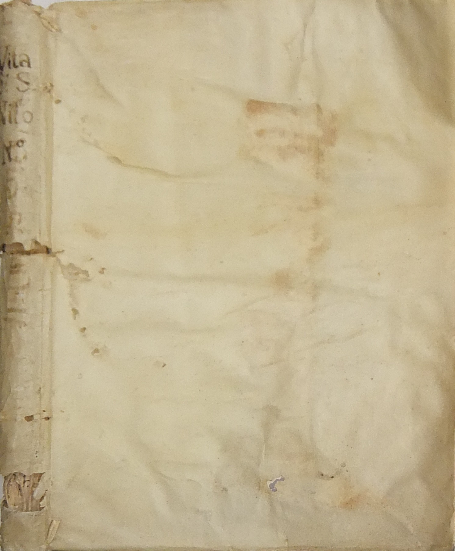 Si tratta della vita di San Nilo abate, fondatore della Badia di Grottaferrata scritta da San Bartolomeo suo discepolo. Stemma calcografico di Urbano VIII al frontespizio. Testo greco e latino su due colonne, testatine e capilettera xilografati. Marca xilografica in fine con tre lance in palo unite da un nastro in una cornice figurata. In alto al centro in un ovale, monogramma IHS con la croce e i chiodi della Passione