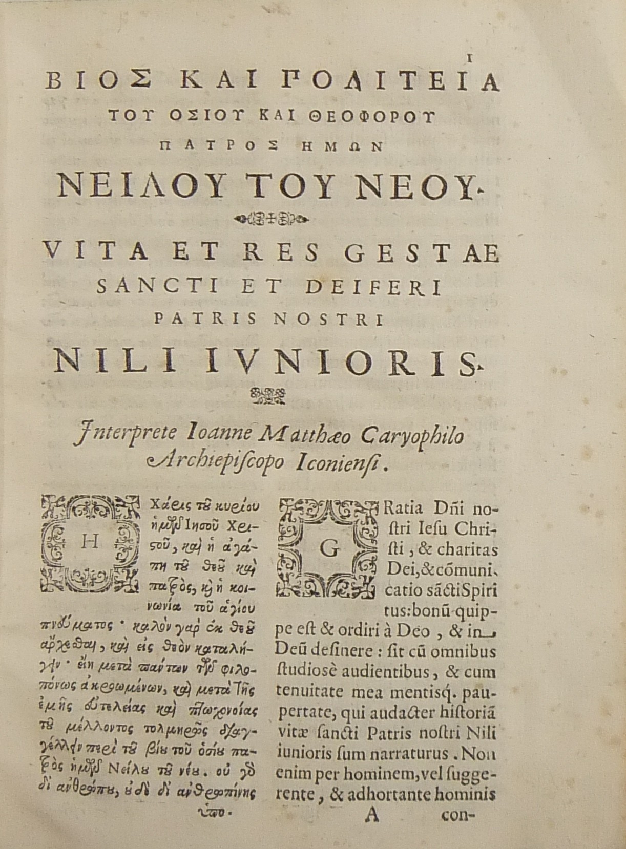 Vita S. Patris Nili iunioris scripta olim Gaece a contubernali eius discipulo. Nunc latinitate donata interprete Io. Matthaeo Caryophilo archiepiscopo Iconiensi