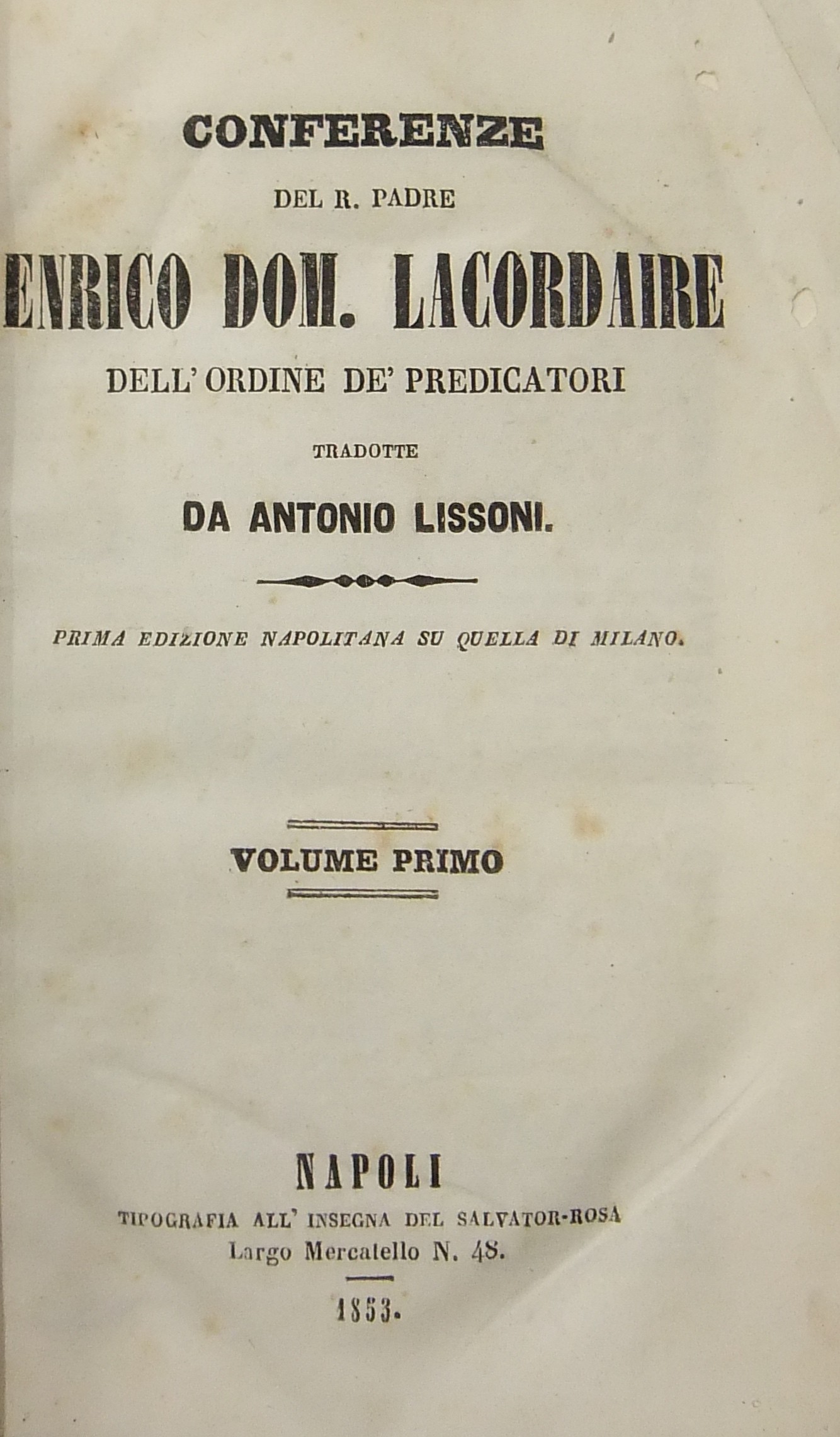 Conferenze del R. Padre Enrico Dom. Lacordaire dell'ordine dei predicatori tradotte da Antonio Lissoni. Prima edizione napolitana su quella di Milano