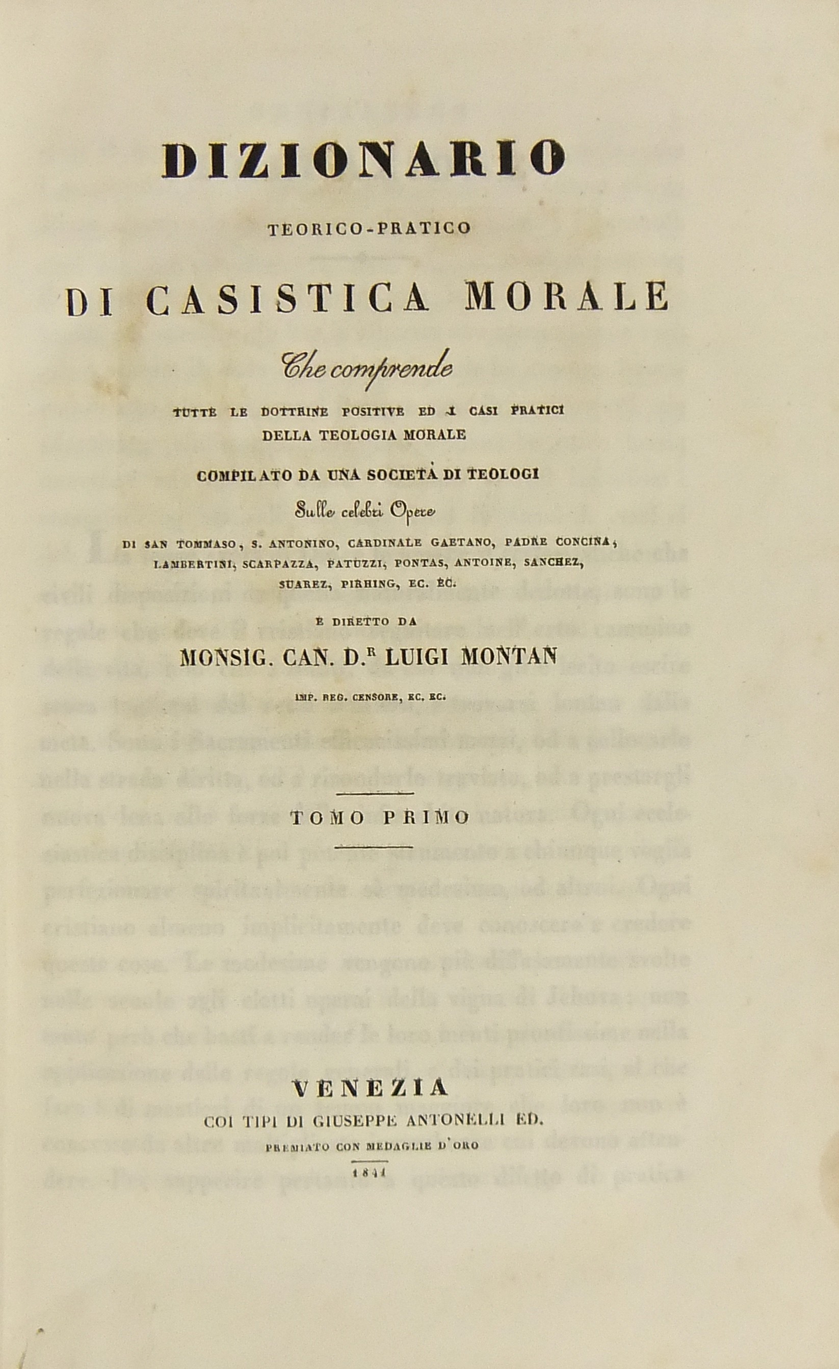 Dizionario teorico-pratico di casistica morale. Che comprende tutte le dottrine positive ed i casi pratici della teologia morale. Compilato da una società di teologi.. e diretto da Mons. Luigi Montan